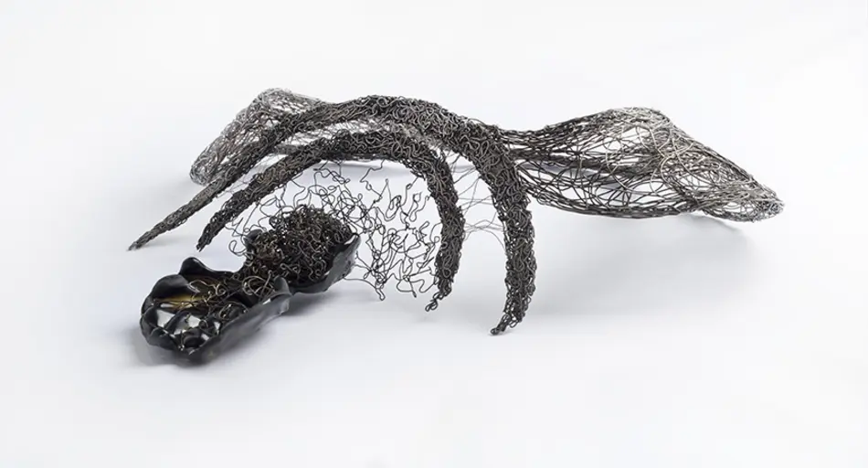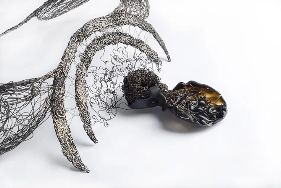 "Since the theoretical part of my thesis was devoted to the traumatic past and its residual impact on human consciousness, as well as ways to overcome it, I will start with a fairy tale. In Russian fairy tales, a repetitive motive can be traced, demanding, in search of compensation for lost happiness, 'wear iron boots. "This is a symbol of the trials that the hero must go through. For example, Psyche was forced to wander for a long time and carry out the orders of Aphrodite in order to restore the destroyed world of her happiness. Because I wrote mostly about my country, I decided to be guided by the Russian pattern, which instructs the fairy-tale hero to wear iron boots. That is why I chose steel and iron as my main work, and glass is present here as a symbol of the plasticity and fragility of the emotional sphere, which, when frozen, can preserve the consequences of trauma for a long time.