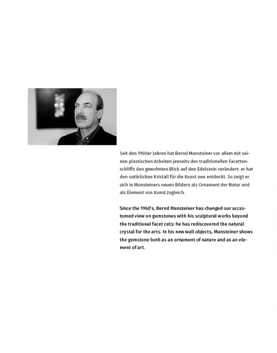 Die Ausstellung zeigt eine Werkgruppe zweier Künstler der Edelsteinregion, deren Werk den Umgang mit dem Material Edelstein in der Gegenwartauf neue Füße gestellt und durch seine Singularität durchaus beeinflusst hat. Dies gilt, auch wenn das Echo gerade in der Edelsteinbranche der Heimatregion, der sich beide trotz allem internationalen Erfolg verbunden fühlten, eher bescheiden blieb. Zwar handelt es sich bei den Exponaten beider Künstler um abstrakte Bilder. Doch verfolgen beiden völlig unterschiedliche und sogar kontrastierende künstlerische Ziele und Strategien. Um meine Texte in den Katalogen zur Ausstellung nicht zu doppeln – ich führe dort in zwei autonome Werke ein – will ich Ihnen kurz die unterschiedlichen Arbeitsansätze der beiden skizzieren, auch in der Hoffnung, sie für den Kauf des Doppelkatalogs zu motivieren. Bernd Munsteiners Thema ist das mineralische, kristalline Material selbst. In seinem Lebenswerk hat er sich auf unterschiedliche Weise bemüht, zum Wesen des natürlichen Minerals und zu seiner ihm eigentümlichen ästhetischen Qualität vorzudringen. Auch wenn dies in seinen letzten Bildern nur noch in einer dreieckförmigen Textur aufscheint, verfolgt er dieses Ziel auch in den aktuellen Bildern wie bereits in seinen Arbeiten mir transluziden Steinen. Während Munsteiner im dreidimensionalen luziden Kristall Natur als ästhetischen Erlebnisraum sichtbar macht, montiert er im zweidimensionalen Bild, in der „Kartusche“ eines dreieckigen Flächenelements, die nochmals auf sich selbst reduzierte Botschaft des Materials – und macht sie gleichzeitig durch die durch die Montage zu einem künstlerischem „commesso“ zum Element eines Tableaus, das das Ereignis des Materials dem Betrachter optisch erschließt. Sein Projekt wendet sich gegen die verdinglichende Unterwerfung der Natur durch technische Mittel. Vielmehr bringt er Natur im Werk zum Vorschein. Bernd Munsteiners Bilder werden damit gewissermaßen zur geistigen und künstlerischen Quintessenz seines Lebenswerks, ein subtiles Zeugnis seines lebenslangen geistigen Durchdringens des Materials und seiner tradierten Bearbeitungstechniken und der gleichzeitig praktischen Dokumentation einer sich täglich aufs Neue generierenden Entdeckungsreise zum Material der Natur, zu ihrem Gegenstand durch und in der Kunst.