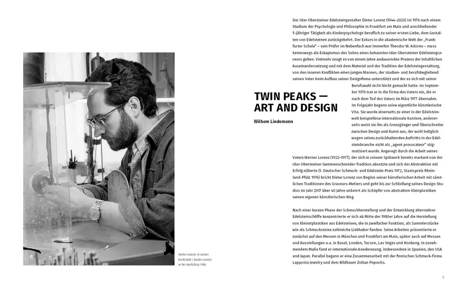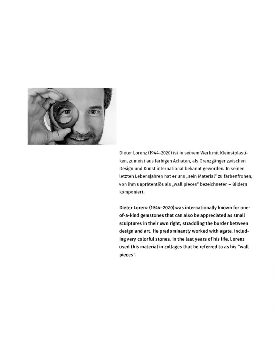 Auf den ersten Blick scheint Dieter Lorenz sehr viel leichtfüßiger, ja fast übermütig spielerisch mit dem Material Stein umzugehen. Er scheint, wie bereits in seinem plastischen Werk aus der Produktion von „Lorenz-Design“ auf alle Prinzipien der Edelsteinbranche konsequent zu pfeifen. So pfeift er nach dem Motto „Das Werk adelt das Material“ nicht nur auf „teure“ luzide Steine, optische Schliffeffekte oder „Lupenreinheit“; zumeist pfeift er sogar auf die „Echtheit“ des Materials selbst, indem er sich für nach uralten Rezepten in kräftigen Farben einher kommende Achate entscheidet. Stein ist nicht nur Naturgegenstand, sondern vor allem Kulturgut. Falsch wäre es hingegen, ihn mit Verweis auf sein Psychologie-Studium und seine erste Berufswahl als Autodidakten oder Quereinsteiner in die Edelstein-Szene zu verstehen, dessen vermeintliche handwerkliche Traditionslosigkeit diesem Umstand geschuldet sei. Das krasse Gegenteil ist der Fall. Dieter Lorenz ist gewissermaßen in der Graveurwerkstatt seines Vaters Werner aufgewachsen, der zu den talentiertesten und innovativsten Idar-Obersteiner Graveuren seiner Epoche zählte. lorenz hatte sich bereits in den frühen 1970er Jahren aus der naturalistischen Tradition der Idar-Obersteiner Graveure verabschiedet und versucht – mit Preisen und Auszeichnungen beispielsweise für ein kinetisches Schmuckobjekt im Stile Friedrich Beckers hoch geehrt, doch ökonomisch weniger vom Glück verwöhnt – nach neuen Wegen der Gestaltung. Dieter Lorenz erste Berufswahl war eine bewusste Entscheidung in Kenntnis und in kritischer Auseinandersetzung mit der traditionellen Edelsteingravur. Und er hatte doch auch im Zweitfach Philosophie bei Theodor W. Adorno studiert, dem Verfasser einer der einflussreichsten „Ästhetischen Theorie“ des späten 20. Jahrhunderts. Dieter Lorenz hatte vor allem gelernt, mit offenen Augen und kritischem Blick nicht nur die relativ kleine und enge Welt der Edelsteinszene zu reflektieren, sondern vor allem auch die frischen Winde der Kunst, insbesondere die der amerikanischen Künstler der Pop-Ära zu rezipieren.