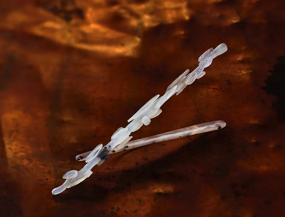 „Für mich drücken diese beiden Steine aus, was zurückbleibt, wenn ein Mensch gebrochen ist - Geist und Knochen. In der Natur zerfällt ein Körper langsam bis auf ein Skelett, das noch lange Zeit erhalten bleibt. Und während ein Mensch lebt, ist der Geist das Skelett, das in der Hülle des Menschen verborgen ist und das Leben unterstützt. Der Mensch ist fragil. In jedem Fall kann jeder Mensch an den Zufälligkeiten des Schicksals zerbrechen. Aber keine Angst, solange das Skelett, der Geist, bleibt, kann er die zerbrochenen Teile integrieren und sie langsam wieder zu einem Ganzen machen. Die Broschen sehen zwar fragil aus, aber sie sind stark genug, um jeder Umarmung standzuhalten."