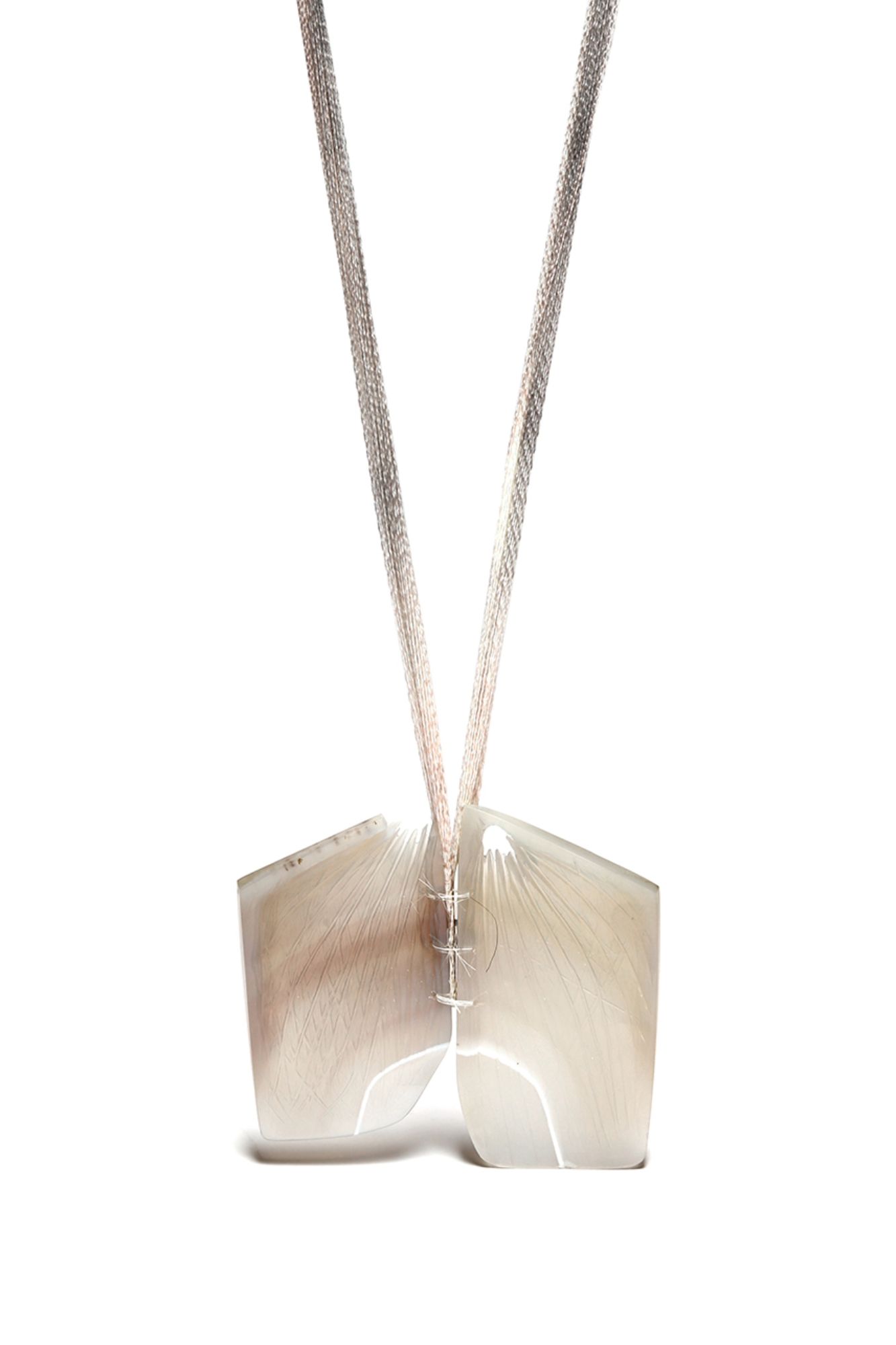 Arianaz Dehghan (MFA) arbeitet mit Achat, menschlichem Haar und gefärbtem Baumwollgarn. Ihre Anhänger thematisieren Nähe, Erinnerung und Verletzlichkeit und bewegen sich sensibel zwischen Körperbezug und persönlicher Erzählung.