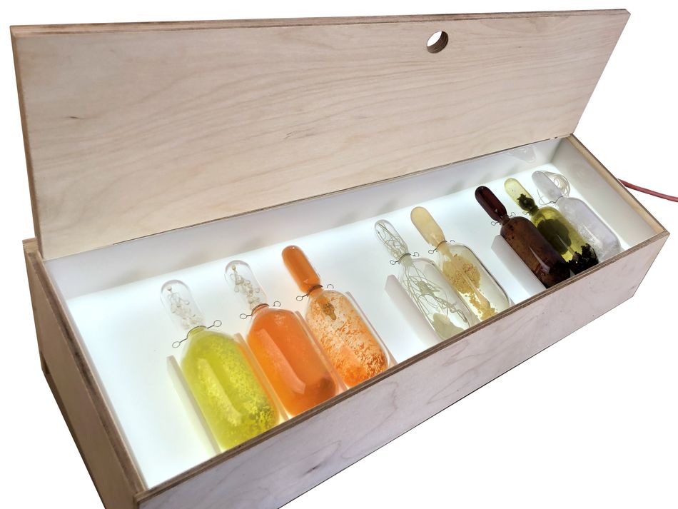 Das „Kabinett der Risiken und Chancen“ besteht aus hermetisch verschlossenen Glasgefäßen - Ampullen, die physikalische Substanzen verschiedener Art enthalten. Ampullen können sicher transportiert werden, aber ohne sie zu zerstören, ist es unklar, ob ein Gefäß - ein Heilmittel - oder - eine Bedrohung enthält. Mit einer zunehmenden Zahl von Pillen, Pulvern und Injektionen steuern wir die Art und Weise, wie wir das Leben erleben, wie wir uns fortpflanzen oder altern und wie wir dem Tod begegnen. Mit dem richtigen Cocktail an Substanzen, Beruhigungsmitteln, Schmerzmitteln oder Hormonen können wir Menschen zu einem erstrebenswerteren Leben verhelfen oder das Geschlecht einer Fischpopulation verändern. Alle Substanzen, die wir entwickeln, haben eine langfristige Wirkung auf alle lebenden Organismen.