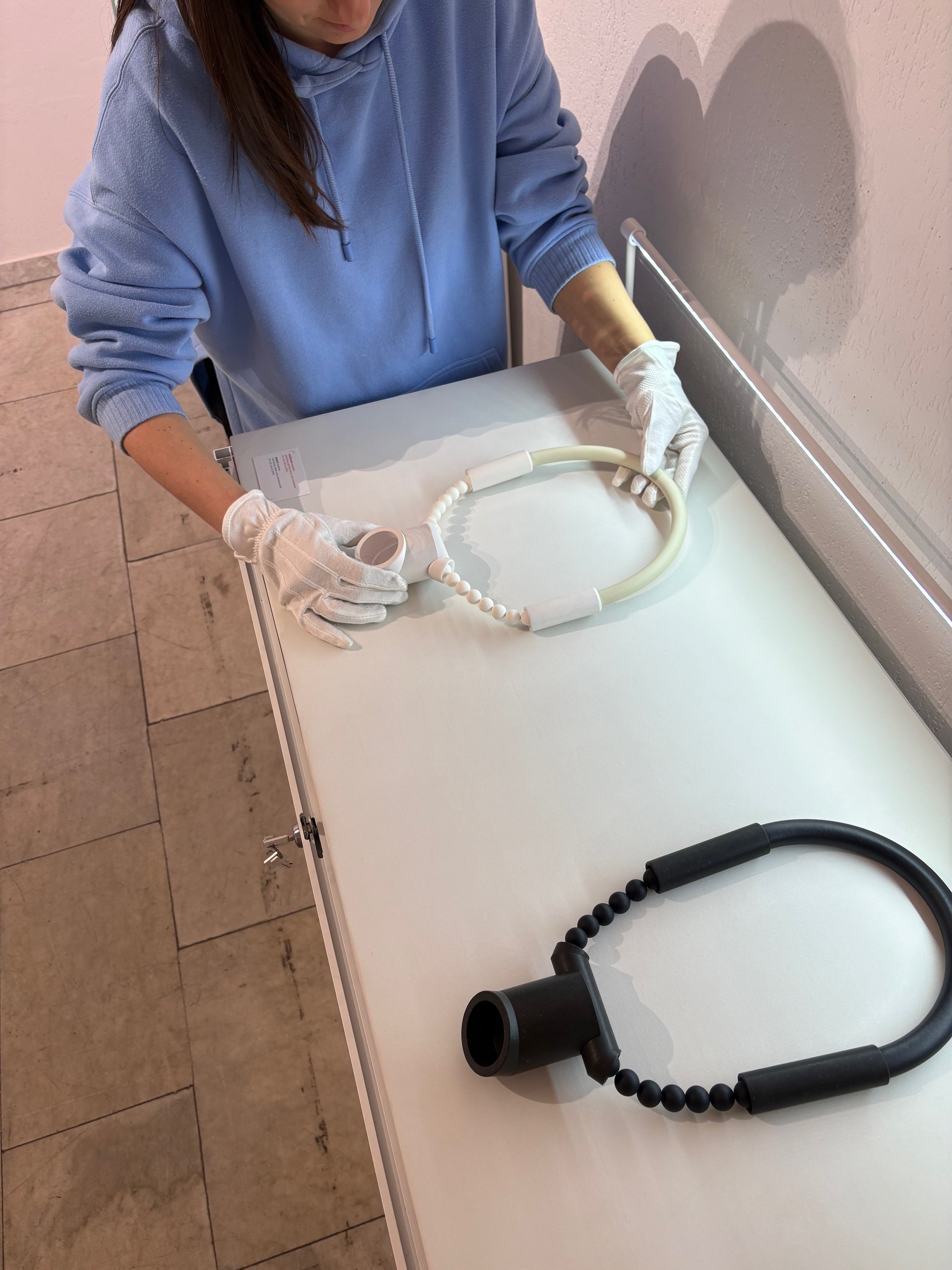 Nikita Kavryzhkin nähert sich der Form über die Suche nach Atmosphäre – einer unsichtbaren Qualität, die seinen Arbeiten emotionale Tiefe verleiht. Atmosphäre und Aura versteht er dabei als transzendente Phänomene, wobei besonders die Erfahrung des Erhabenen eine zentrale Rolle spielt: ein Zusammenspiel von Raum, Klang, Licht, Schatten und weiteren sinnlichen Elementen. Vor diesem Hintergrund interessiert ihn, wie Material, Proportion und Komposition bereits vor jeder bewussten Wahrnehmung ein Gefühl erzeugen können. Stille und Spannung werden so zu integralen Bestandteilen seiner Werke.