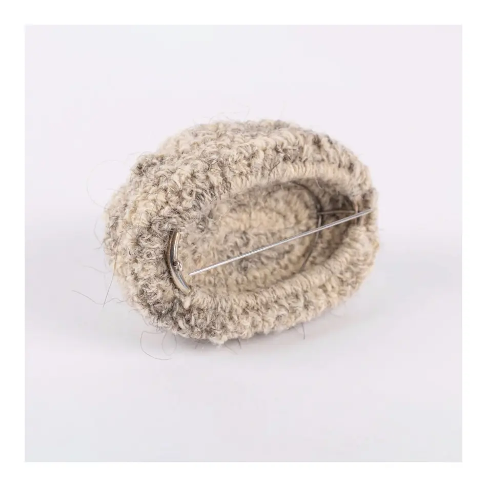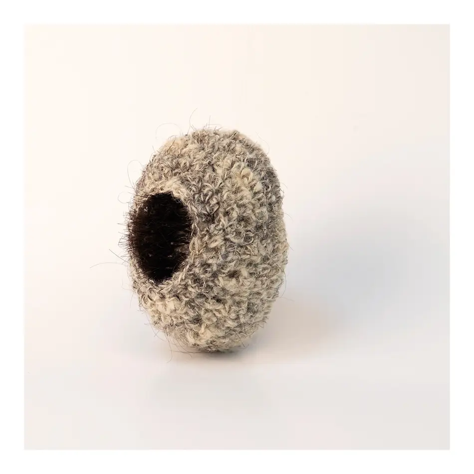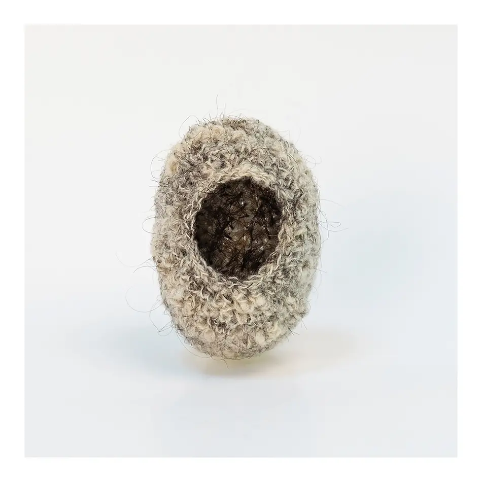 Eine Wollmütze im Puppenformat? Eher eine locker sitzende Haube. Eine, wie sie unsere Großmütter früher trugen, um die Frisur nicht zu zerdrücken. Obenauf allerdings eine kreisrunde Öffnung, aus welcher Haare einzeln herausstehen. Fast stachelig wirken diese. Als wollten sie das Innere dieser nestähnlichen Form schützen und nur ungern den Blick darauf freigeben. Auf sehr originelle Weise verarbeitet Vanessa Zöller die Perlen ihrer Großmutter zu einer Brosche. Sie verknüpft und umhäkelt diese mit einem selbstgesponnenen Faden aus Wolle und menschlichem Haar. Erbstück nennt sie dieses Schmuckstück, das beim Betrachten eine Vielzahl an ambivalenten Gefühlen auslöst. Das Werk berührt, macht neugierig, verspricht Geschichten. Gleichzeitig bleibt es zurückhaltend, persönlich und privat, ein Erbstück eben.