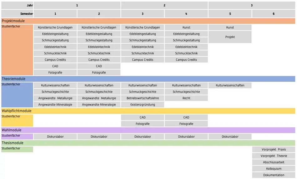 Neben dem Erweitern von bereits vorhandenen Fertigkeiten in der praktischen, handwerklichen Arbeit und dem Kennenlernen von allen möglichen schmucktauglichen Materialien - also nicht nur Edelstein! - steht die Entwicklung einer künstlerischen, eigenständigen Handschrift im Zentrum des Studiums. Dazu gibt es die künstlerischen Fächer wie Edelsteingestaltung, Schmuckgestaltung, Gestaltungsgrundlagen sowie Fotografie und CAD.