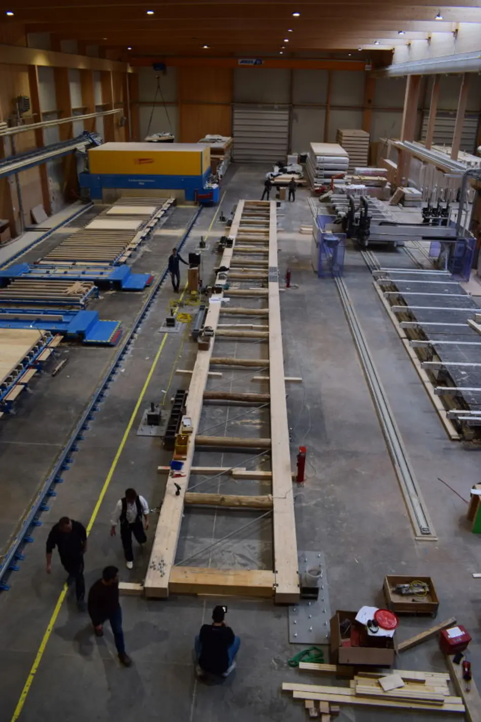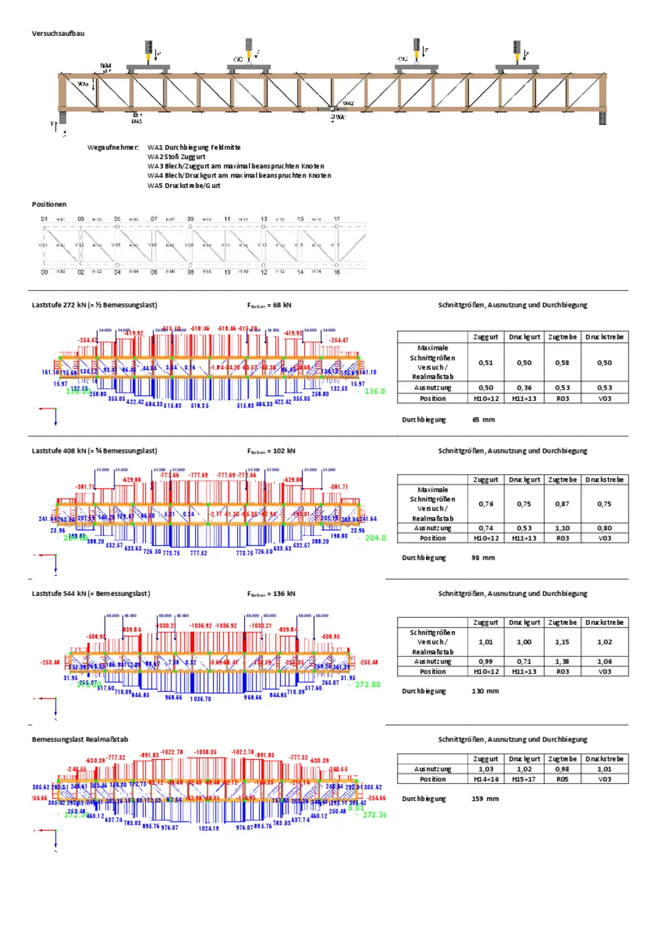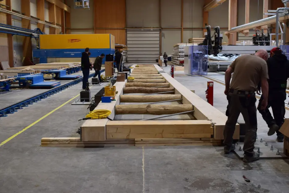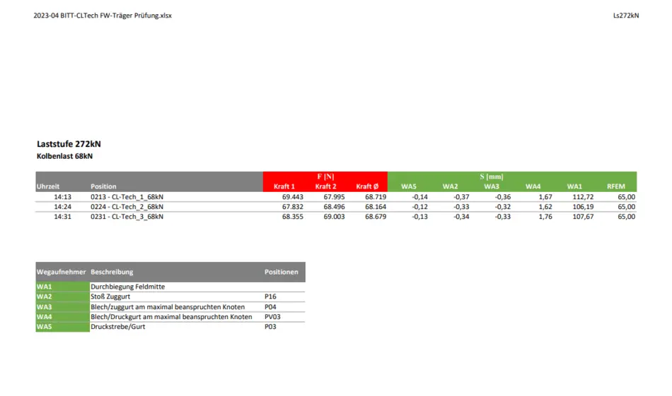 Auftragsgegenstand ist die Begleitung eines bei CLTECH am 31.03.2023 durchgeführten Versuchs an einem durch CLTECH gefertigten Fachwerkbinder von 33,92 m Länge und einer Bauhöhe von 2,60 m. Die Gurte bestehen aus GL 28 h, die senkrechten Druckstreben aus lediglich von Bast und Rinde befreitem Eichenholz mit d~240-280 mm. Die Zugdiagonalen bestehen aus Rundstahl unterschiedlicher Güte gemäß statischer Erfordernis und sind durch Ober- und Untergurt durchgesteckt. Der Träger soll für die Erweiterungsbauten der Produktion CLTECH als Hallenträger eingesetzt werden. HKT stellt die statische Berechnung des Versuchsträgers sowie die erforderliche Prüf- und Meßeinrichtung und berät den AG (CLTECH) aufgrund des Versuchsergebnisses bei der Herstellung serienmäßig herzustellender Träger gleicher Bauart.