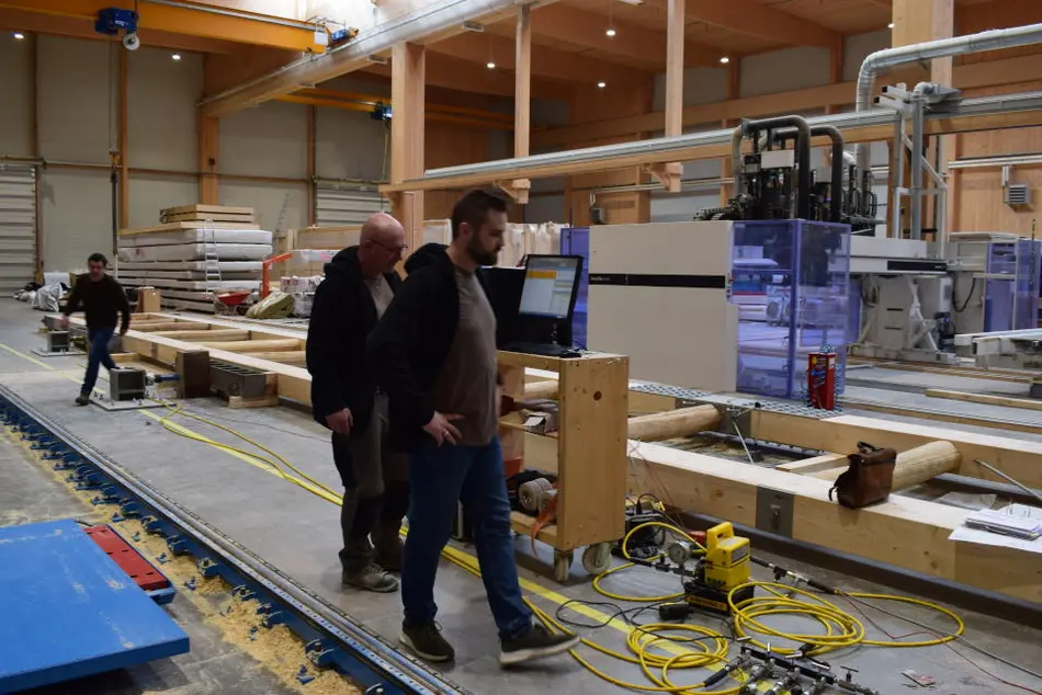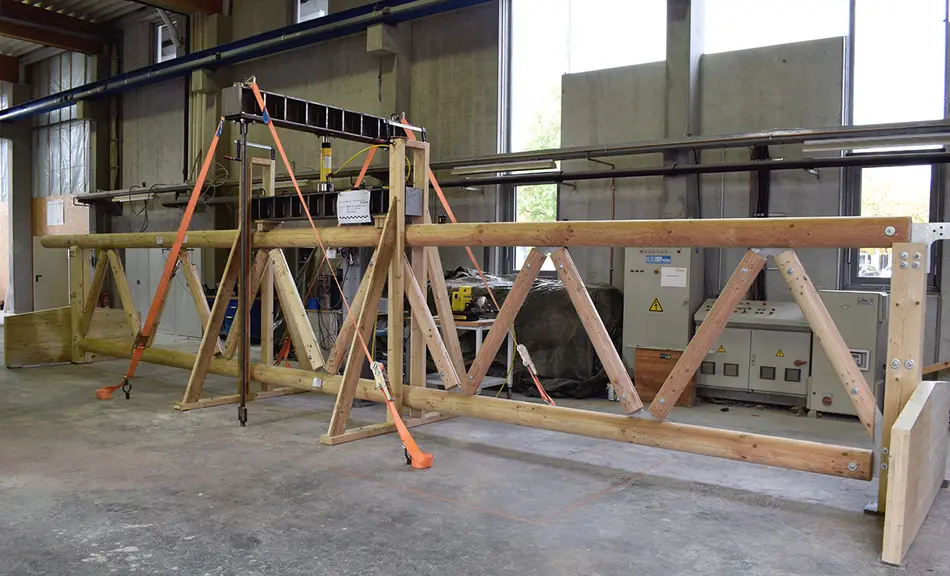 Zwei vorgespannte Holz-Beton-Verbundträger wurden in Vierpunkt-Biegeversuchen untersucht. Ein Träger besitzt eine Länge von 9,47 m und ist 2,5 t schwer. Die von der Firma entwickelten Bauteile wurden hinsichtlich der Durchbiegung und ihres Schwingungsverhaltens untersucht. Dazu wurden die Träger mit steigenden Laststufen bis zur einen max. Last von 22 t belastet. Zum Einsatz kamen die im Februar 2017 im Eigenbau angeschafften Prüfrahmen und Hydraulikpressen, welche eine solche Last bewerkstelligen können. Die Versuche wurden hinsichtlich der eingesetzten Mess-Software in der Anfangsphase vom Versuchsingenieur des Baustofflabors der HS-Mainz begleitet. Die Verformungen der beiden Träger lagen innerhalb der errechneten Toleranzen, das Schwingungsverhalten lag über den für den Holzbau kritschen Wert von > 8 Hz.