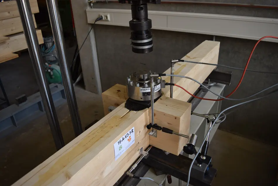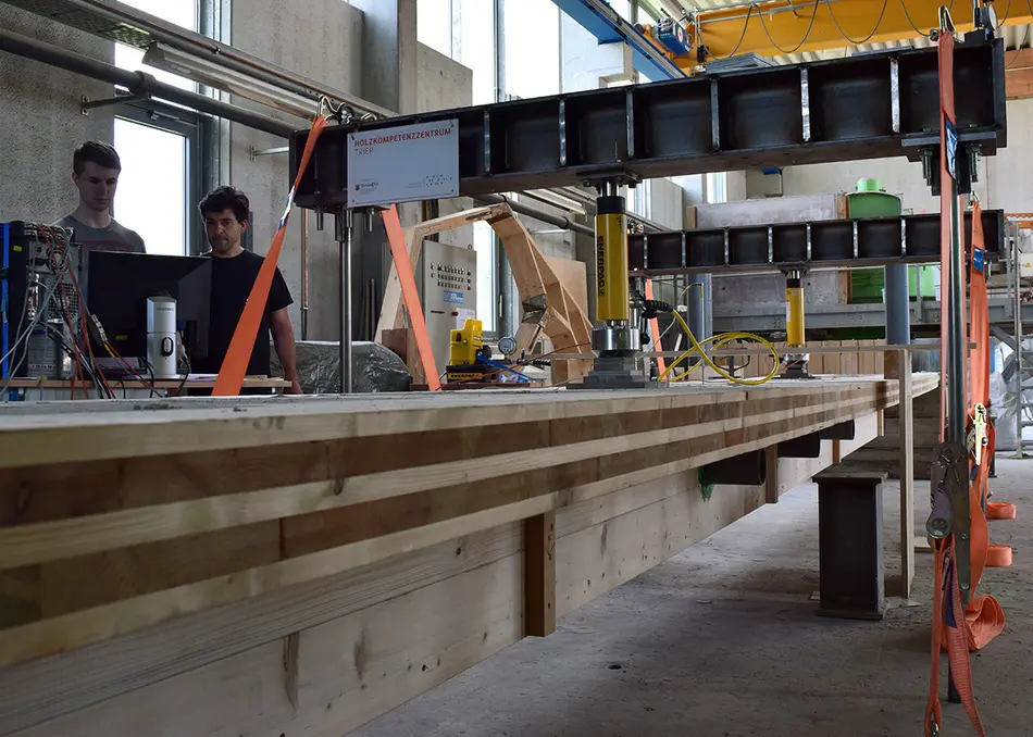 Prüfhalle Föhren, 200 kN Biegeprüfrahmen, 4000 kN Druckprüfrahmen, Datenlogger zur Verformungsanalyse, Prüfdurchführungen nach DINEN 408, zerstörende und zerstörungsfreie Festigkeitsuntersuchungen von Holz.