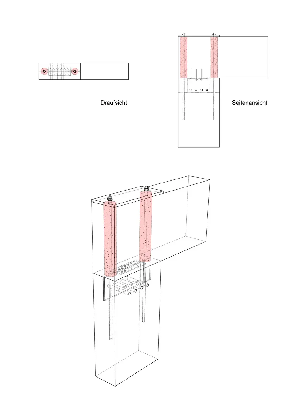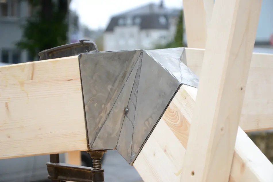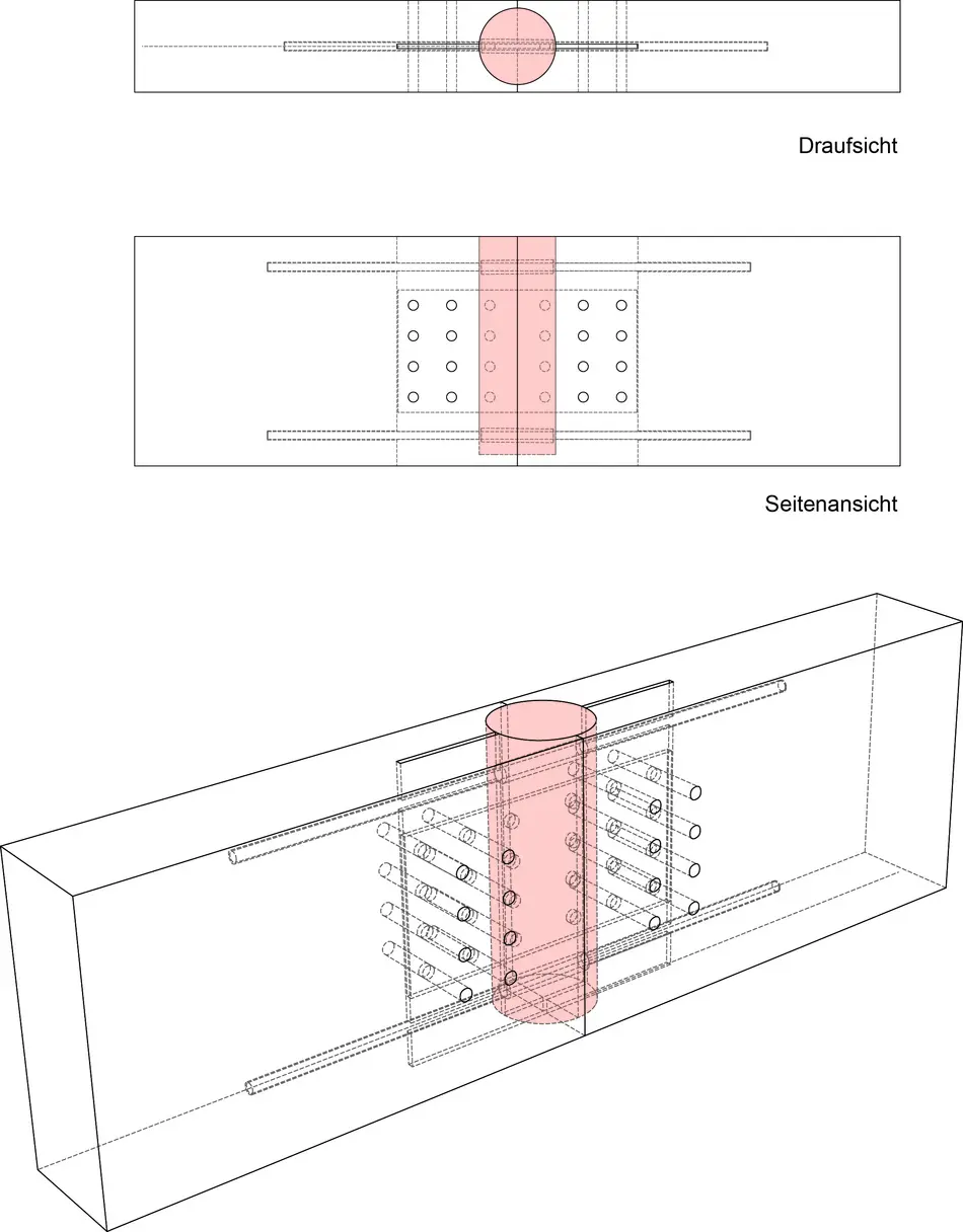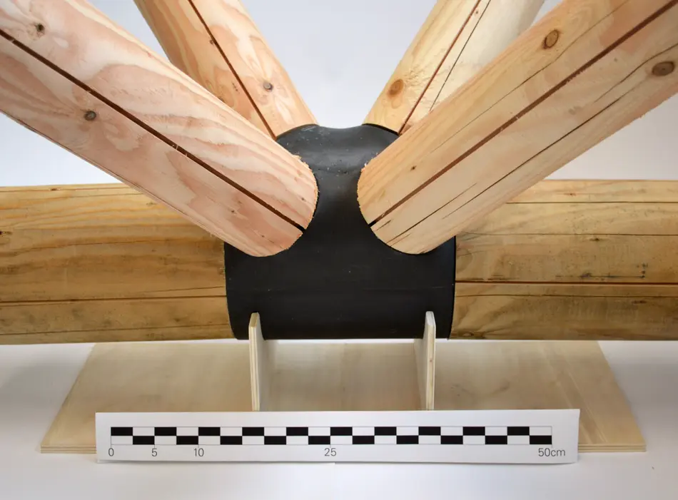 Das Ziel unserer Forschung und Entwicklung ist, heimische Holzarten mit möglichst geringer Verarbeitungstiefe durch High-tech Ingenieurmethoden für den modernen Holzbau zur Verfügung zu stellen. Hierbei spielen neuartige Verbindungssysteme als innenliegende und außenliegende Verbindungsknoten eine wichtige Rolle. In Verbindung mit CAD/CAM Konzepte und die Einbindung parametrischer Entwurfswerkzeuge in den Holzbau können Tragwerke flexibel entwickelt werden. Der Außenknoten wird entweder durch 3D-Druck/Frästeil mit Formenbau und Guss oder als Guss mit verlorener Schalung hergestellt. Die zu verbindenden Querschnitte können durch den Knoten mit einfachen Kappschnitte versehen werden und somit kann (materialschonend) auf komplexen Abbund verzichtet werden.