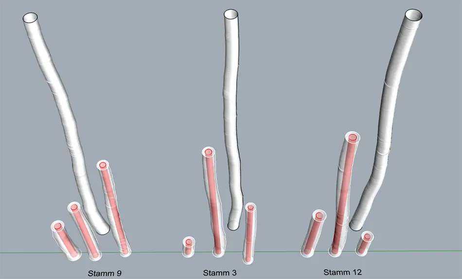 Dazu soll bisher nur als Industrie- oder Palettenholz verwertetes Schwachholz so weiterverarbeitet werden, dass möglichst wenig Prozessenergie zur Herstellung der Holz-Hybridwände aufgewendet werden muss. Es sollen Flächenelemente entwickelt werden, die im Hinblick auf die Anforderungen des Geschossbaus zur Ausführung von tragenden und nichttragenden Wänden und raumabschließenden Fassadenelementen führen können. Gleichzeitig sollen bauphysikalische Anforderungen wie klimaregulierende, wärmedämmende, wärmespeichernde, brandhemmende und schalldämmende Eigenschaften berücksichtigt und untersucht werden. Diese Eigenschaften lassen sich in Kombination mit Lehm, Recyclingbeton oder anderen mineralischen Baustoffen erzielen, wobei hier möglichst auf vorhandene Standardrezepturen zurückgegriffen werden soll. Vorgeschlagen werden Schichten, welche die stehenden (dicht an dicht, bzw. Stabkirchenprinzip), geschosshohen und besäumten Stämme bauphysikalisch sinnvoll ergänzen. Die entwickelten Holz-Hybridwände werden anschließend in einer Tastversuchsreihe bauphysikalisch untersucht.