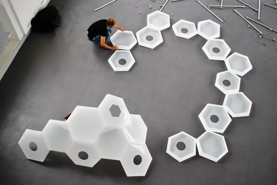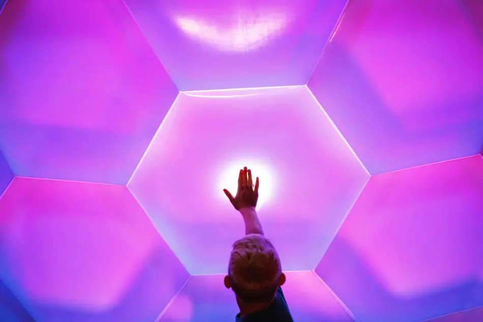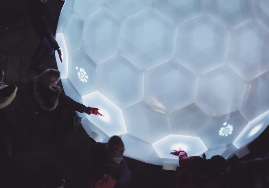 Eine partizipative Multimediainstallation, die dem User mit Hilfe von Gestensteuerung audiovisuelles Feedback gibt und erst ab einer Teilnehmerzahl von mindesten fünf Personen seine volle audiovisuelle Pracht freigibt. Die etwa vier Meter große, mit digitaler Technik gefüllte, Kuppel wird mit Beteiligung der Besucherinnen und Besucher zu einem neuen kollektiven Licht- und Sound-Erlebnis führen. Hierzu befinden sich rund um die Kuppel zehn Distanzsensoren, die auf die Bewegung der Besucher reagieren. Entscheidend ist das spielerische Entdecken und die Kommunikation der Besucher untereinander. Gelingt diese, werden sie mit einem besonderen Klangerlebnis und einem Lichtfeuerwerk belohnt. Mit jeder Person, die sich an der Interaktion beteiligt, wird der Sound dichter. Es bedarf mindestens fünf Personen, die mit ihren Händen die Sensoren gleichzeitig beeinflussen, damit die Kuppel in ihrer ganzen Fülle erklingt und zu pulsieren beginnt. Die Interaktion wurde von Intermedia-Designern der Hochschule-Trier entwickelt und interdisziplinär umgesetzt: Die Kompetenz der am Projekt beteiligten Informatik-Studierenden hat die technische Umsetzung deutlich gesteigert. Nicht zuletzt bietet die von Architektur-Studierenden entworfene geodätische Kuppel eine Neuinterpretation einer etablierten Typologie, die gleichzeitig Raumobjekt und Projektionsfläche ist. Ihre Symbolik als Hülle, Globus und verbindendes Element unterstreicht das Gemeinschaftserlebnis der explorativen Interaktion.