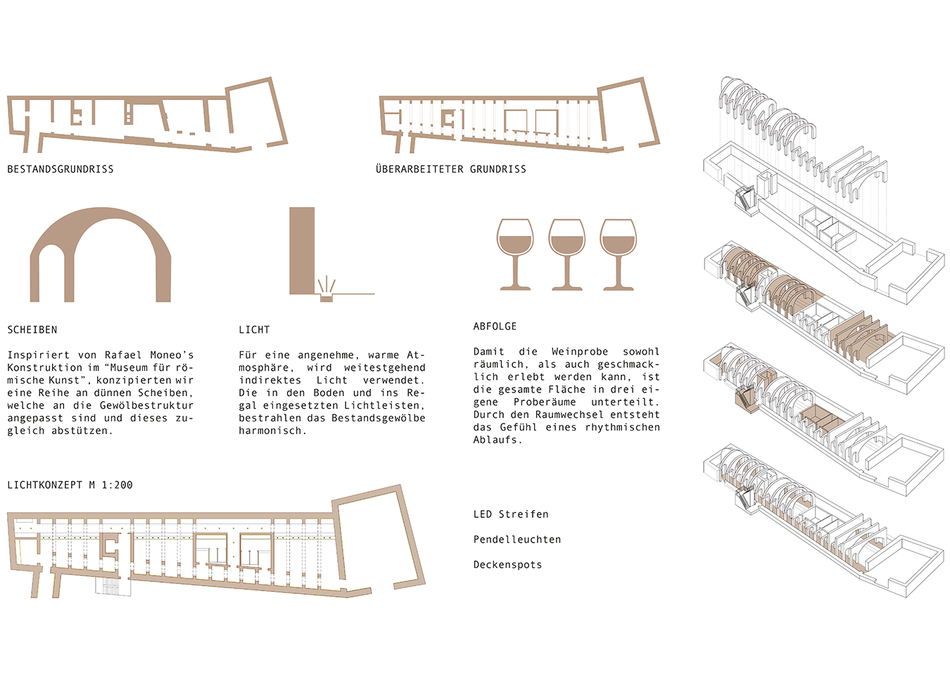 In diesem semester- und lehrveranstaltungsübergreifenden Projekt sind die Studierenden des 3. Semsters mit der Konzeption und Neugestaltung eines Weinproberaums samt Nebenraumprogramm in dem dafür vorgesehehnen Bereich des Weinkellers betraut. Ein Bereich also, in dem es technisch-klimatischen Anforderungen der Lagerung und des Ausbaus von Weinen mit den Behaglichkeitsanforderungen der Nutzer zu vermitteln oder auch zu inszenieren gilt.