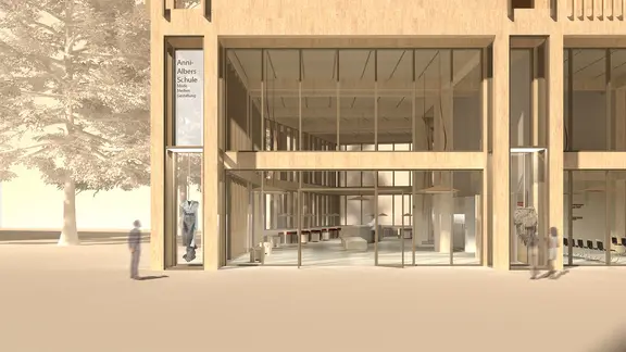 Als ein der städtebaulichen Situation und dem Selbstverständnis der neuen Institition angemessenes Zeichen soll der Neubau entlang einer der wichtigsten Stadteinfahrten Frankfurts adressbildend und identitätsstiftend wirken und gemeinsam mit den unter Denkmalsschutz stehenden Bestandsgebäuden den Campus der Anni-Albers-Schule für Mode, Medien und Gestaltung prägen.