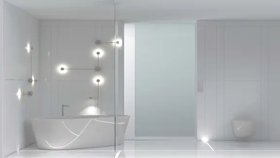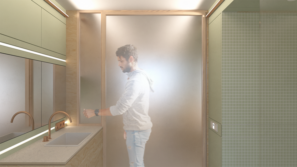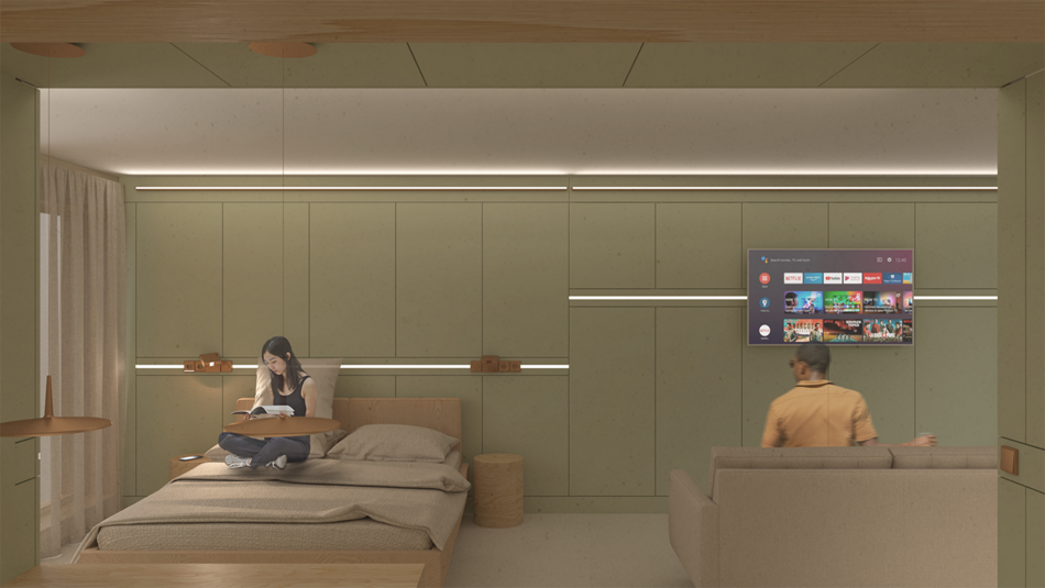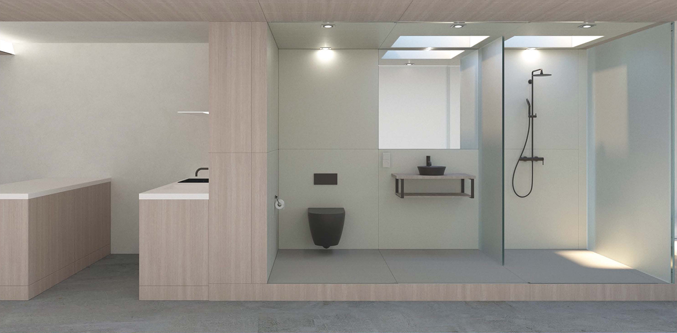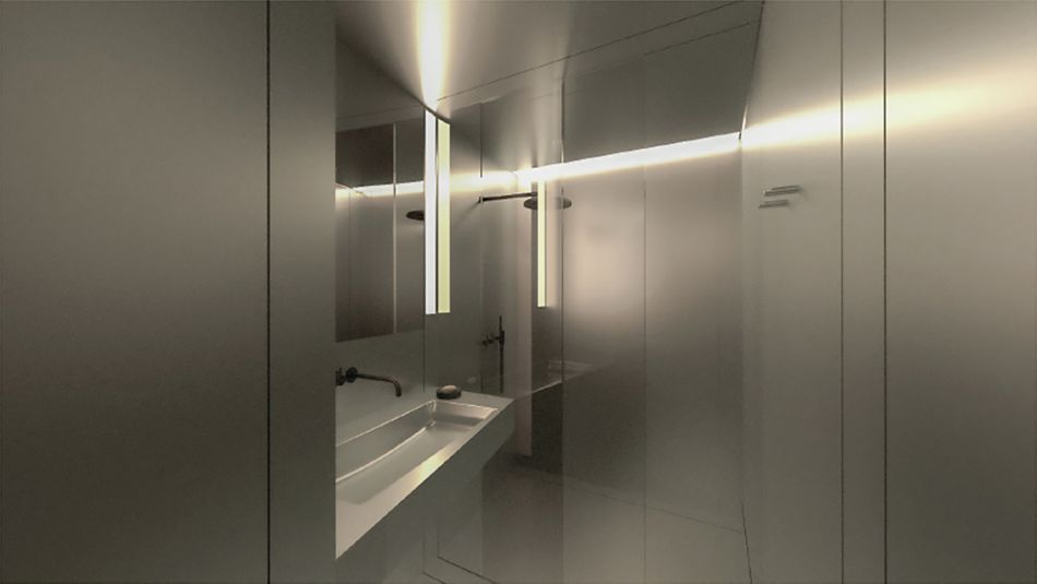 Schließlich will das System nicht hinter einer konventionell hergestellten Oberfläche verschwinden, sondern mit einem aus der inneren Logik entwickelten Erscheinungsbild auch die Schnittstelle zum Erfahrungsraum des Nutzers definieren. Durch Wahlmöglichkeiten hinsichtlich der Materialität und der Oberflächenbeschaffenheit sowie durch die Einbindung von Beleuchtungs-, Raumkonditionierungs- und Steuerungselementen sollen Behaglichkeitsaspekte umfassend adressiert und die Nutzerakzeptanz gesteigert werden.