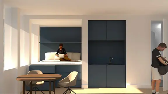 In diesem semester- und lehrveranstaltungsübergreifenden Projekt sind die Studierenden des 4. Semsters mit der Konzeption und Neugestaltung der Regelgeschosse betraut. Vor dem Hintergrund der Umnutzung des gesamten Gebäudes kommt diesem Beitrag zentrale Bedeutung zu, denn er bildet nicht nur auf architektonischer und typologischer, sondern auch auf programmatischer Ebene das Rückgrat der Gesamtmaßnahme.