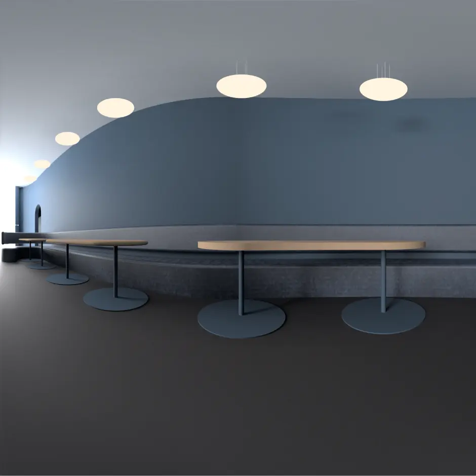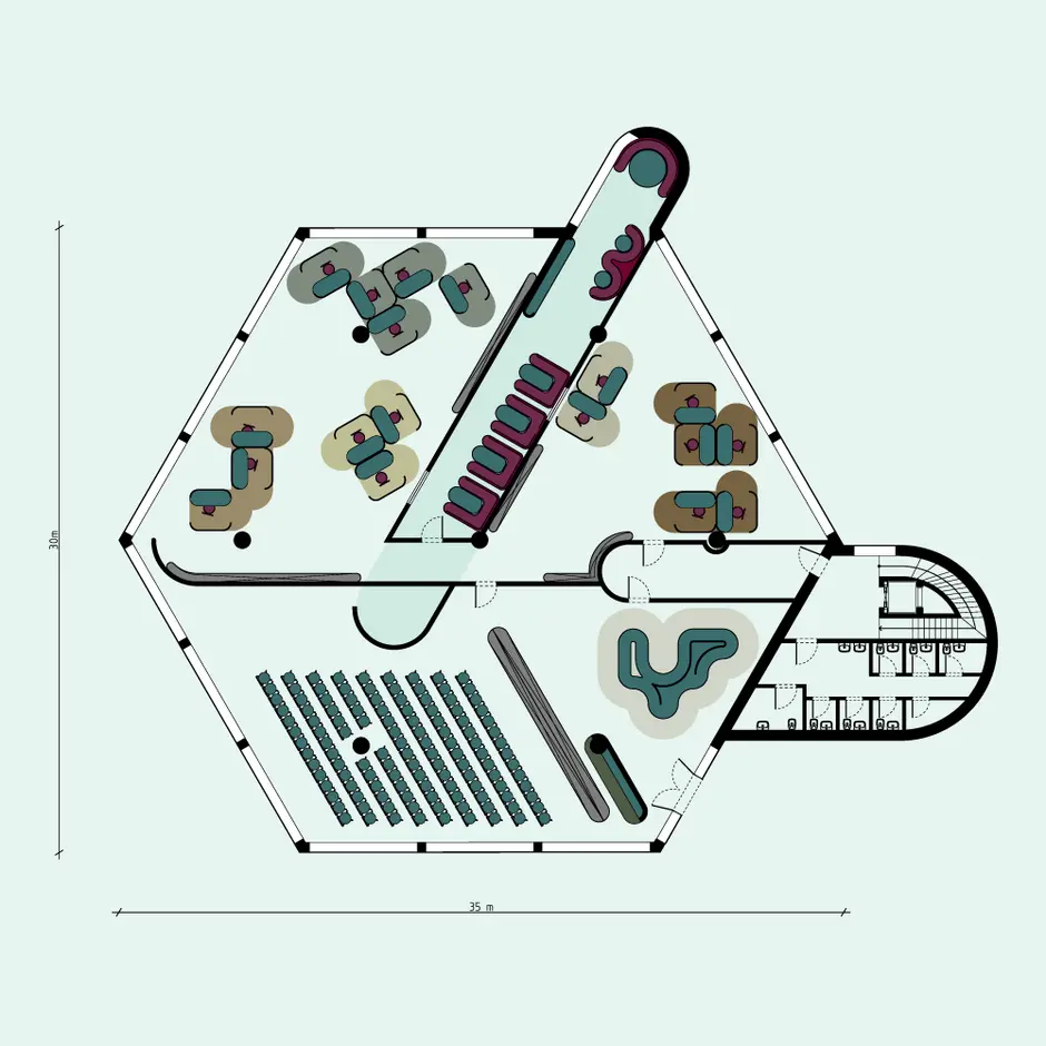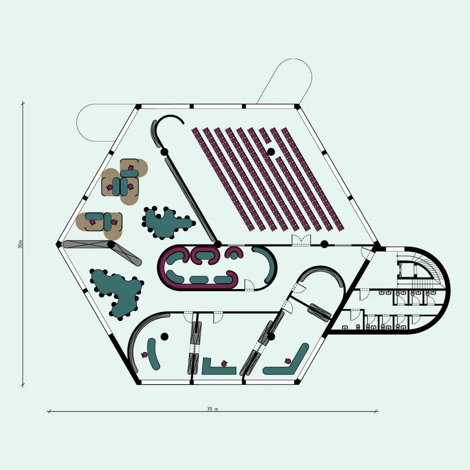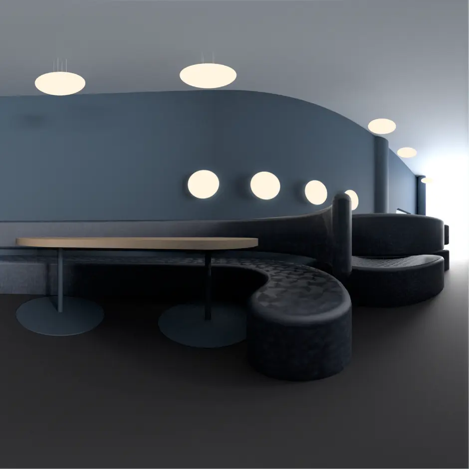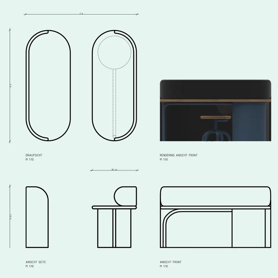 Die Möbel greifen die organische Formsprache des Konzepts auf. Sie sind aus schwungvollen intuitiven Formen. Wie hier beispielhaft eine Draufsicht auf das im Eingangsbereich stehende, fließende Sofamöbel. Dieses bietet Raum zu sitzen sowie zum verstauen.