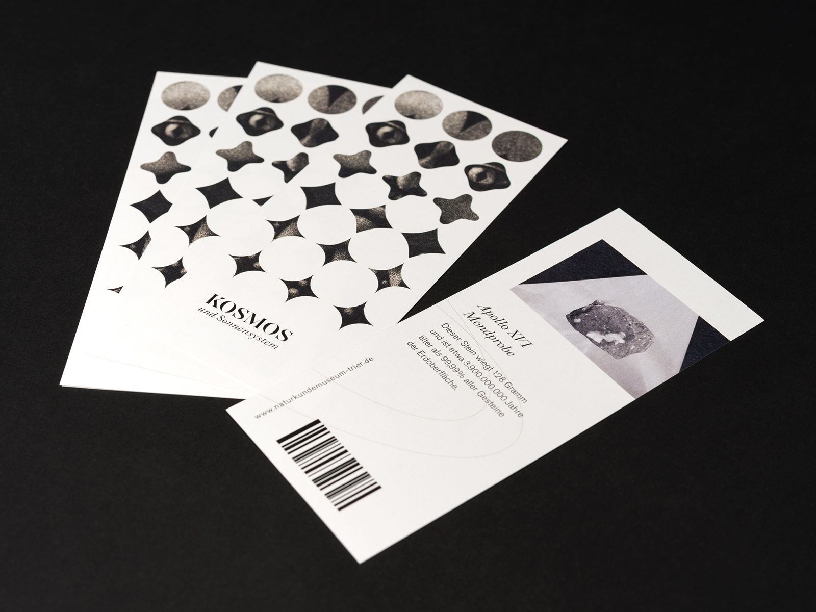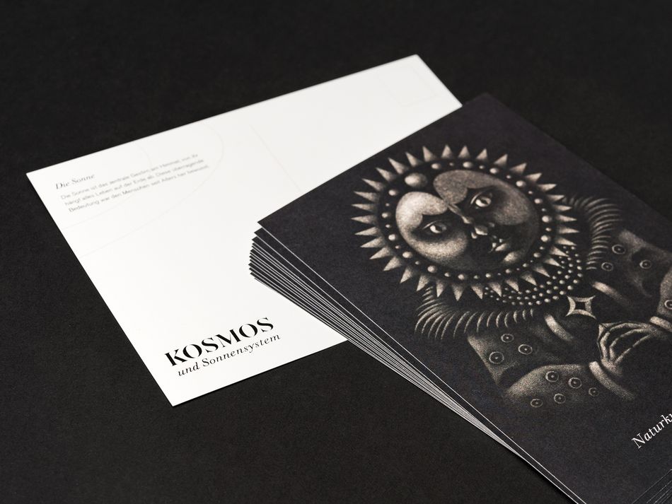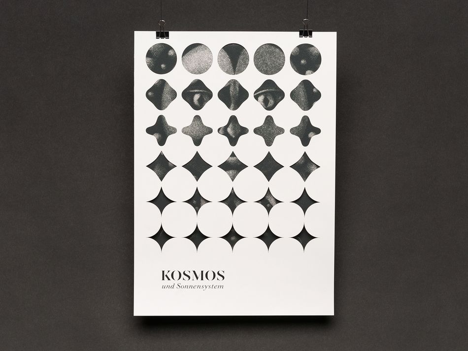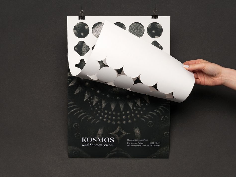 Fiktive Kampagne für eine Ausstellung zum Thema „Kosmos und Sonnensystem“ für ein Naturkundemuseum. Das Keyvisual setzt sich aus originalgrafischen Drucken (Mezzotinto) und einem darüberliegenden grafischen Muster zusammen. Die Motive werden in den verschiedenen Medien nach Ablauf eines Zeitraums oder vom Betrachter selbst aufgedeckt. So wird das Entdecken und Erkunden innerhalb eines Naturkundemuseums aufgegriffen.