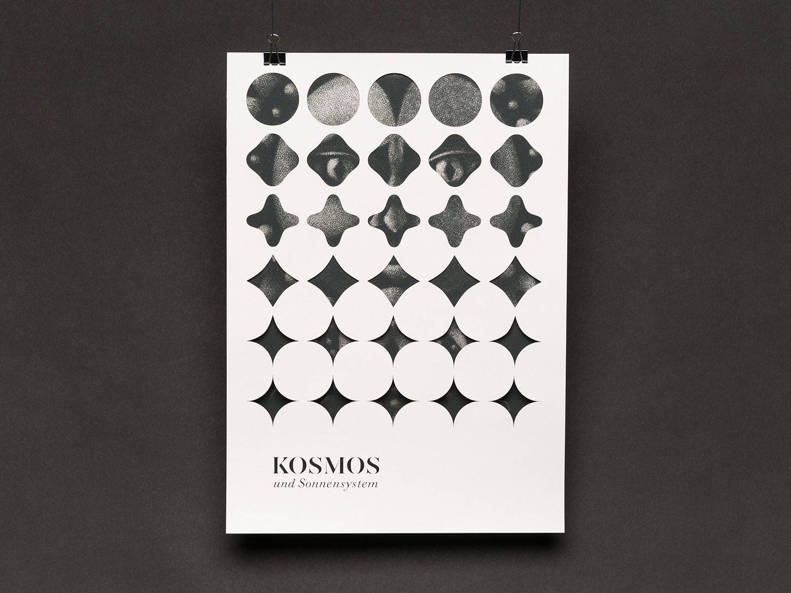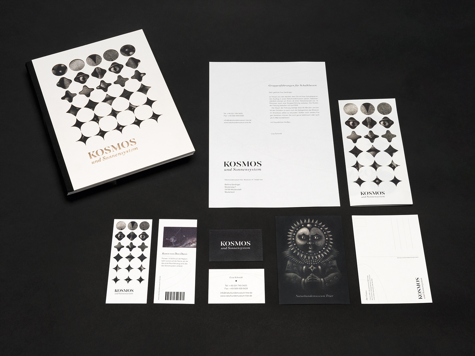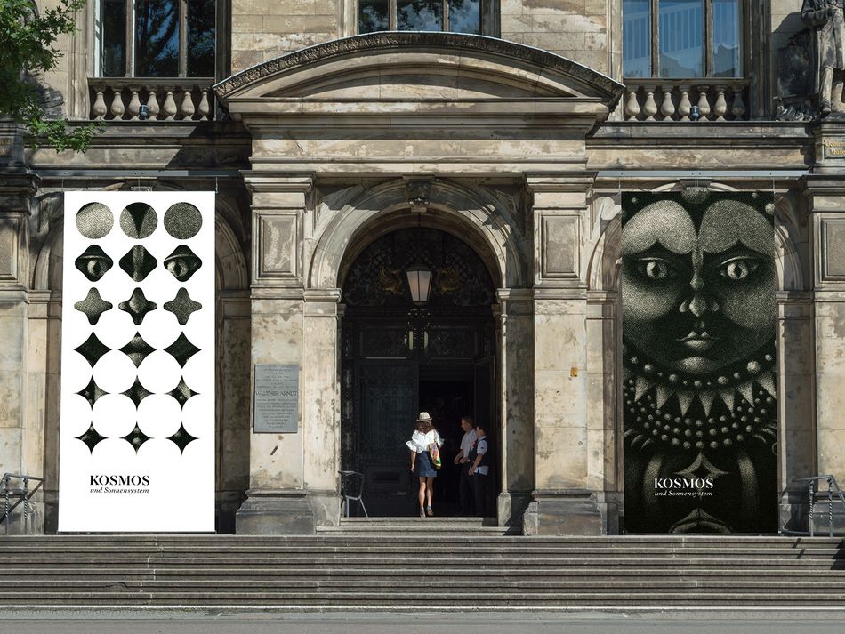 Fiktive Kampagne für eine Ausstellung zum Thema „Kosmos und Sonnensystem“ für ein Naturkundemuseum. Das Keyvisual setzt sich aus originalgrafischen Drucken (Mezzotinto) und einem darüberliegenden grafischen Muster zusammen. Die Motive werden in den verschiedenen Medien nach Ablauf eines Zeitraums oder vom Betrachter selbst aufgedeckt. So wird das Entdecken und Erkunden innerhalb eines Naturkundemuseums aufgegriffen.