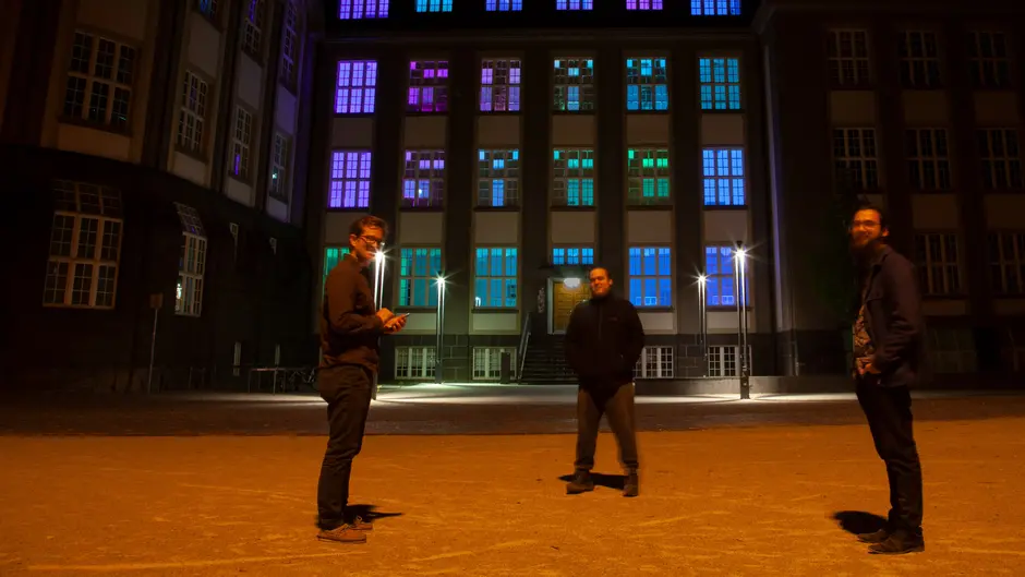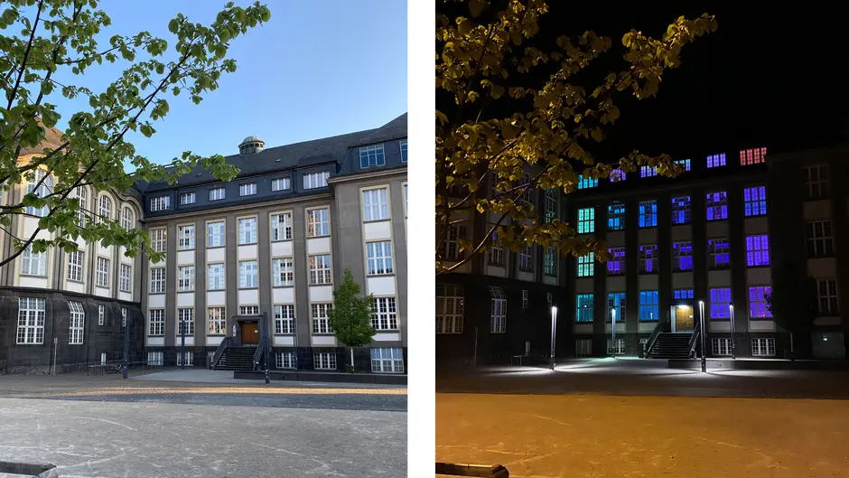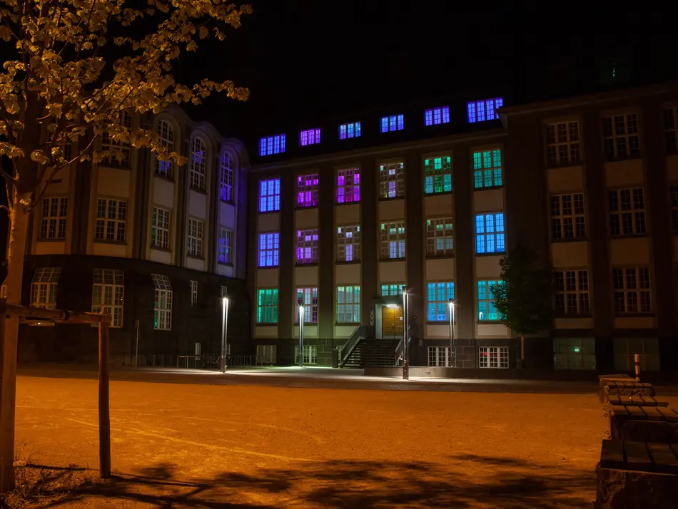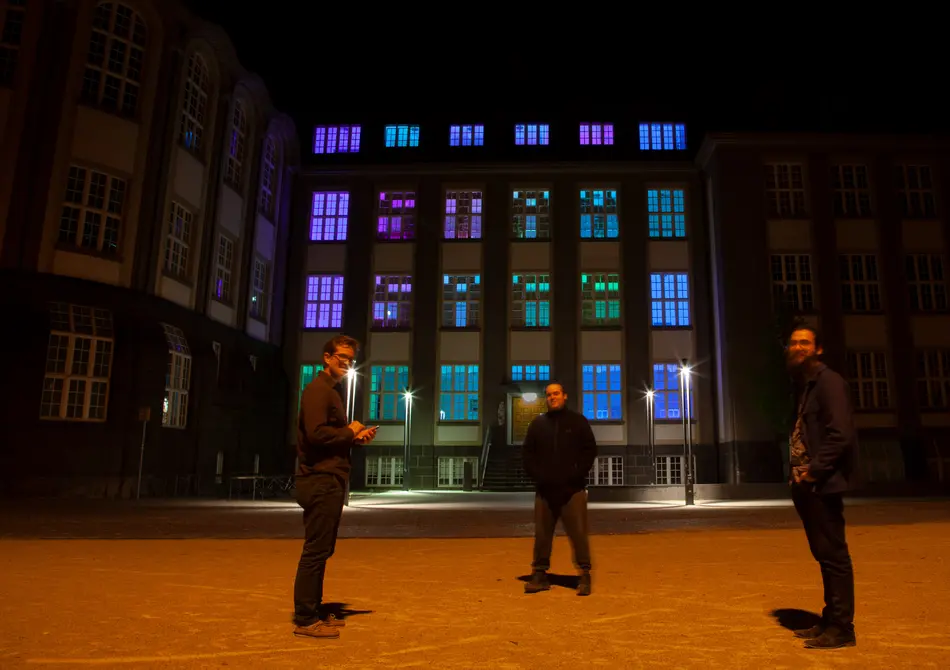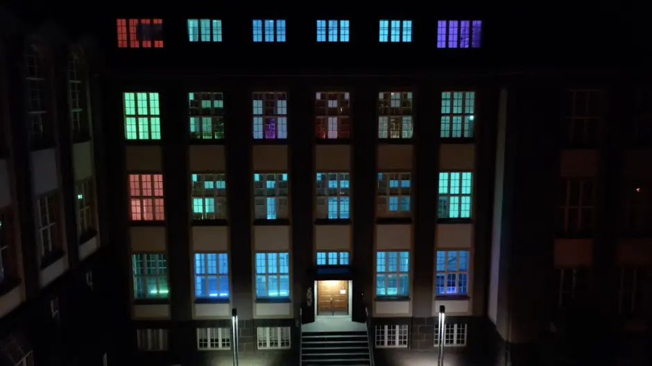 Da die übliche Präsenzlehre mit Vorlesungen im Gebäude im Sommersemester 2020 nicht stattfinden konnte, visualisierte diese Lichtinstallation die Aktivität in der digitalen Lehre. Denn sämtliche Vorlesungen und Kurse fanden seit Beginn des Semesters bedingt durch die Corona-Pandemie ausschließlich digital in Form von Online-Vorträgen statt.