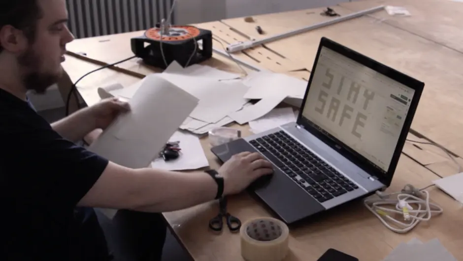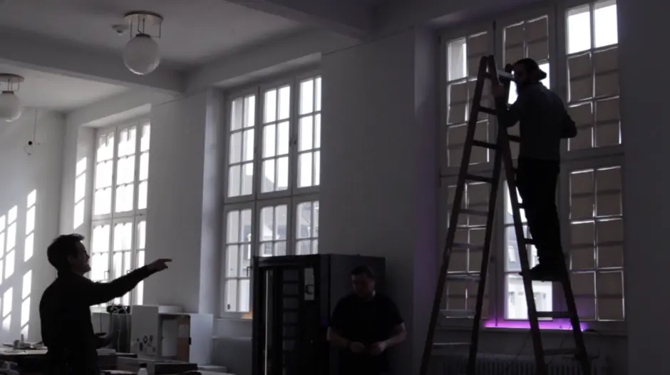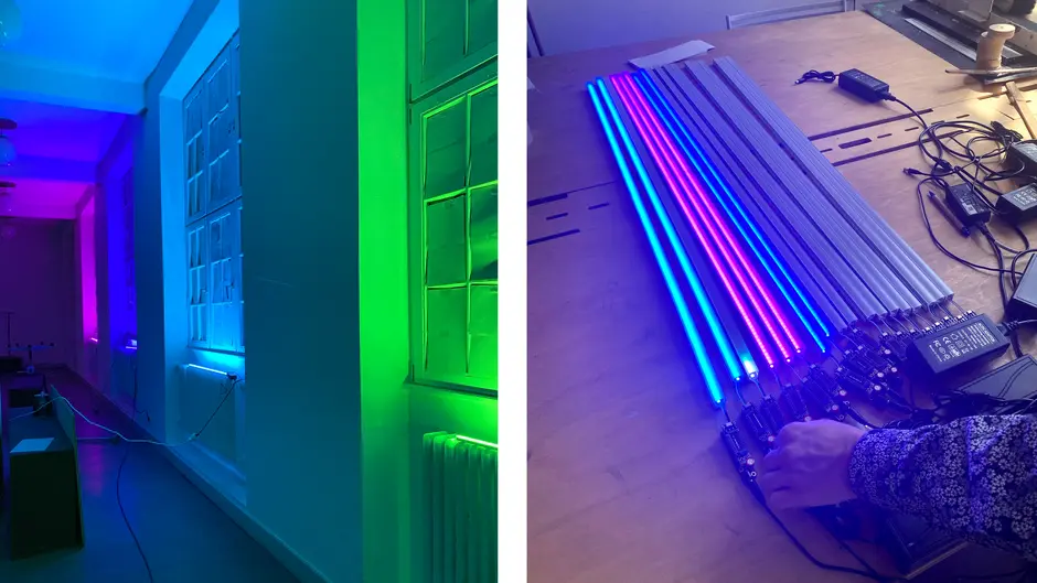 Um eine Netzwerkverkabelung zu vermeiden, wurden für das Projekt LED-Leuchten entwickelt, die individuell per WLAN ansteuerbar sind. „STAY SAFE“ – das ist die Botschaft, die durch das Licht-Schatten-Spiel in den großen Fenstern des Gebäudes in den Abendstunden sichtbar wurde.