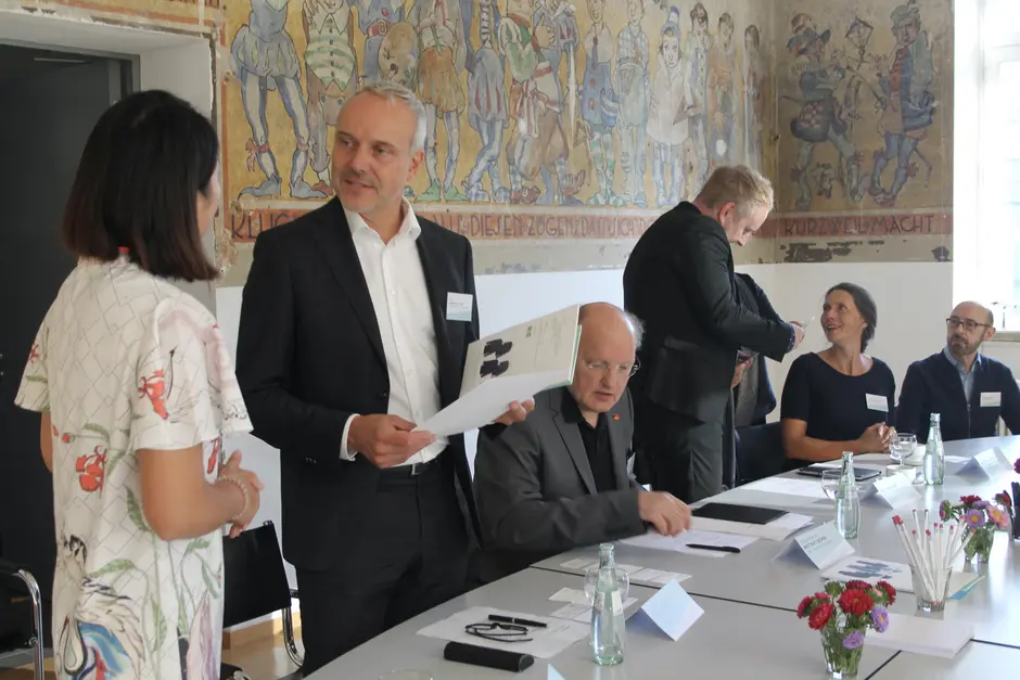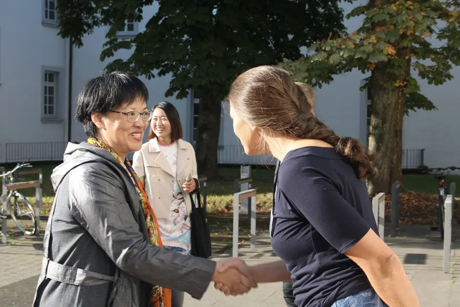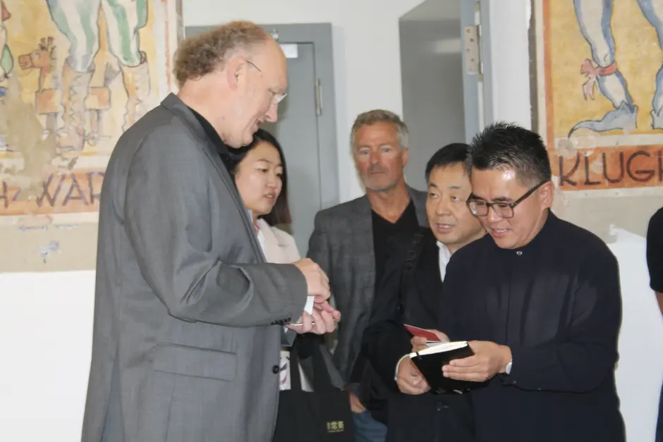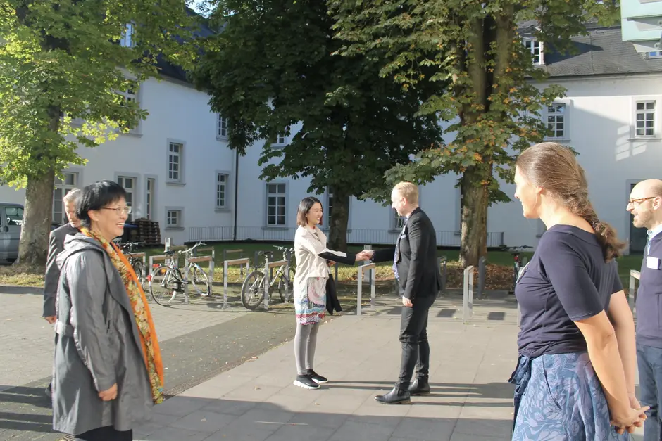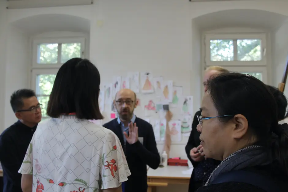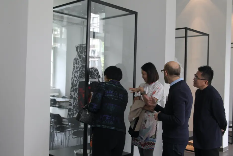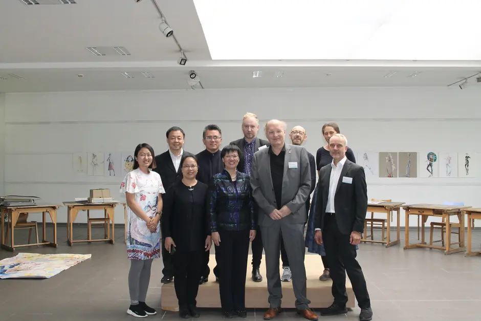 Der Dekan des Fachbereiches Gestaltung Prof. Dr. Sieveke begrüßte die Delegation in dem Fachbereich Gestaltung. Herr Prof. Bruns, Herr Prof. Gilgen, Frau Gunzer, Frau Franger und Herr Werner gestalteten einen Informationstag in der Fachrichtung und Ralf Schmitt führte durch die Ausstellung im Stadtmuseum Trier Simeonstift. Die Direktorin des Museums Frau Dr. Dühr empfing die Delegation und unterstützte die Fachrichtung Modedesign und den Fachbereich Gestaltung mit einem großzügigen Empfang im Kreuzgang. Die Delegation bestand aus den Gästen Frau Liao Qing, Professor and Vizepräsidentin der Universität BIFT, Beijing Institute of Fashion Technology.