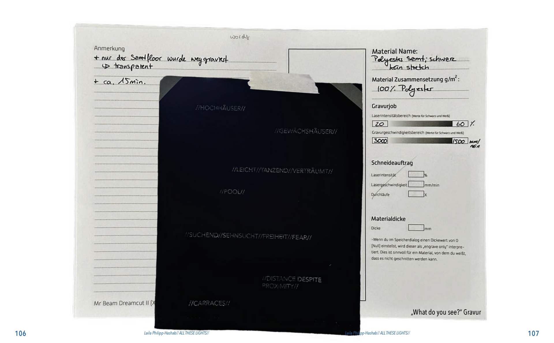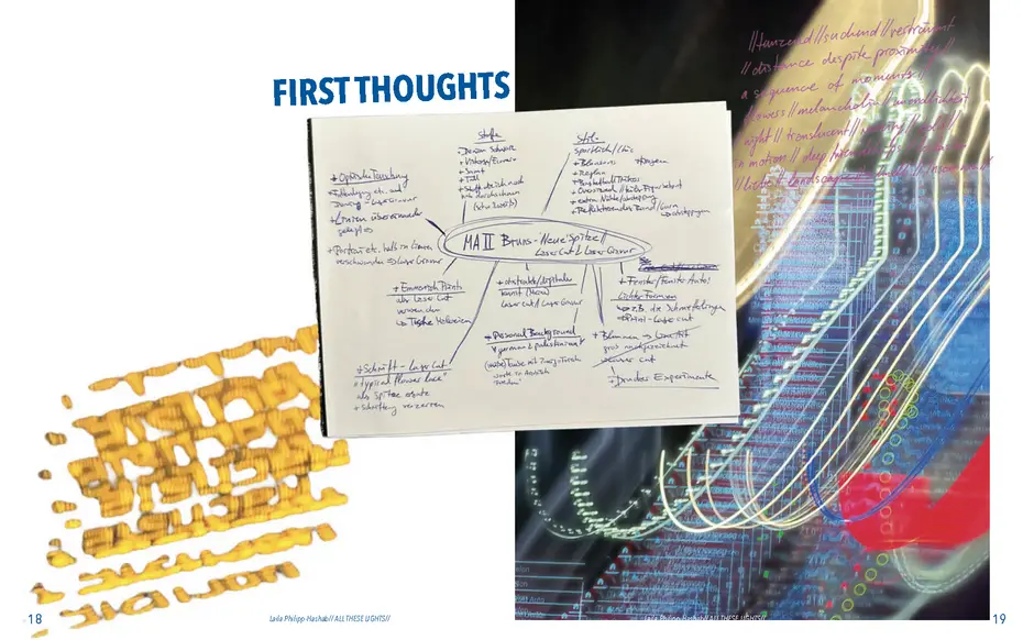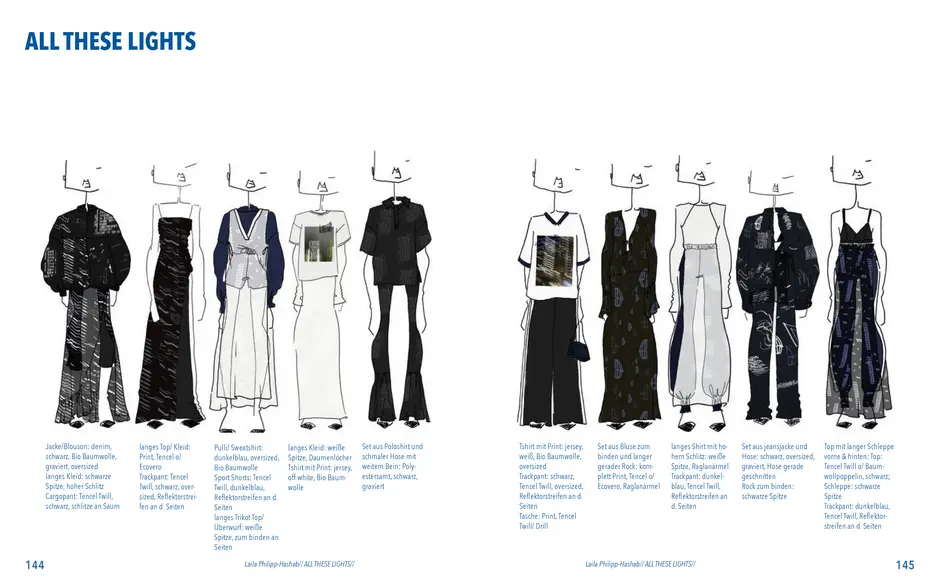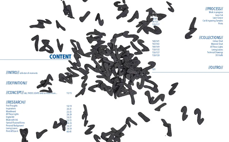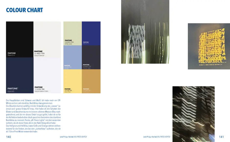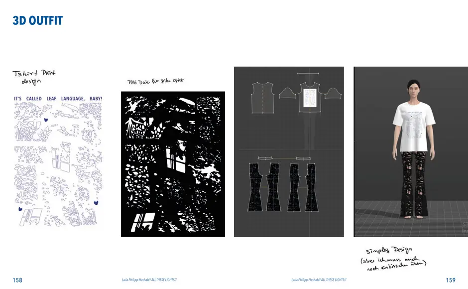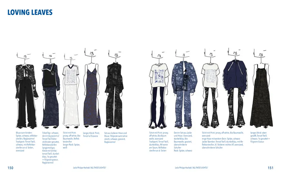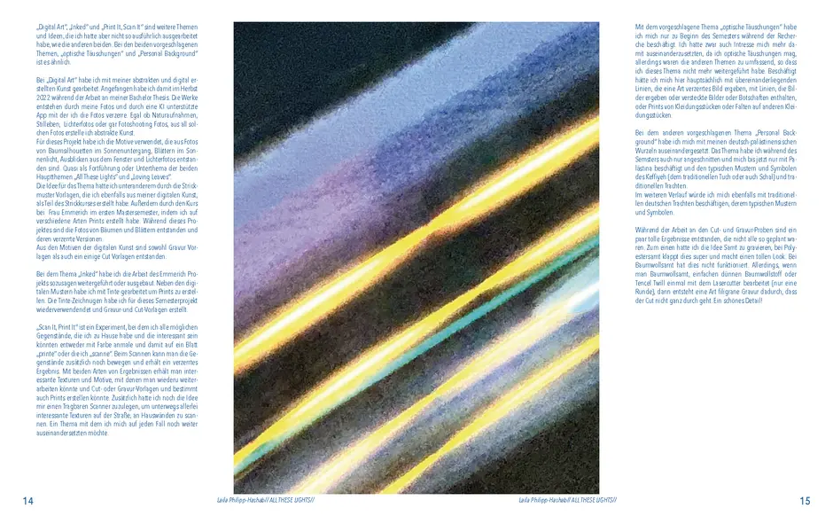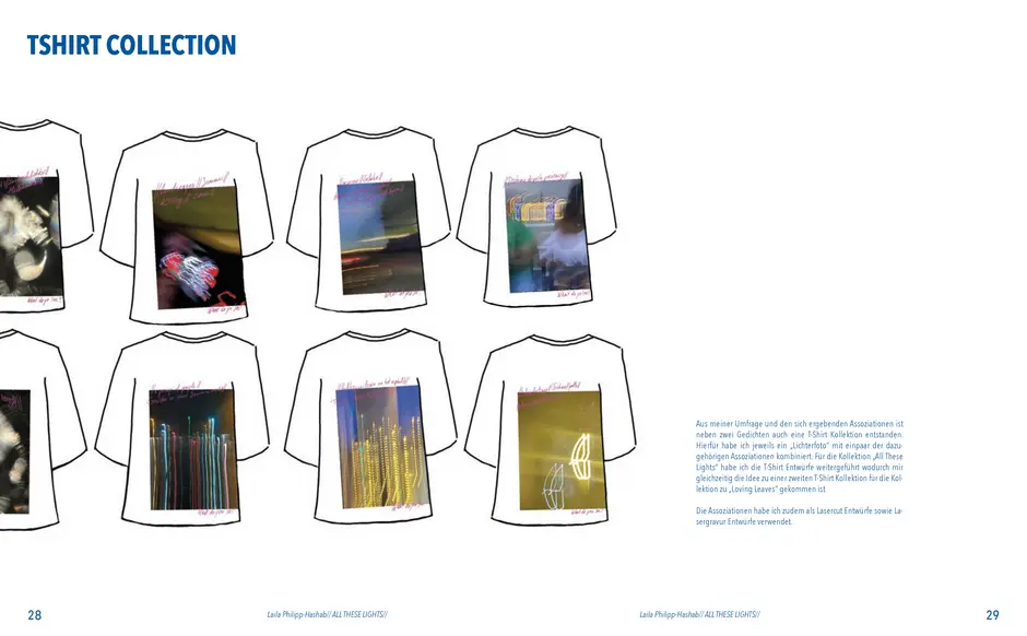 Aus der Umfrage, die ich in meiner Bachelor Thesis zu meinen Lichterfotos gemacht habe sind damals eine Reihe von Assoziationen hervorgegangen. Diese habe ich dann verwendet um eine T-Shirt-Kollektion zu entwerfen. Außerdem sind dadurch zwei Gedichte entstanden. Die Assotiationen sowie eins der beiden Gedichte habe ich ebenfalls als Lasercut und -gravur Vorlage verwendet. Die T-Shirt-Kollektion habe ich in dieser Kollektion weitergeführt. Das zweite Thema ist „Loving Leaves“. Während der Arbeit an dem Semesterprojekt und den verschiedenen Themen, ist dieses Thema zusammen mit „All These Lights“ zu meinen Favoriten geworden und „Loving Leaves“ quasi zum zweiten Hauptthema.