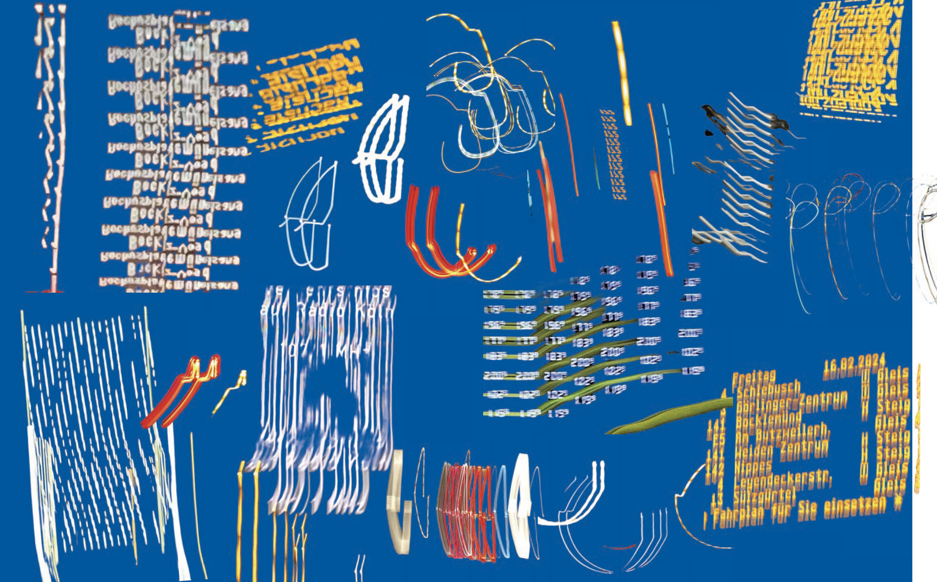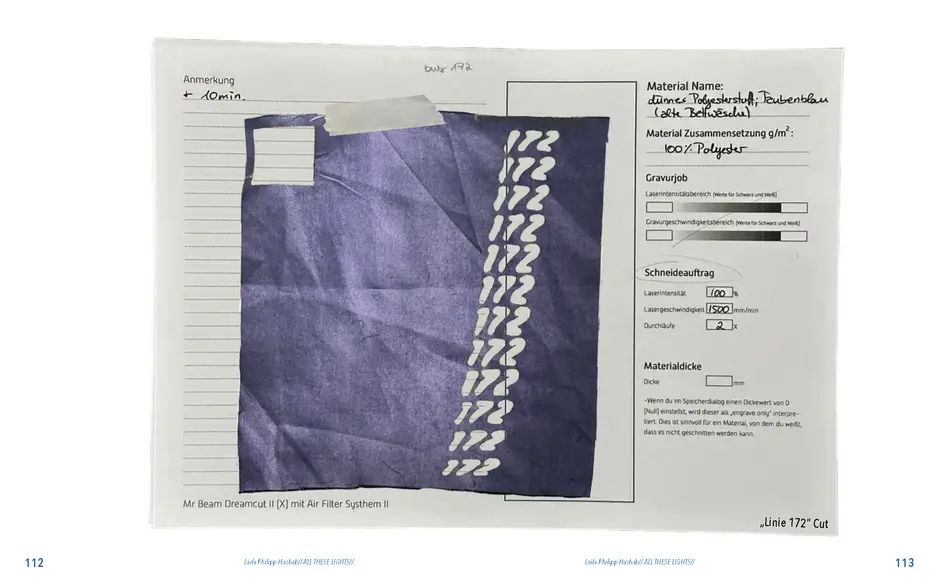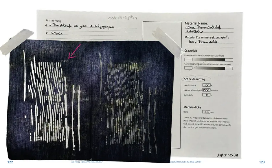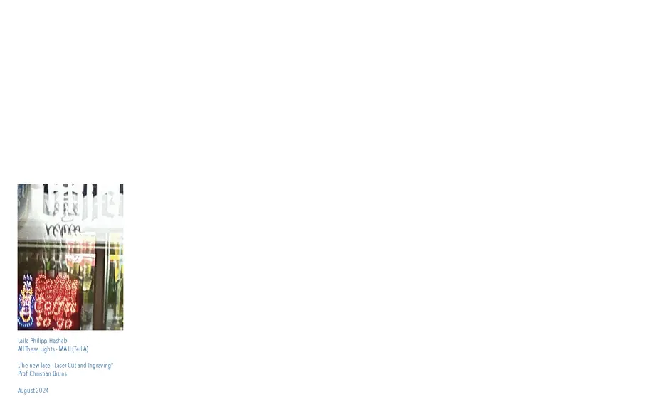 Dies alles sind Themen, Ideen, die ich für dieses Semesterprojekt hatte und an denen ich gearbeitet habe. An manchen Ideen mehr an anderen weniger. Mein Hauptthema ist die Weiterführung meiner Bachelor Thesis „VERZERRUNG//DISTORTION//“. Seit ca. 2017 fotografiere ich die verschiedensten Lichter in der Nacht, meist wenn ich unterwegs bin aber auch von Zuhause aus. Beim Fotografierprozess bewege ich meiner Kamera hin und her, sodass die Fotos verzerrt erscheinen. Es entstehen abstrakte Lichterformen. Mit diesen Formen habe ich gearbeitet, Prints erstellt, Schmuck, die Fotos und Prints mit einer KI unterstützten App weiter verzerrt und neue Muster/ Kunst/ Prints oder Strick Vorlagen erstellt. Dieses Thema habe ich auch schon im ersten Mastersemester während Apolda weitergeführt sowie jetzt auch in diesem Semester unter dem neuen Thema Namen „All These Lights“. Hier habe ich, für dieses Semesterthemadie abstrakten Lichterformen verwendet um damit Lasercut und Lasergravur Vorlagen zu erstellen. Zu Anfang habe ich mich besonders auf den Buchstabensalat oder Zahlensalat konzentriert. Damit sind verzerrte Schriftzüge und Zahlenan- zeigen zum Beispiel von Busnummern, Fahrplähne, Anzeigen von Tankstellenpreisen oder Verkehrsinformationen auf der Autobahn gemeint. Im weiteren Prozess habe ich auch mit verschiedenen abstrakten Formen gearbeitet. Teilweise kann man in den Formen auch etwas erkennen, wie zum Beispiel Schwäne oder Schmetterlinge.