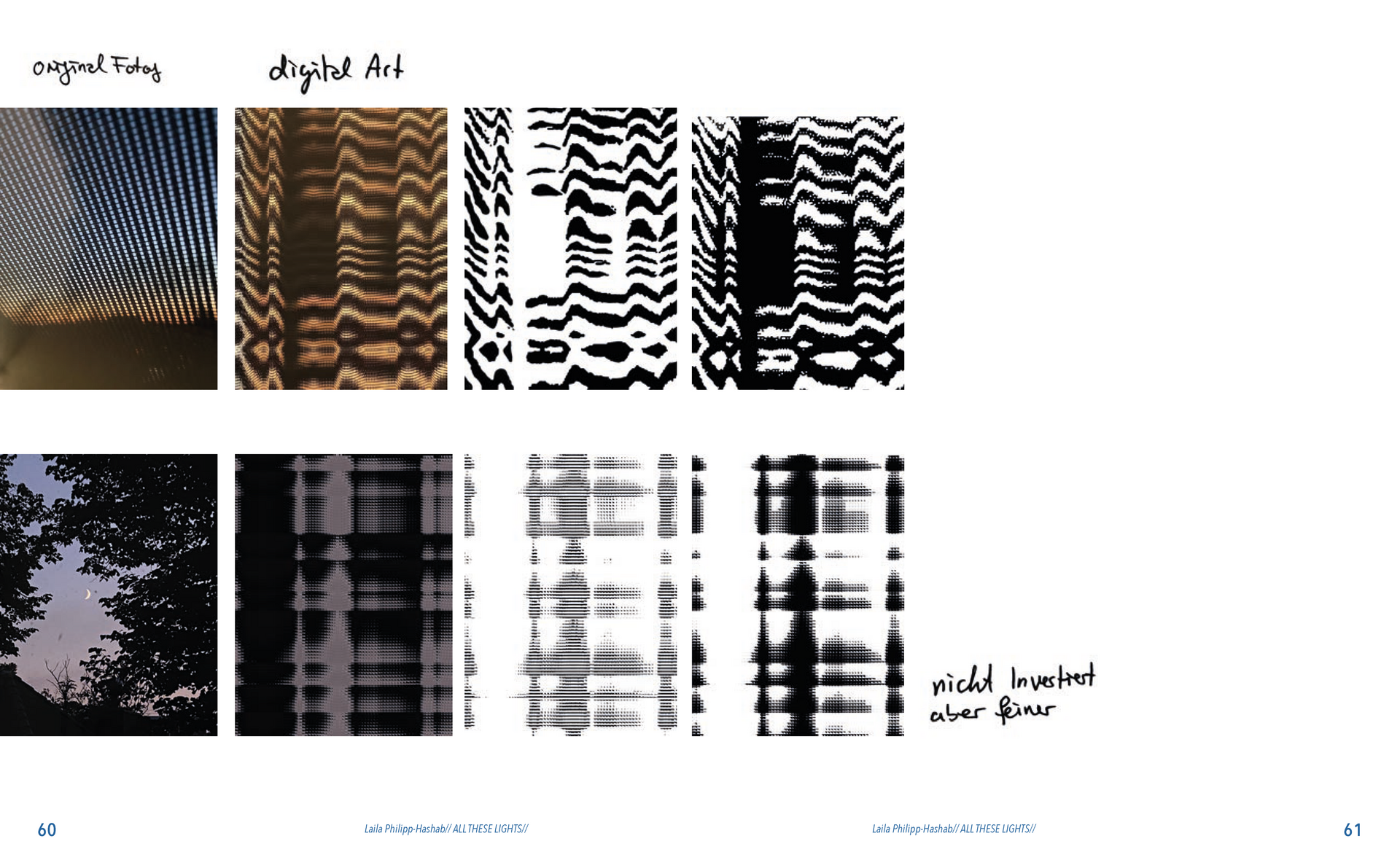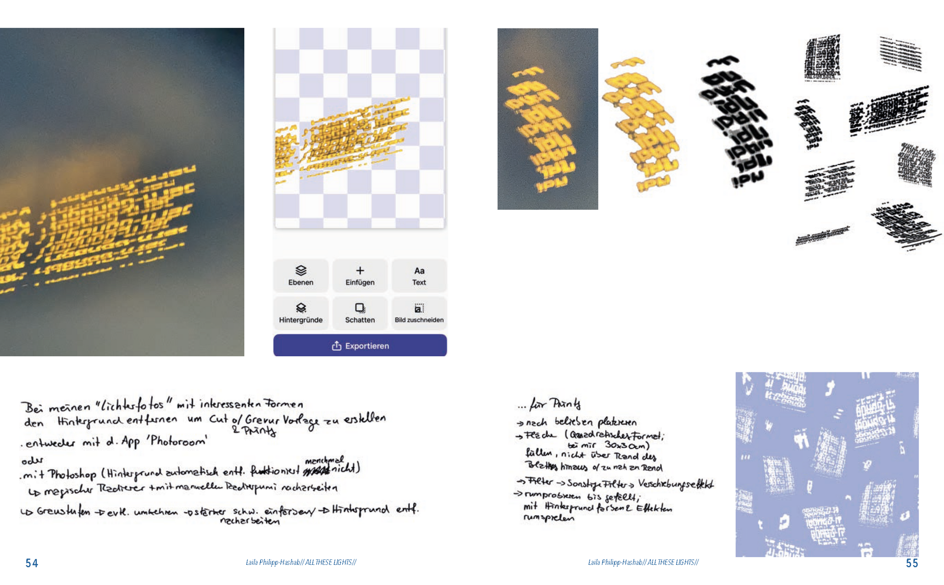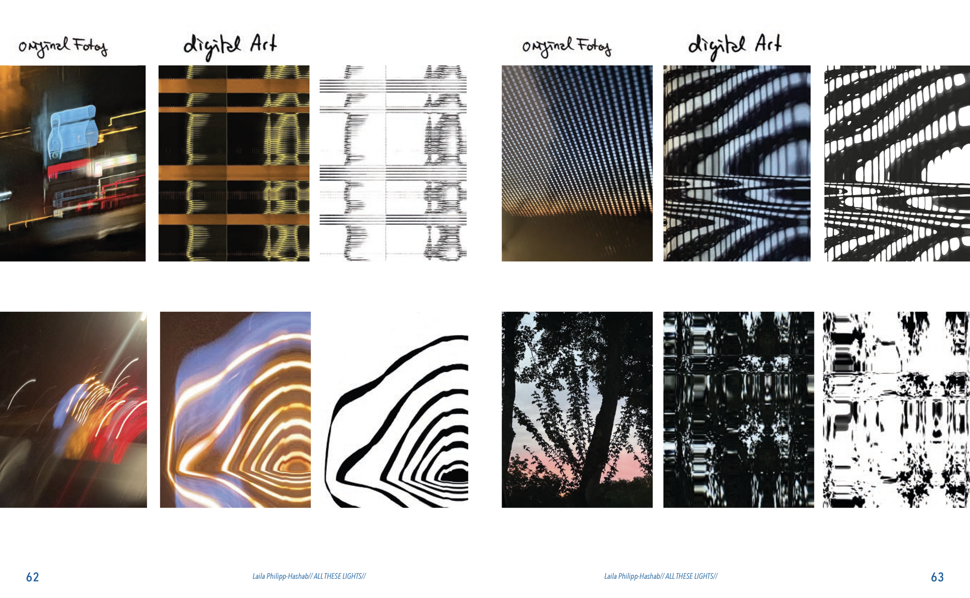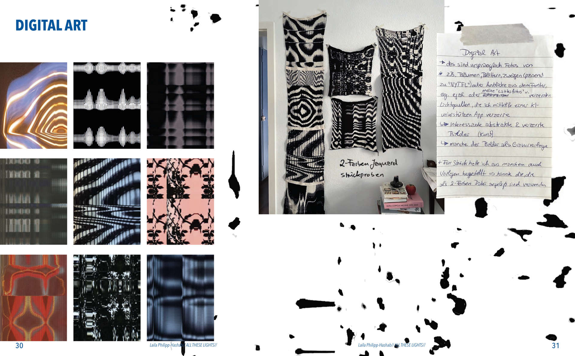 Abstrakte Formen von verzerrten Lichtern in der Nacht, Schatten von Blättern, Zeichnungen gemalt mit Tinte, abstrakte digitale Kunst, Experimente mit dem Scanner, optische Täuschungen und die Auseinandersetzung mit meiner deutsch-palästinensischen Herkunft.