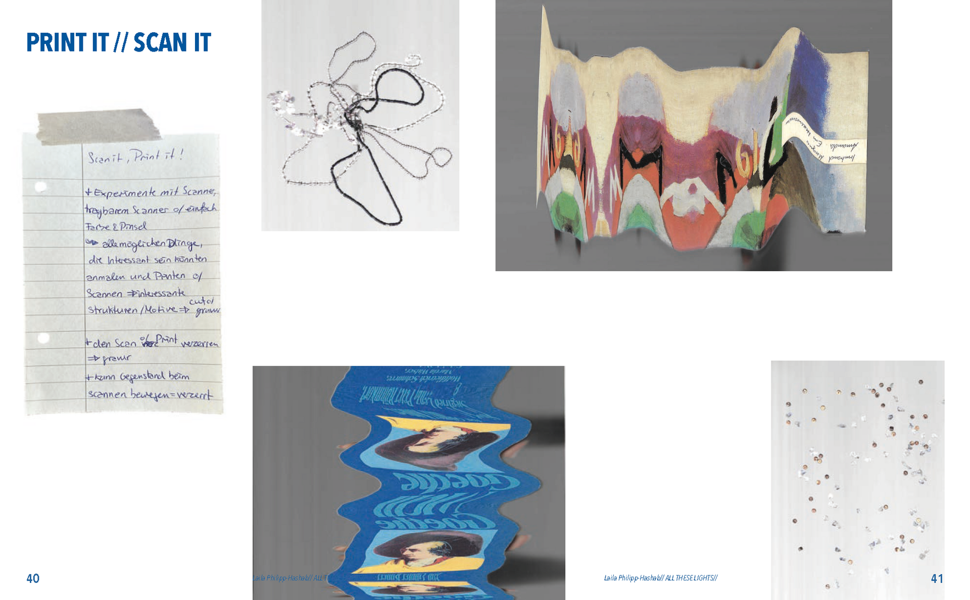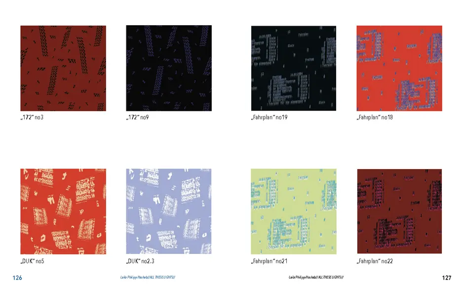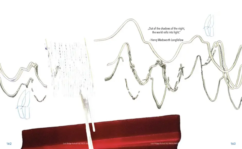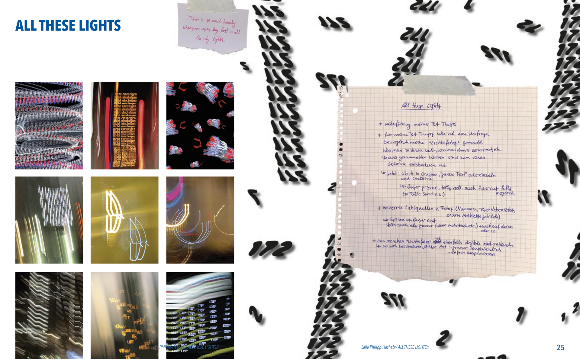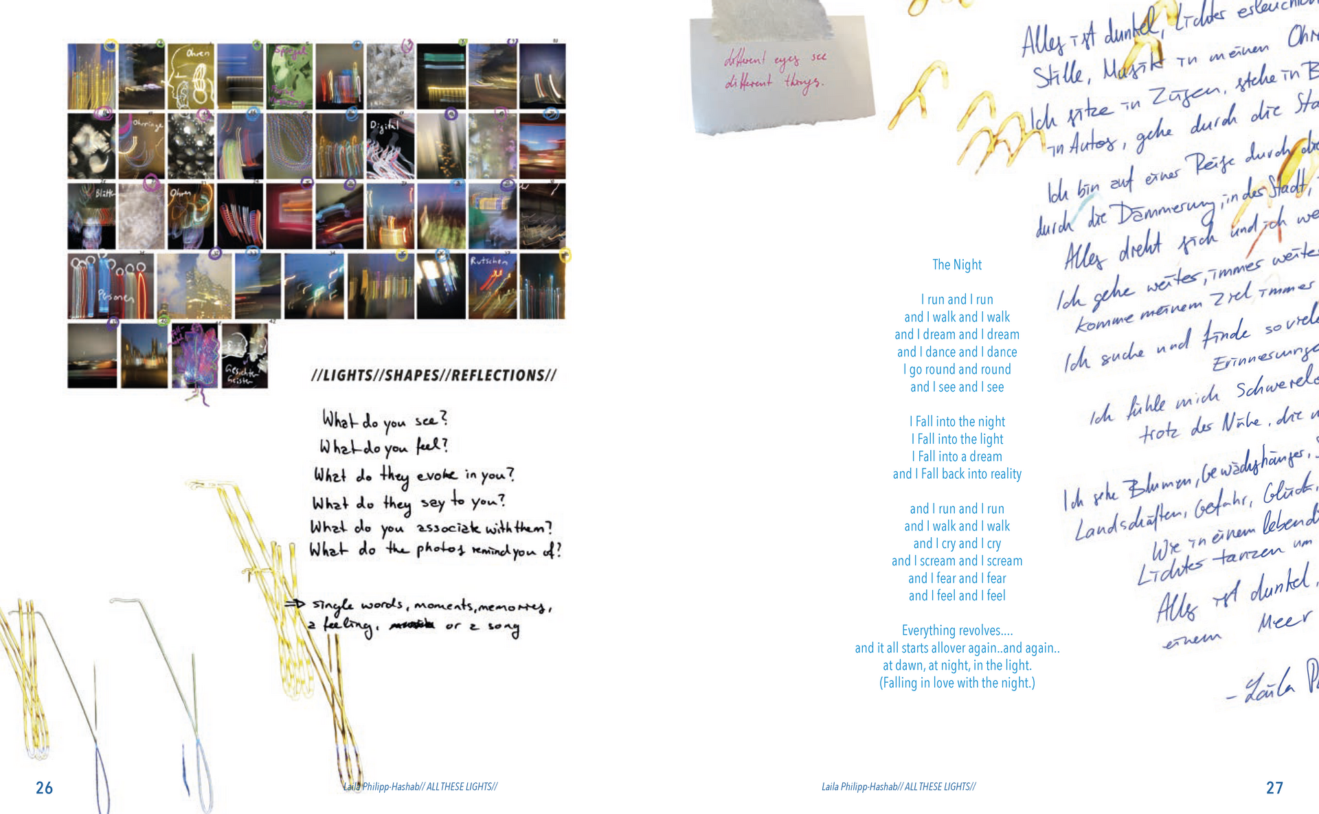 Abstrakte Formen von verzerrten Lichtern in der Nacht, Schatten von Blättern, Zeichnungen gemalt mit Tinte, abstrakte digitale Kunst, Experimente mit dem Scanner, optische Täuschungen und die Auseinandersetzung mit meiner deutsch-palästinensischen Herkunft.