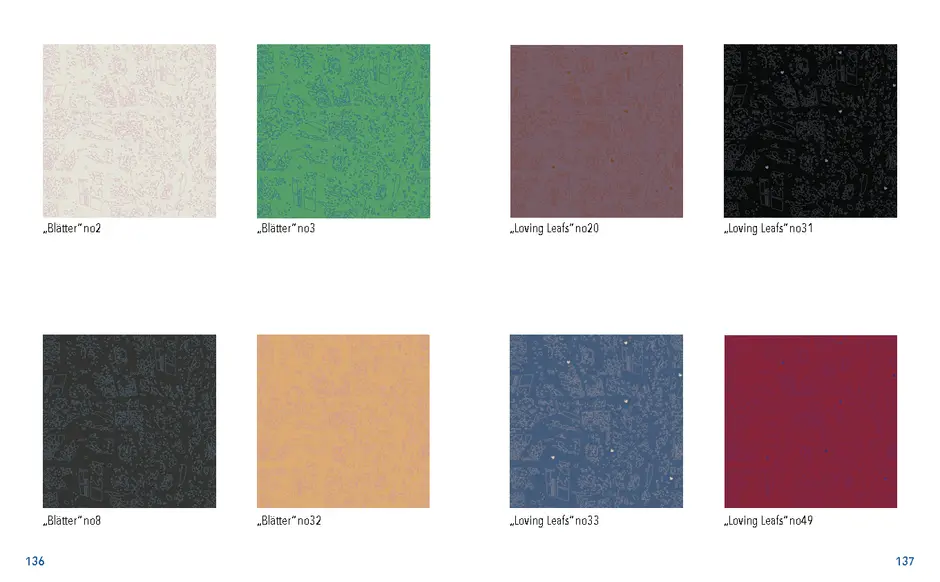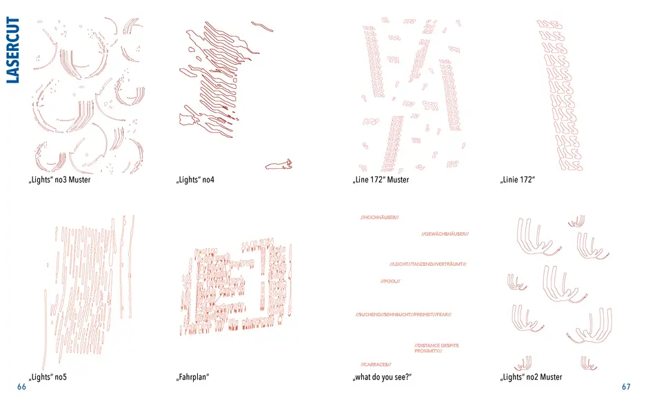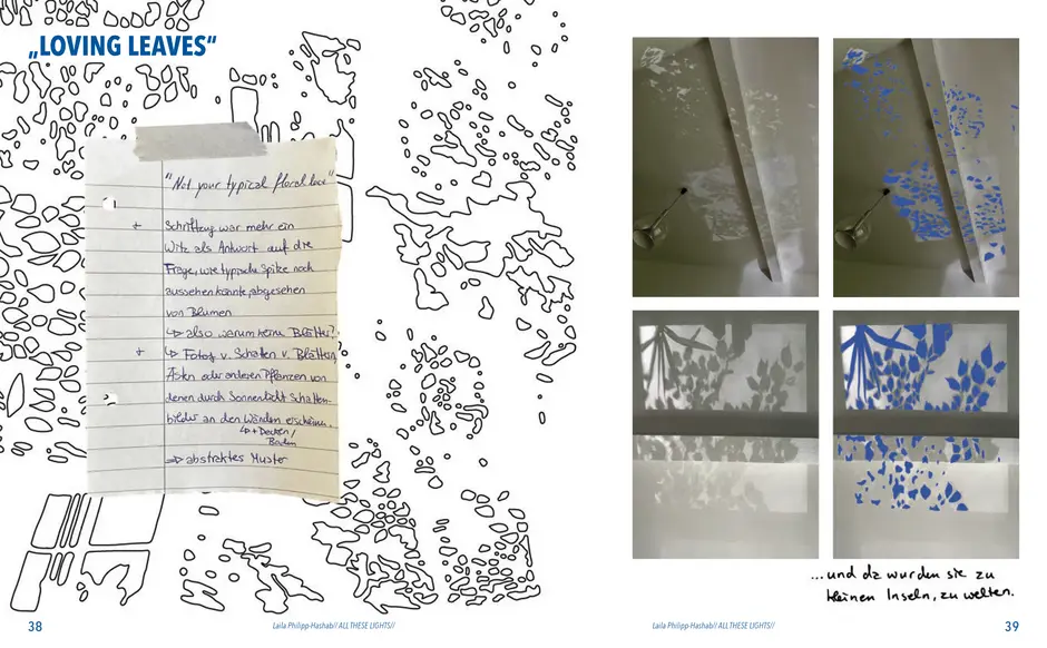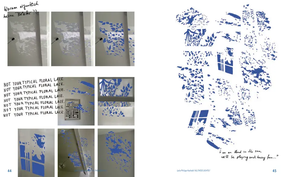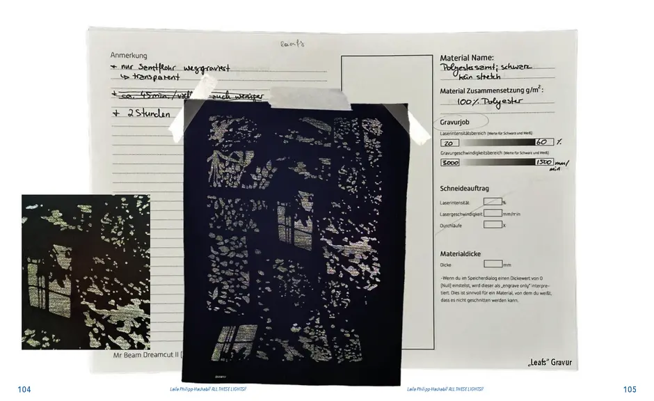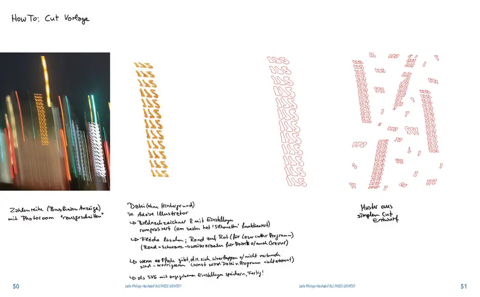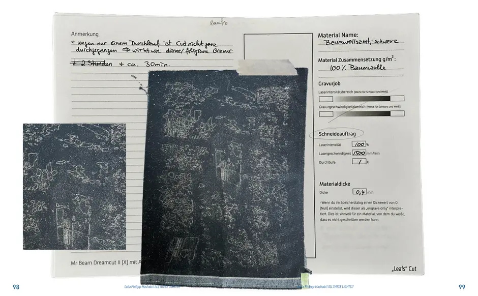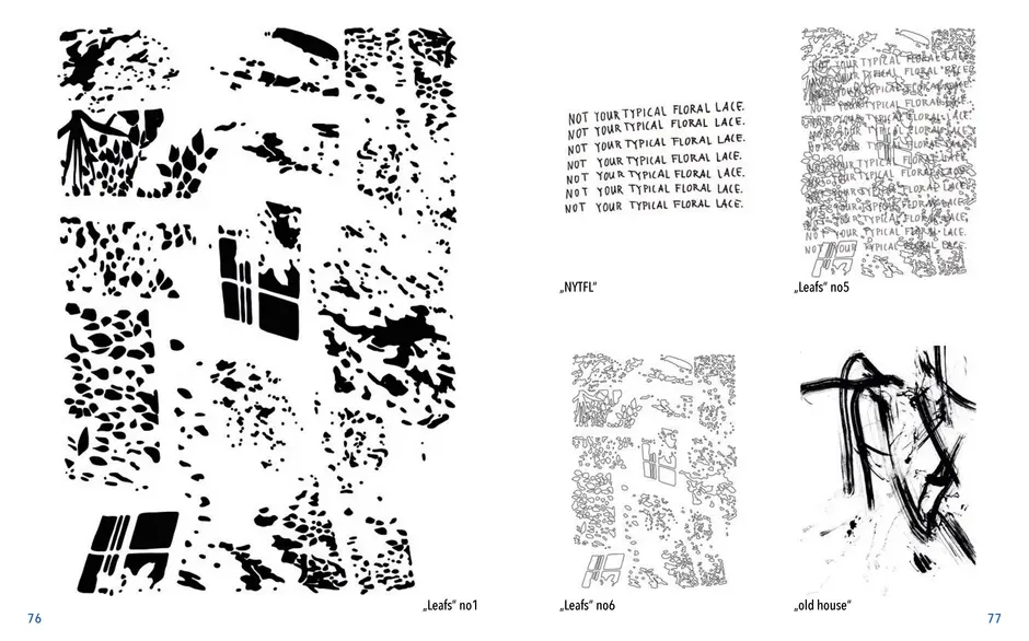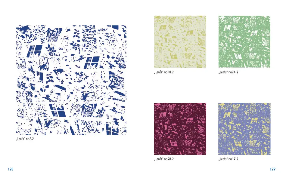 Gefunden habe ich dabei nichts Passendes aber ich habe mich von ein paar Worten inspirieren lassen, die durch das- Wort „Leaf“ ersetzt wurden. Das sind zum Beispiel Life, Live oder Love. Mir sind noch Laugh und Leave eingefallen. Aufder Grundlage dieser Worte sind mir ein paar witzige Sprüche eingefallen, manche auch angelehnt an bekannte Songtitel. Während der Arbeit an den Cut- und Gravur-Vorlagen ist mir bei den beiden Themen „All These Lights“ und „Loving Lea-ves“ die Idee gekommen, aus manchen der Vorlagen Printentwürfe zu erstellten. Dabei sind einige Entwürfe zusammengekommen (S.126-137).