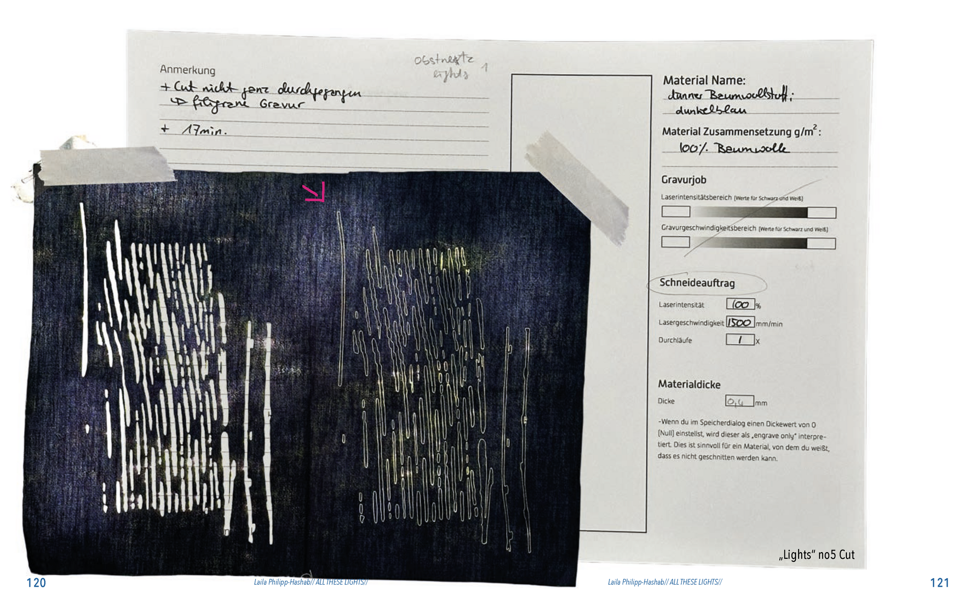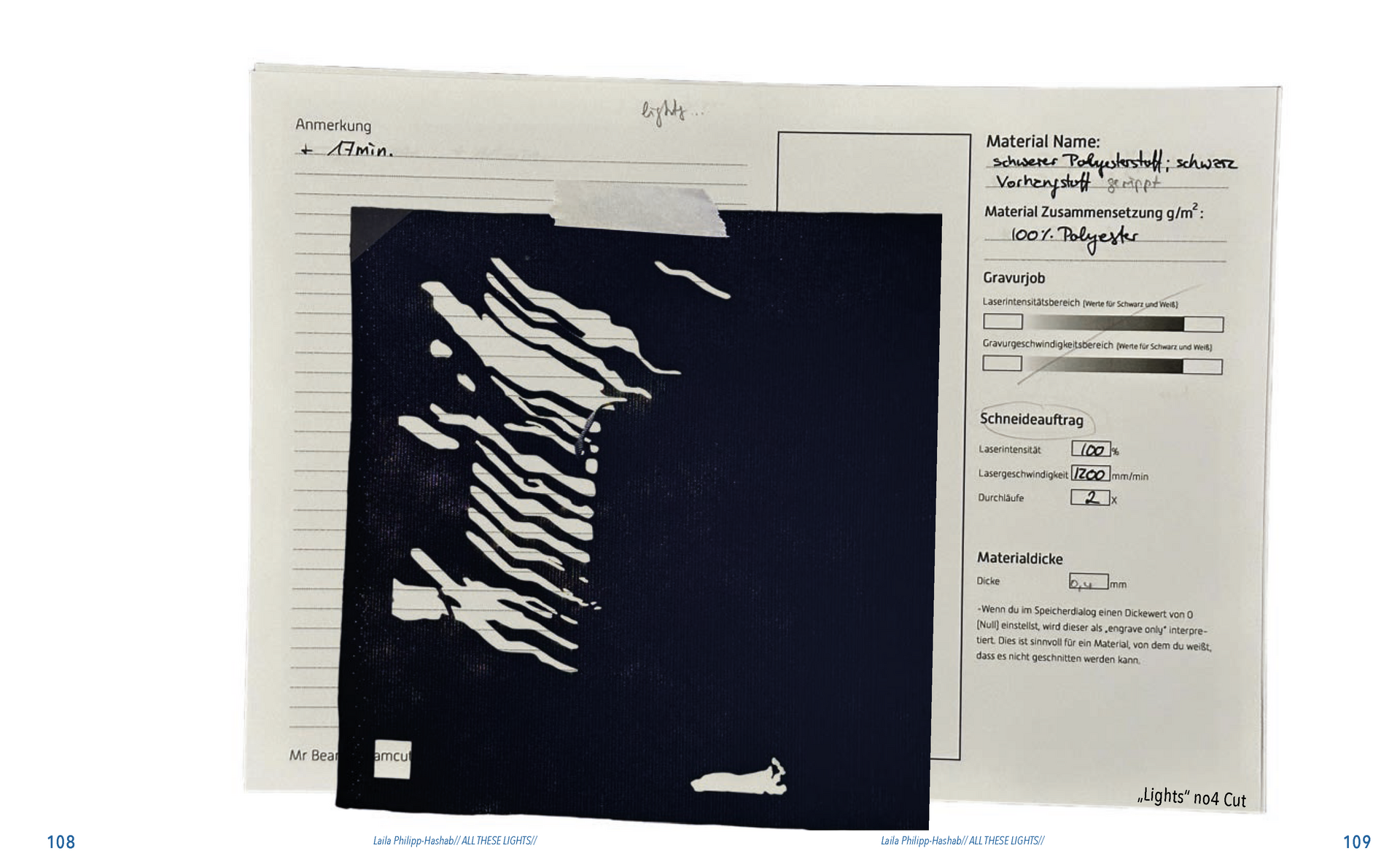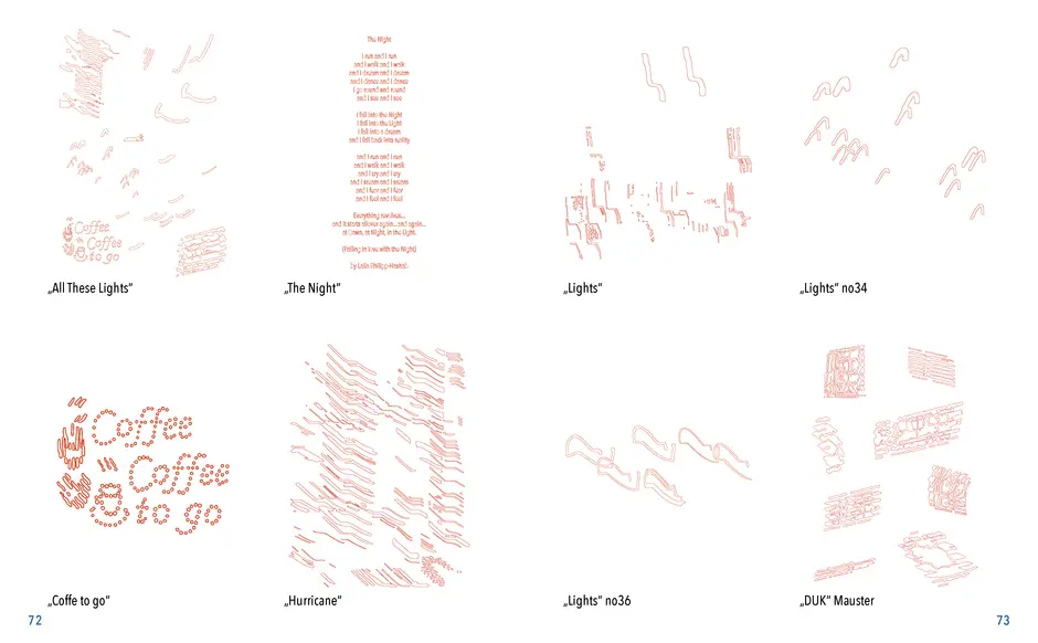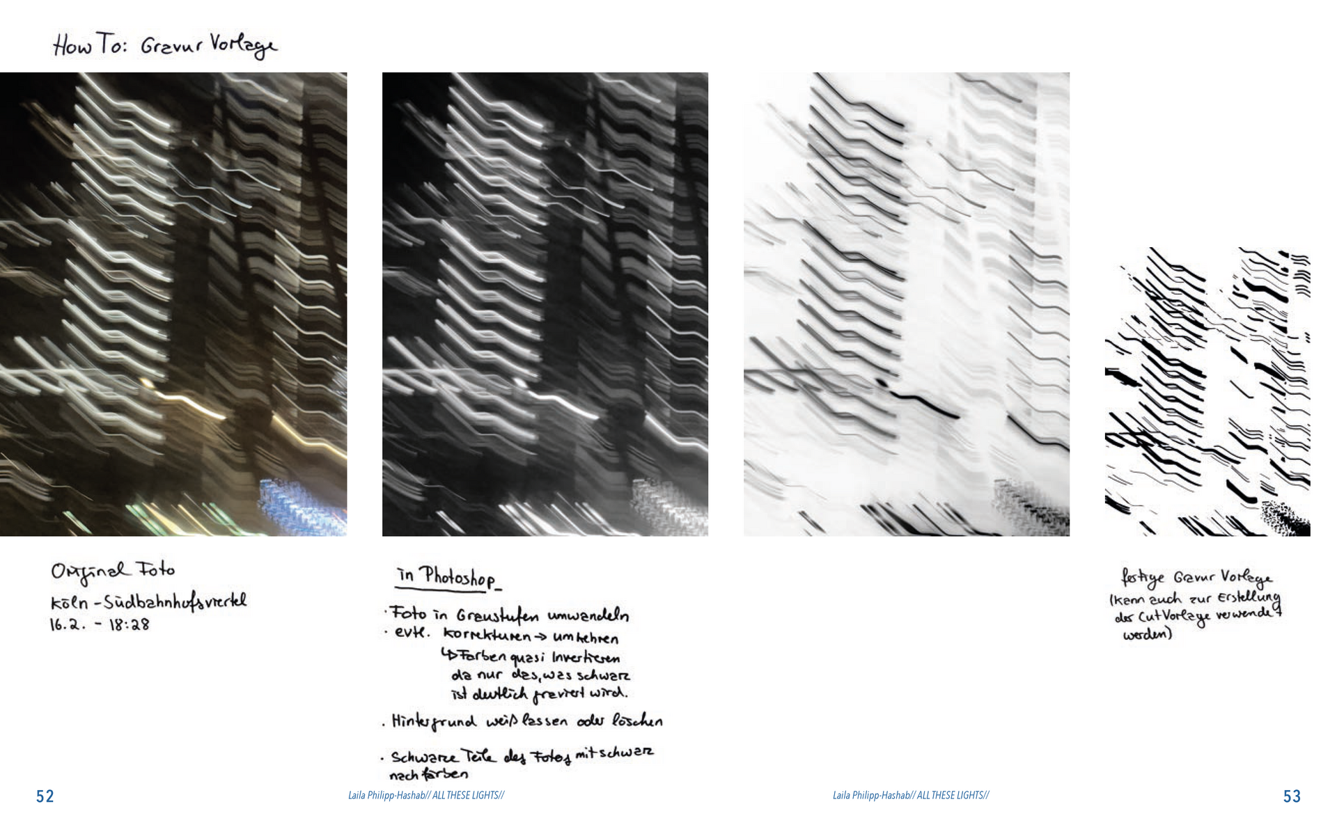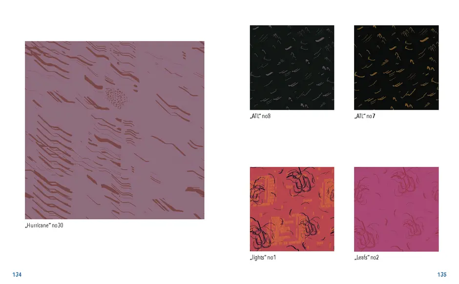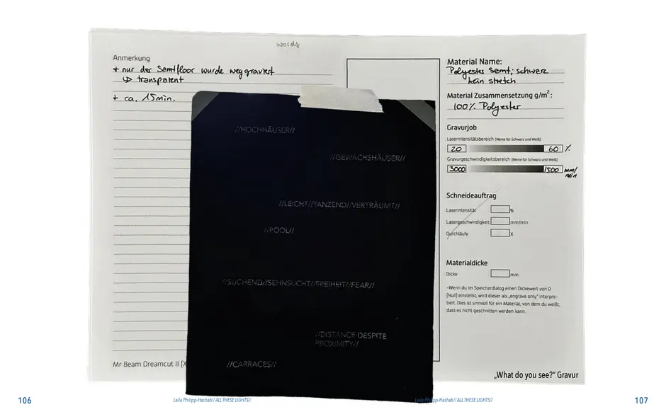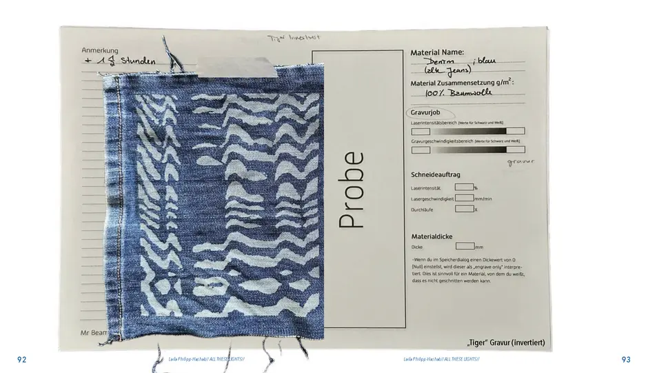 Gefunden habe ich dabei nichts Passendes aber ich habe mich von ein paar Worten inspirieren lassen, die durch das- Wort „Leaf“ ersetzt wurden. Das sind zum Beispiel Life, Live oder Love. Mir sind noch Laugh und Leave eingefallen. Aufder Grundlage dieser Worte sind mir ein paar witzige Sprüche eingefallen, manche auch angelehnt an bekannte Songtitel. Während der Arbeit an den Cut- und Gravur-Vorlagen ist mir bei den beiden Themen „All These Lights“ und „Loving Lea-ves“ die Idee gekommen, aus manchen der Vorlagen Printentwürfe zu erstellten. Dabei sind einige Entwürfe zusammengekommen (S.126-137).