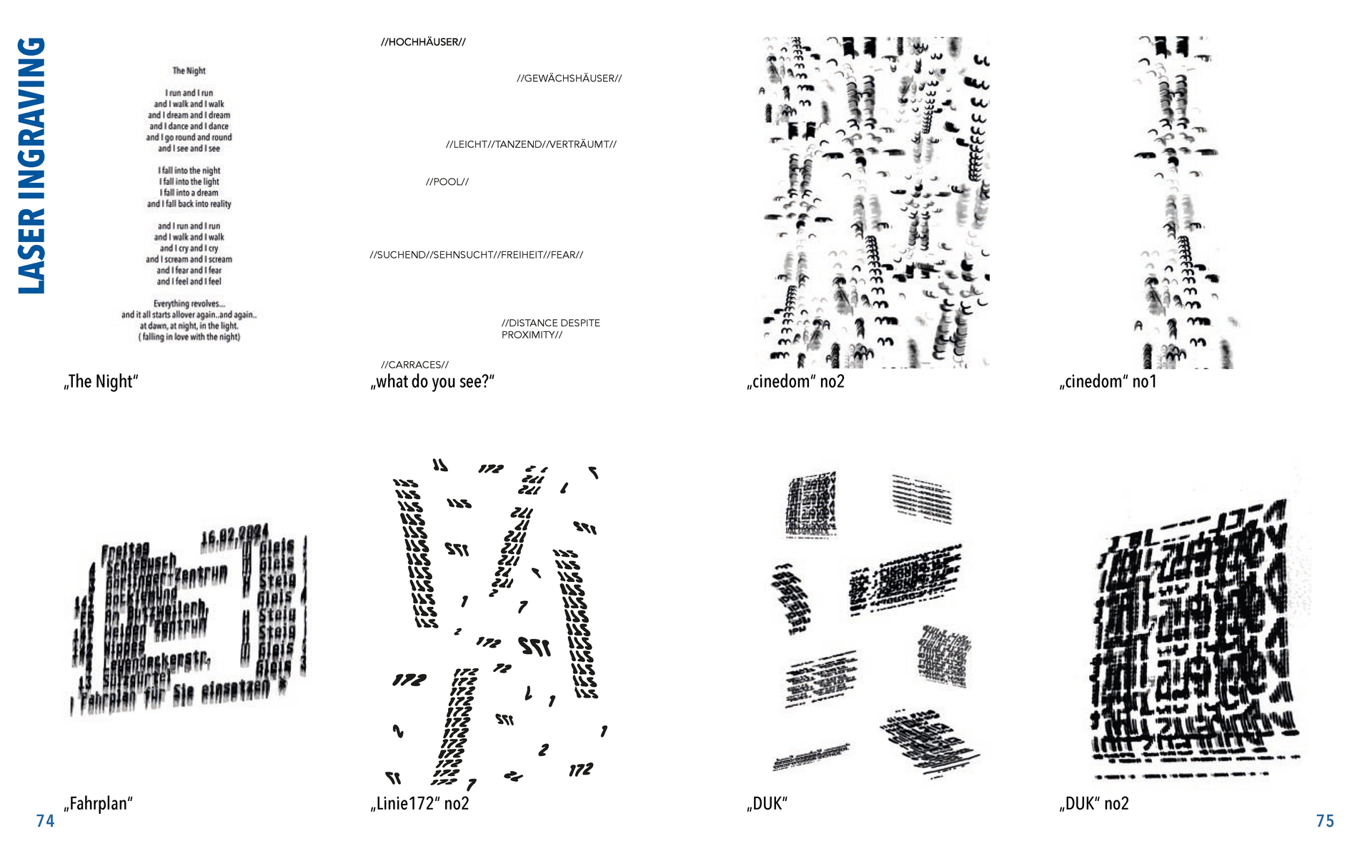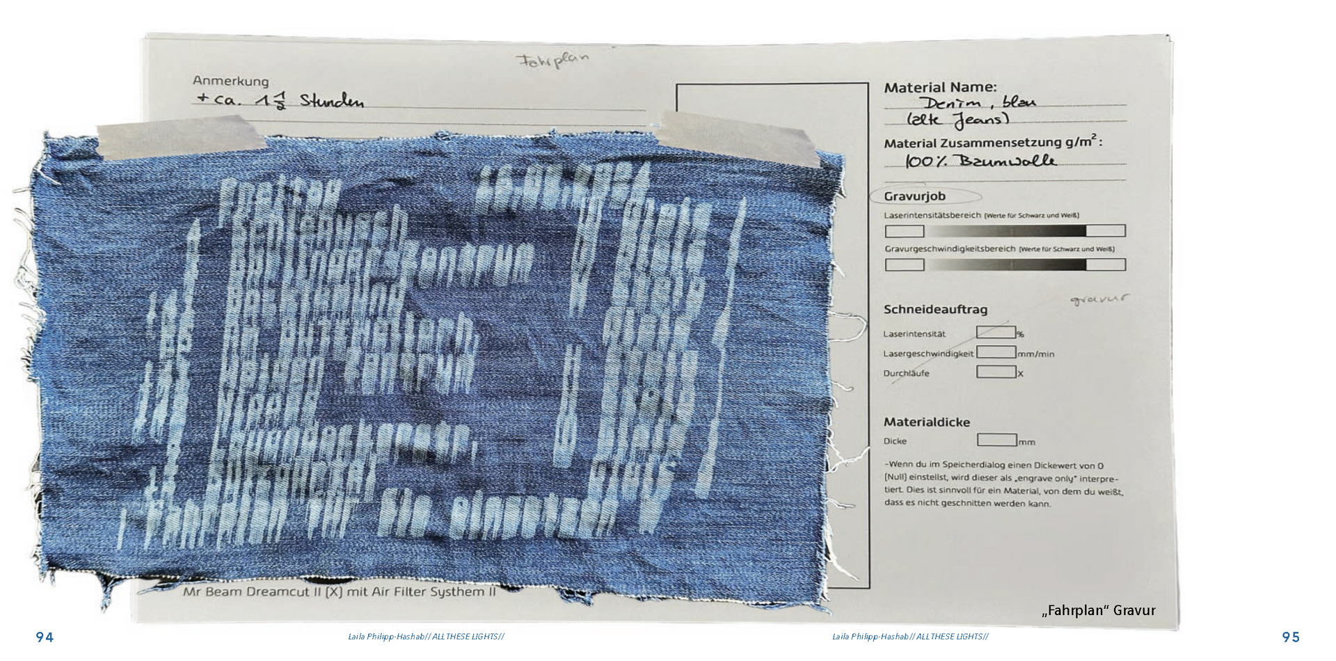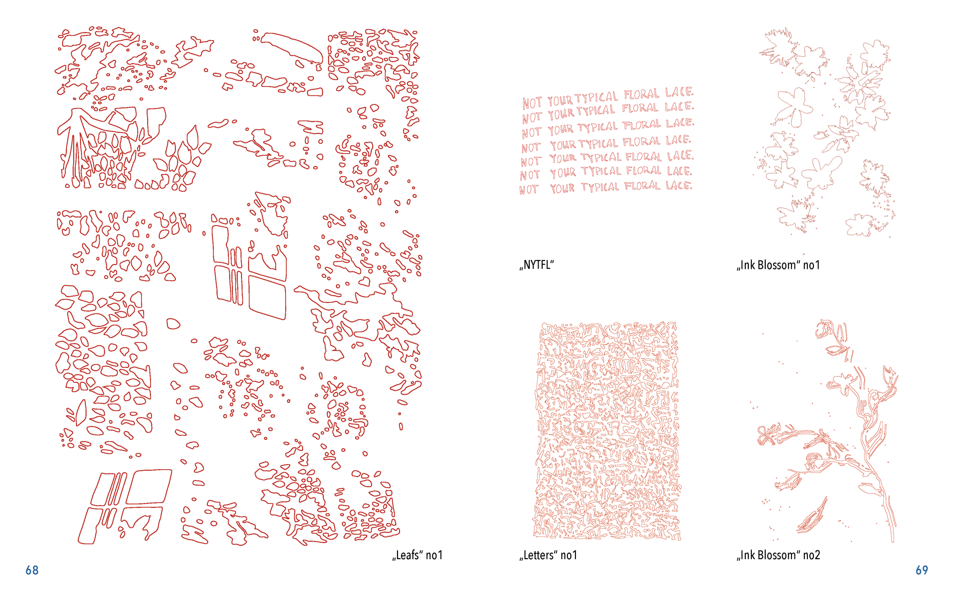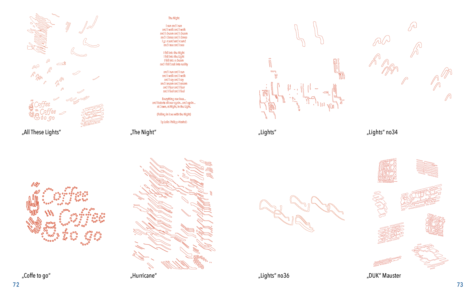 Gefunden habe ich dabei nichts Passendes aber ich habe mich von ein paar Worten inspirieren lassen, die durch das- Wort „Leaf“ ersetzt wurden. Das sind zum Beispiel Life, Live oder Love. Mir sind noch Laugh und Leave eingefallen. Aufder Grundlage dieser Worte sind mir ein paar witzige Sprüche eingefallen, manche auch angelehnt an bekannte Songtitel. Während der Arbeit an den Cut- und Gravur-Vorlagen ist mir bei den beiden Themen „All These Lights“ und „Loving Lea-ves“ die Idee gekommen, aus manchen der Vorlagen Printentwürfe zu erstellten. Dabei sind einige Entwürfe zusammengekommen (S.126-137).