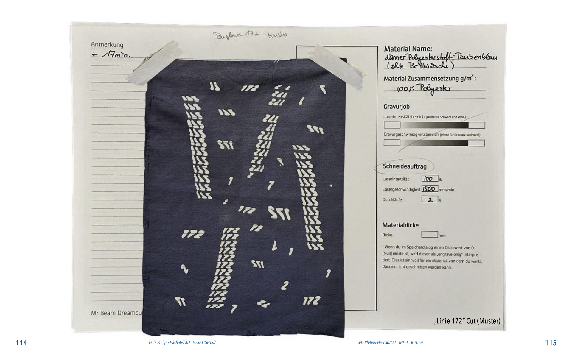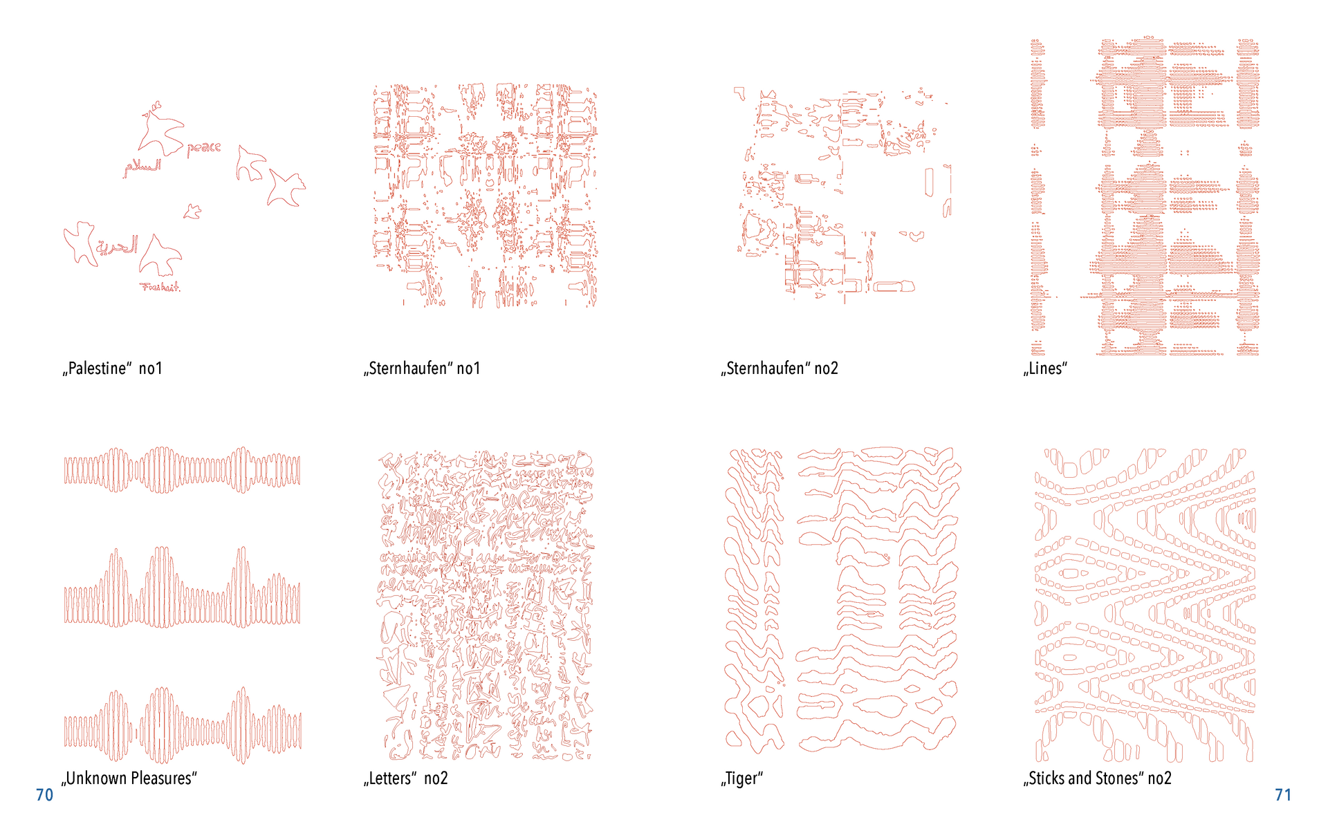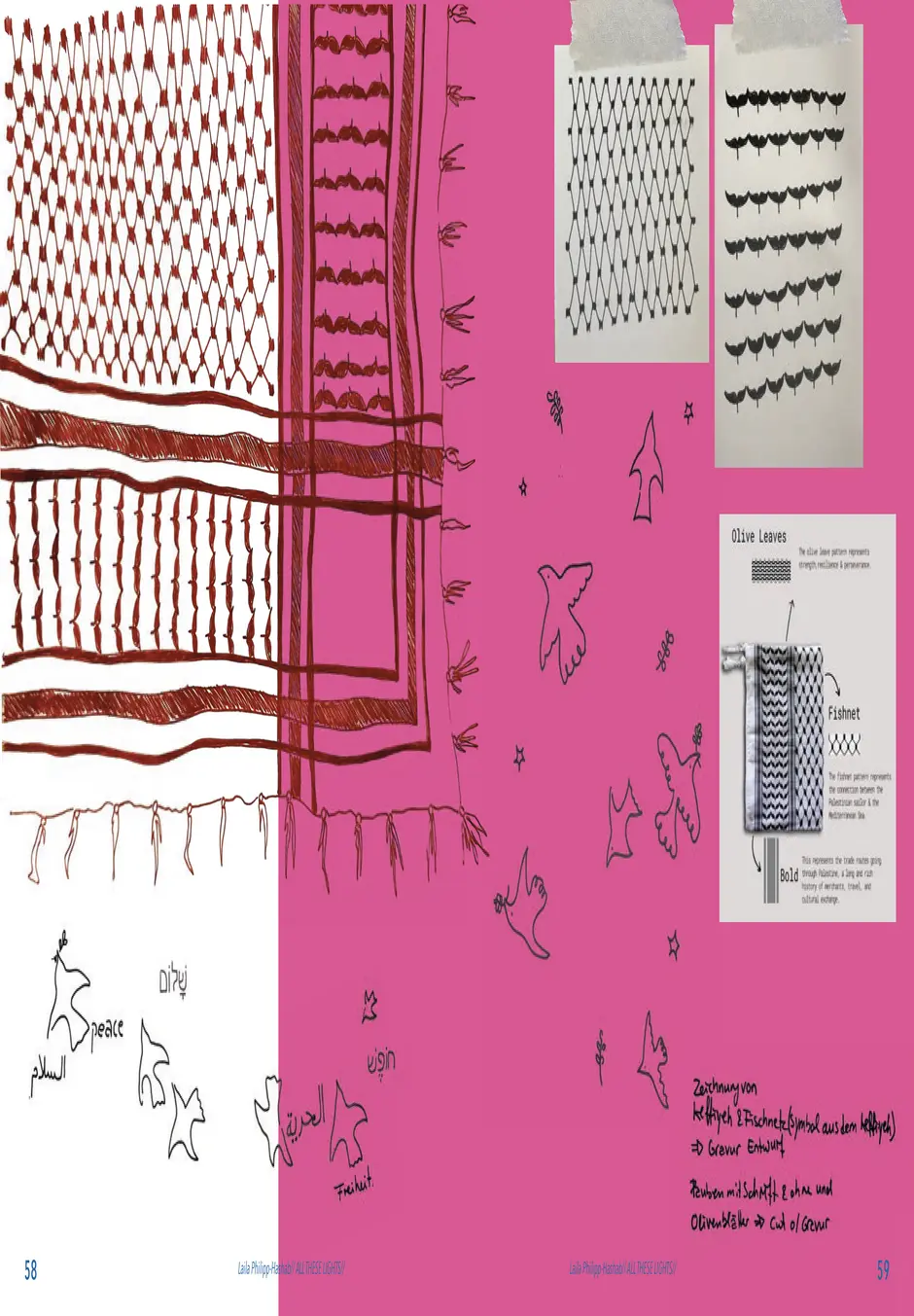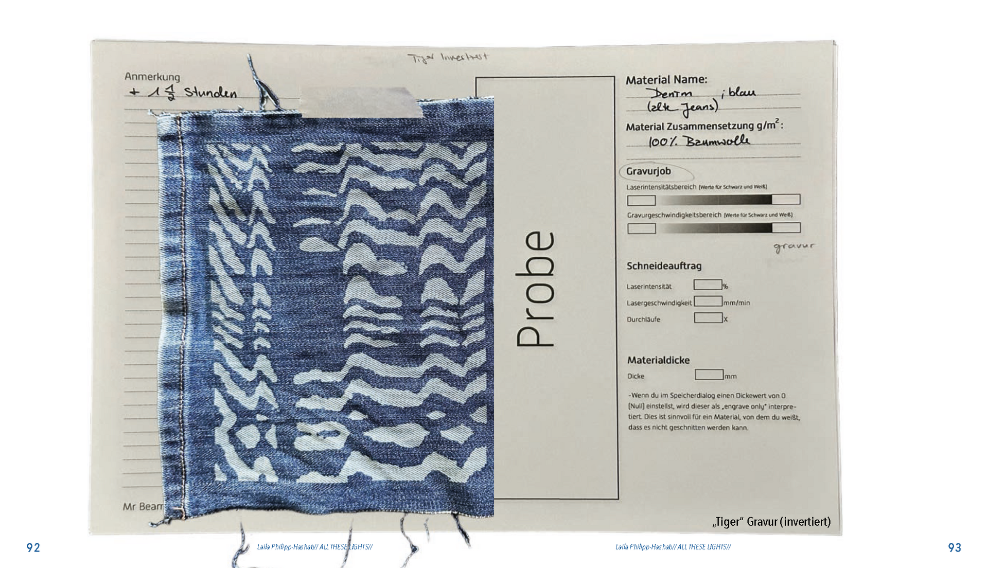 Gefunden habe ich dabei nichts Passendes aber ich habe mich von ein paar Worten inspirieren lassen, die durch das- Wort „Leaf“ ersetzt wurden. Das sind zum Beispiel Life, Live oder Love. Mir sind noch Laugh und Leave eingefallen. Aufder Grundlage dieser Worte sind mir ein paar witzige Sprüche eingefallen, manche auch angelehnt an bekannte Songtitel. Während der Arbeit an den Cut- und Gravur-Vorlagen ist mir bei den beiden Themen „All These Lights“ und „Loving Lea-ves“ die Idee gekommen, aus manchen der Vorlagen Printentwürfe zu erstellten. Dabei sind einige Entwürfe zusammengekommen (S.126-137).
