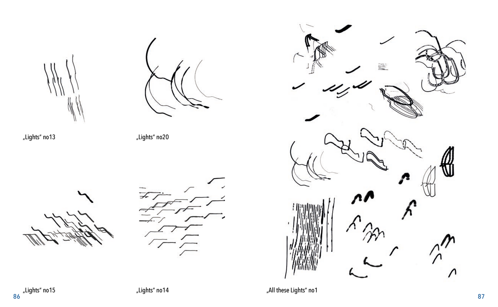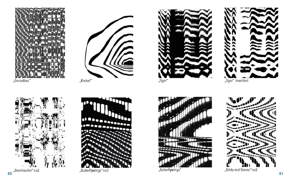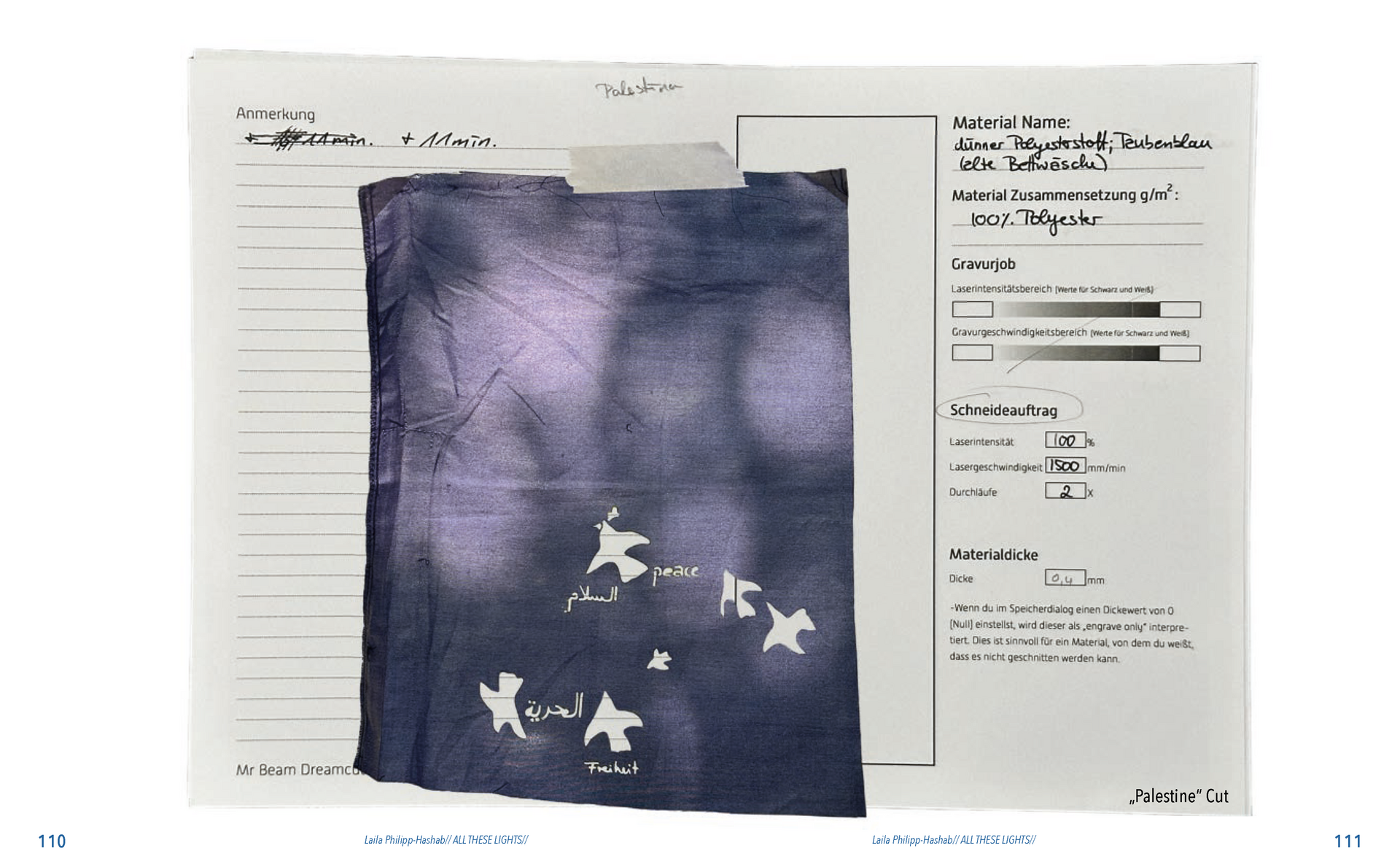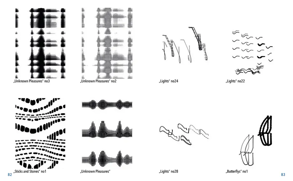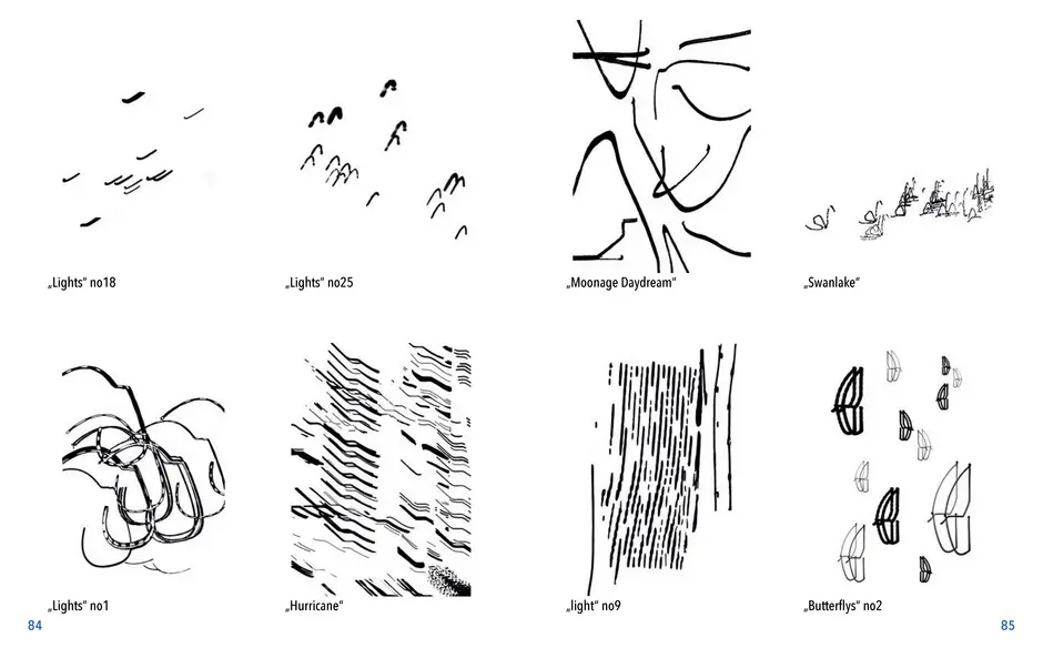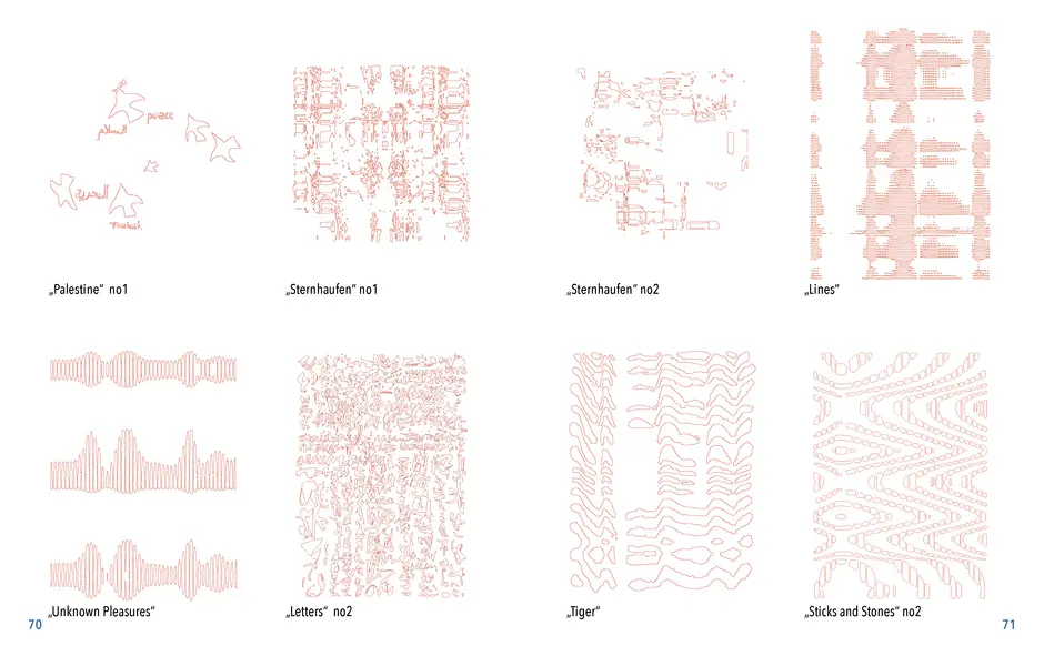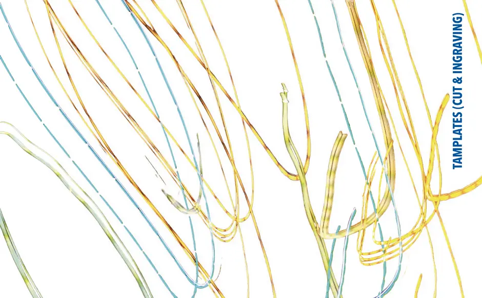 Gefunden habe ich dabei nichts Passendes aber ich habe mich von ein paar Worten inspirieren lassen, die durch das- Wort „Leaf“ ersetzt wurden. Das sind zum Beispiel Life, Live oder Love. Mir sind noch Laugh und Leave eingefallen. Aufder Grundlage dieser Worte sind mir ein paar witzige Sprüche eingefallen, manche auch angelehnt an bekannte Songtitel. Während der Arbeit an den Cut- und Gravur-Vorlagen ist mir bei den beiden Themen „All These Lights“ und „Loving Lea-ves“ die Idee gekommen, aus manchen der Vorlagen Printentwürfe zu erstellten. Dabei sind einige Entwürfe zusammengekommen (S.126-137).