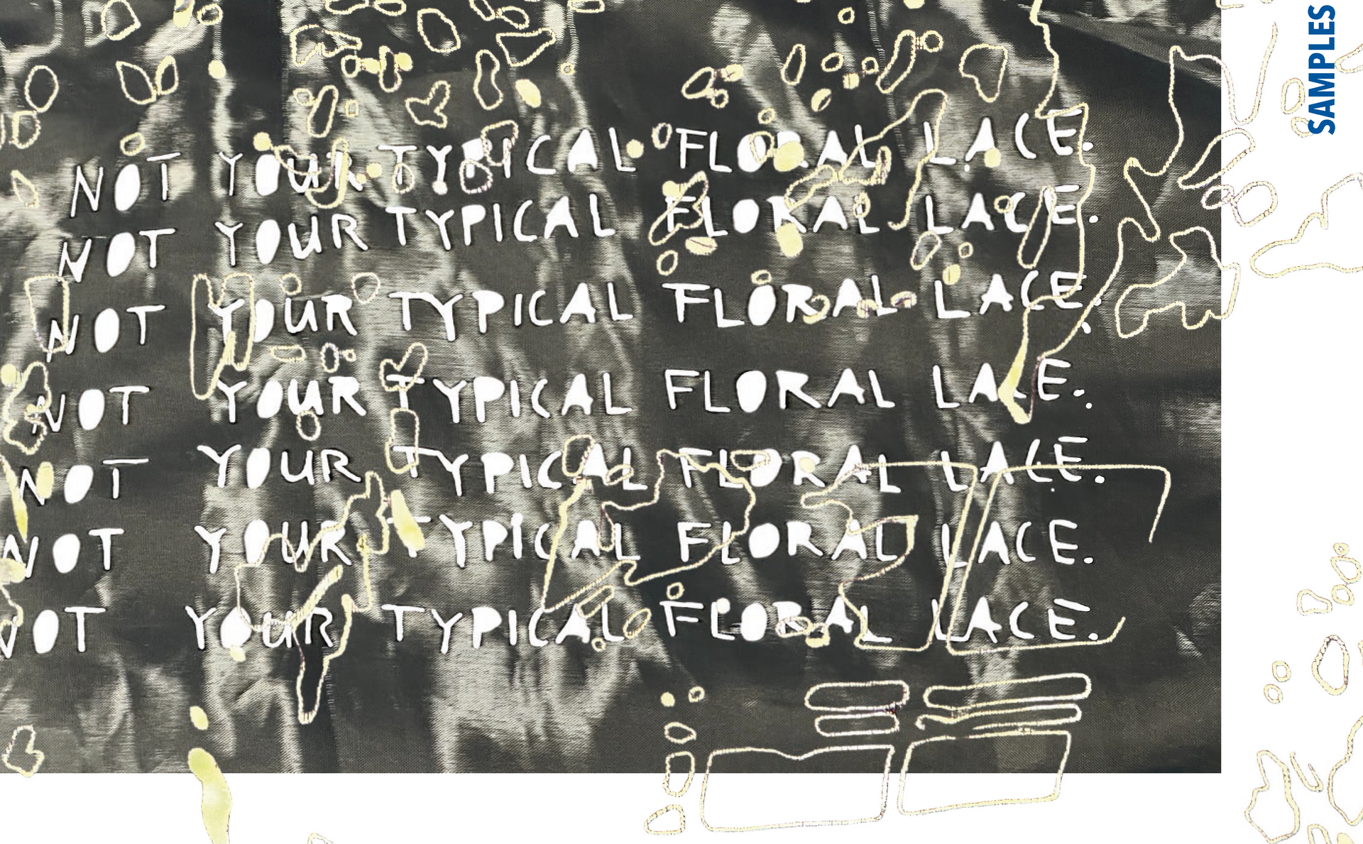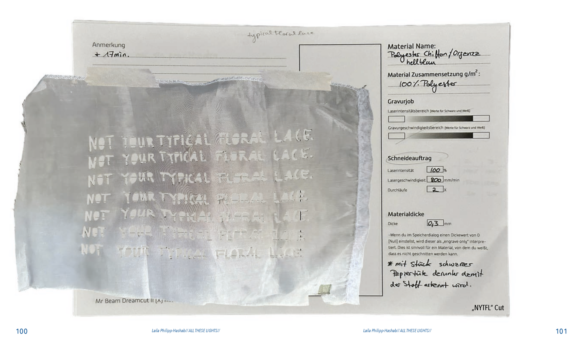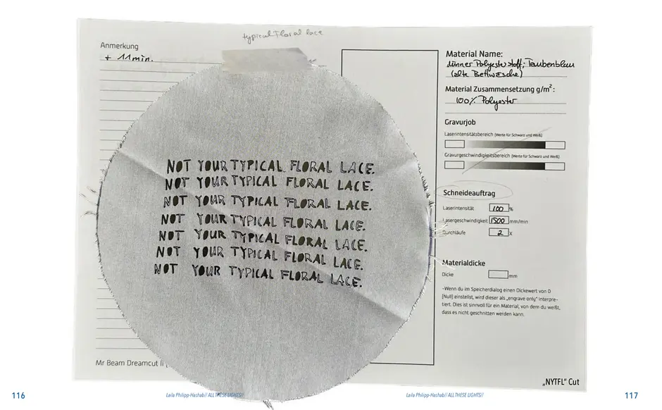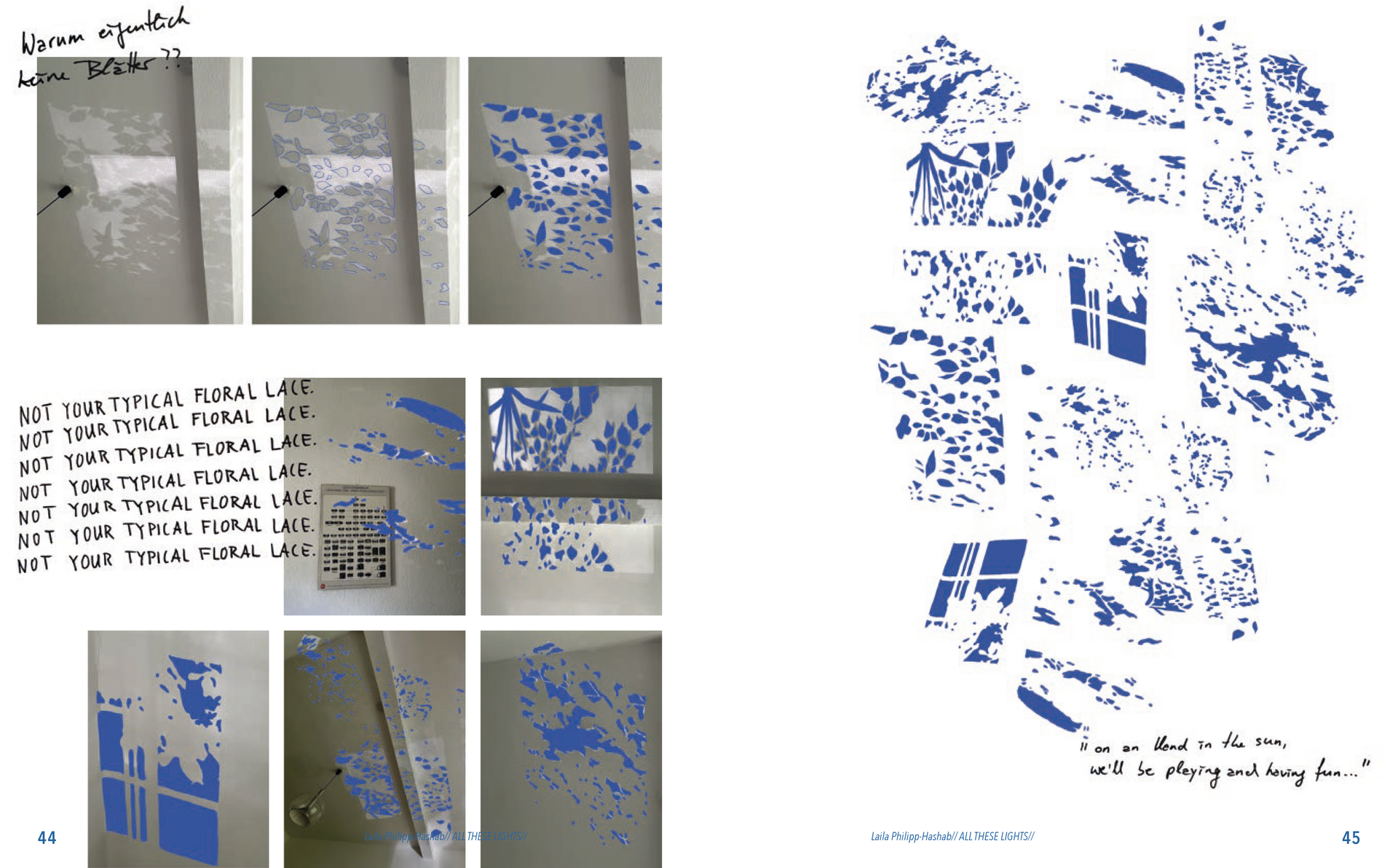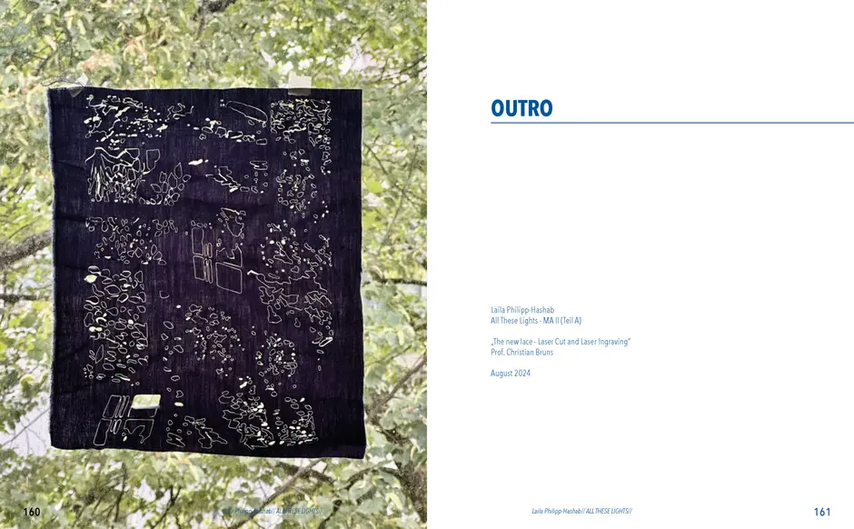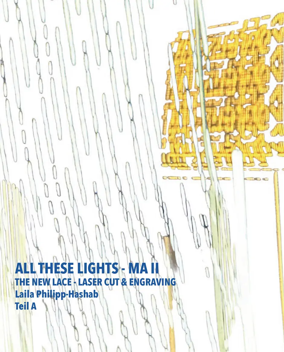 Der Schriftzug „Not Your Typical Floral Lace“ ist als erstes bei diesem Thema entstanden und war eigentlich nur ein Scherz. Gemeint war er als Antwort auf die Frage, wie Spitzte noch aussehen könnte, abgesehen von den typischen Blumen und meiner eigenen Frage: „Warum eigentlich keine Blätter?“ Also wurden es Blätter. Als nächstes habe ich die Schattenfotografiert,, die durch das hereinfallende Sonnenlicht an Wänden oder Decken, draußen am Boden oder an Hausfassaden entstehen. In Photoshop habe ich auf meinem Ipad entweder die Schatten der Blätter und manchmal auch die Zwischenräume farbig ausgemalt. Daraus sind verschiedene abstrakte Muster entstanden, die ich zu einem großen Muster zusammengesetzt habe. Aus diesem Muster habe ich jeweils einen Lasercut und einen Lasergravur Entwurf erstellt.