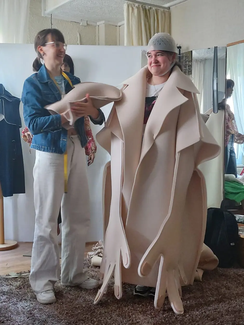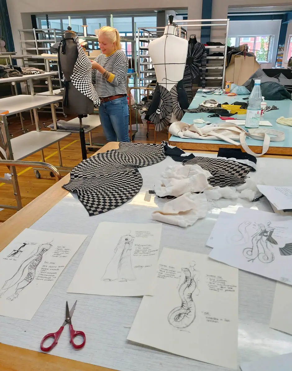 Der Apolda Strick- und Textil-Workshop 2021 schafft einen Rahmen, sich kritisch mit Fragen nach Produktion und Nachhaltigkeit, Gegenwart und Zukunft auseinanderzusetzen. Designer*innen haben heute die Aufgabe, eigene Materialsammlungen, Silhouetten, Formen und Flächen herauszuarbeiten und diese zu einer stimmigen und nachhaltigen Kollektion zusammenzuführen. Im Mittelpunkt des Projektes steht die Verknüpfung von Industrie und Handwerk, von traditionellem Wissen und Technologie. Besuche in dem Kunsthaus Apolda und beteiligten Unternehmen, Feedbackgespräche mit Elke Giese, Elke Dietrich TW und Karin Veit und abschließende Modenschau runden die Woche ab.