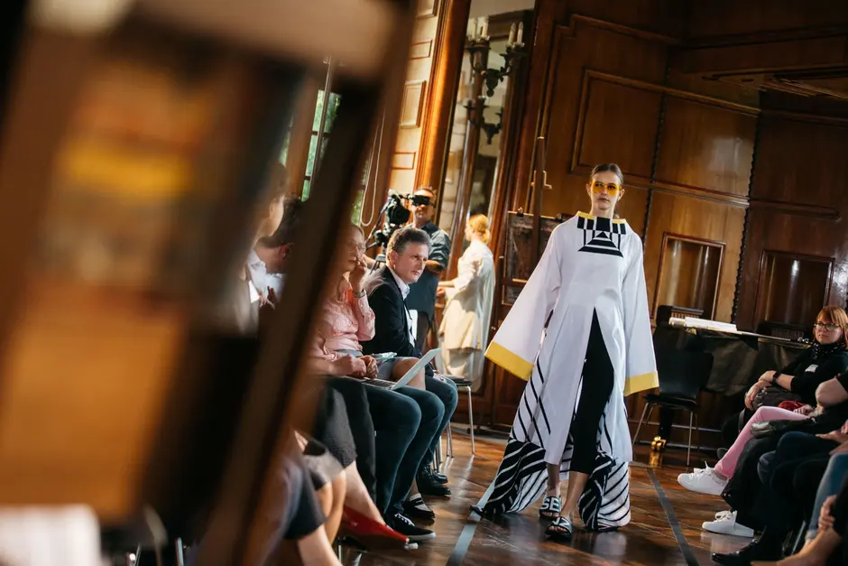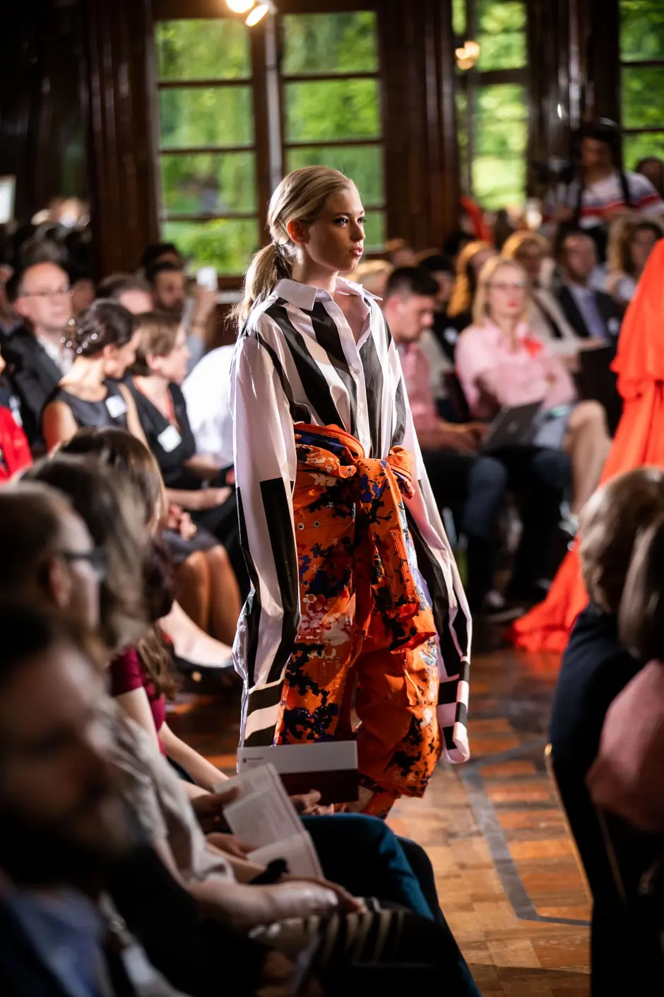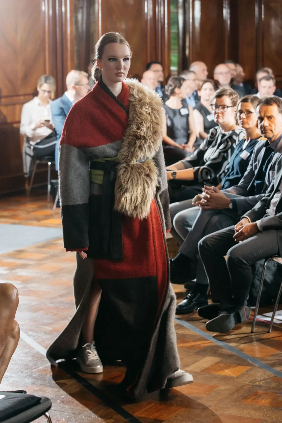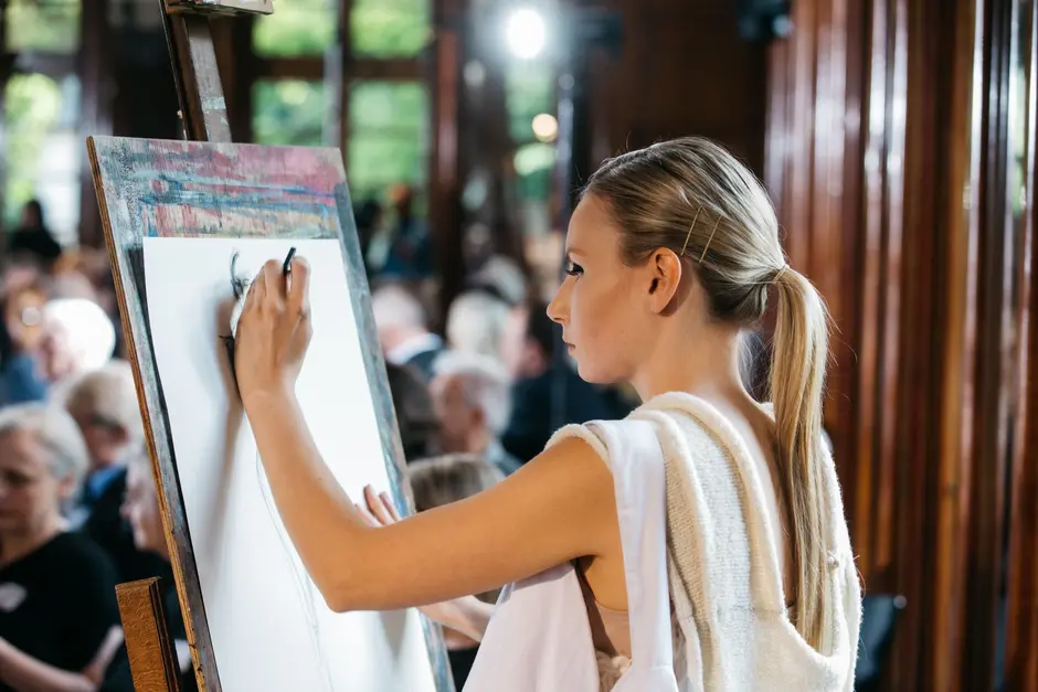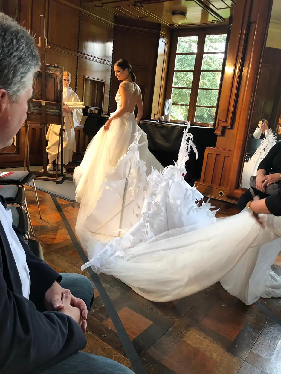 Es ertönte klassische Musik und Modedesignstudentinnen in weißen Kimonos betreten den Laufsteg. Sie trugen Zeichenblöcke unter den Armen und begann in den nächsten 35 Minuten freihand zu zeichnen, während sie sich von der Modenschau, von der Musik und der Atmosphäre inspirieren ließen. Es ist erstaunlich, was sie mit einem Blatt Papier, ein paar Stiften und ein paar Minuten Zeit alles einfangen. Ein paar Striche und Konturen zeichnen sich ab, ein paar Schattierungen bestimmen den Faltenwurf, ein paar Akzente machen den Feinschliff aus. Die Farben geben Einblick in die Fantasie der Designer. Ein lebendiges Bild ist entstanden. Es ist der Entwurf eines blauen Poncho-ähnlichen Überwurfs. Während sie malen, laufen Models durch den Spiegelsaal der Burg Namedy und präsentierten die innovativen Modekollektionen.