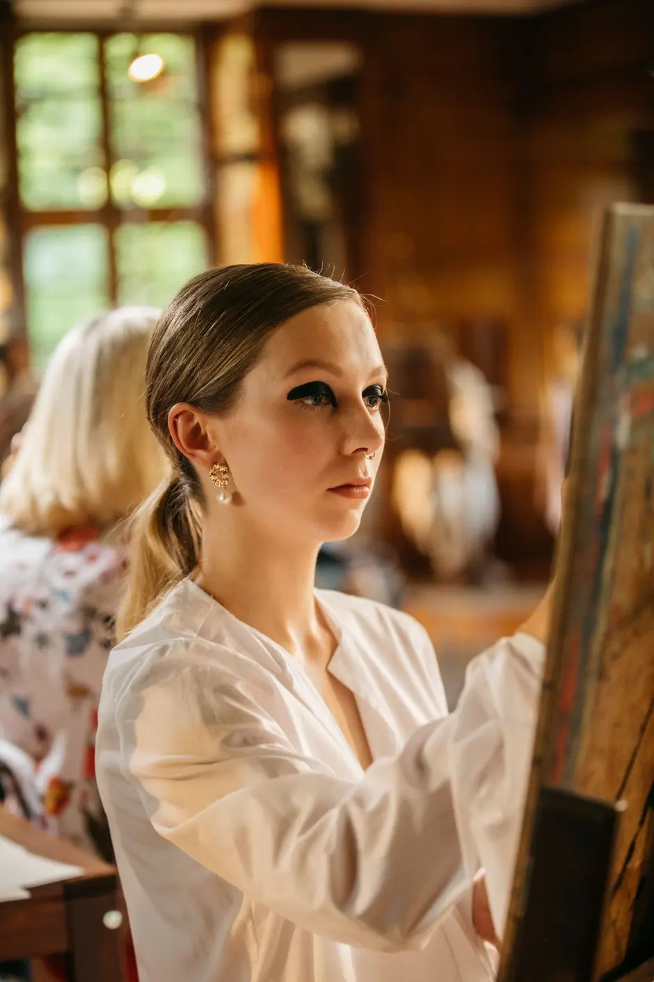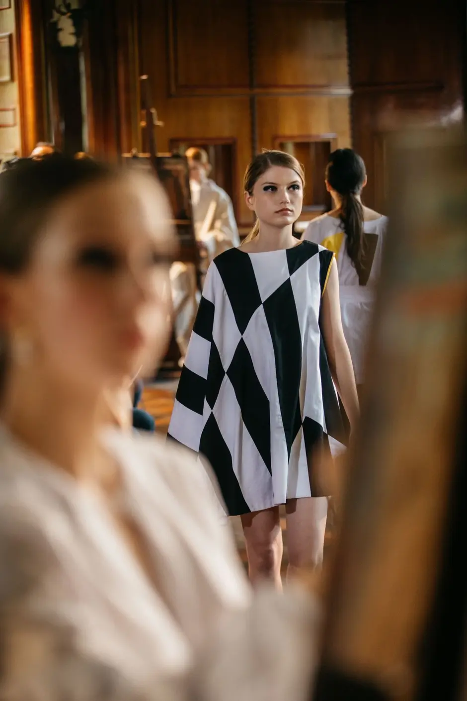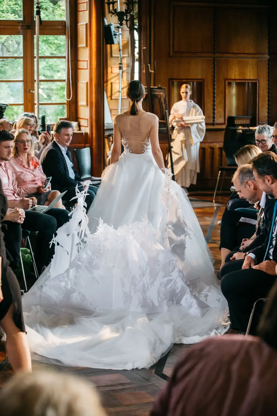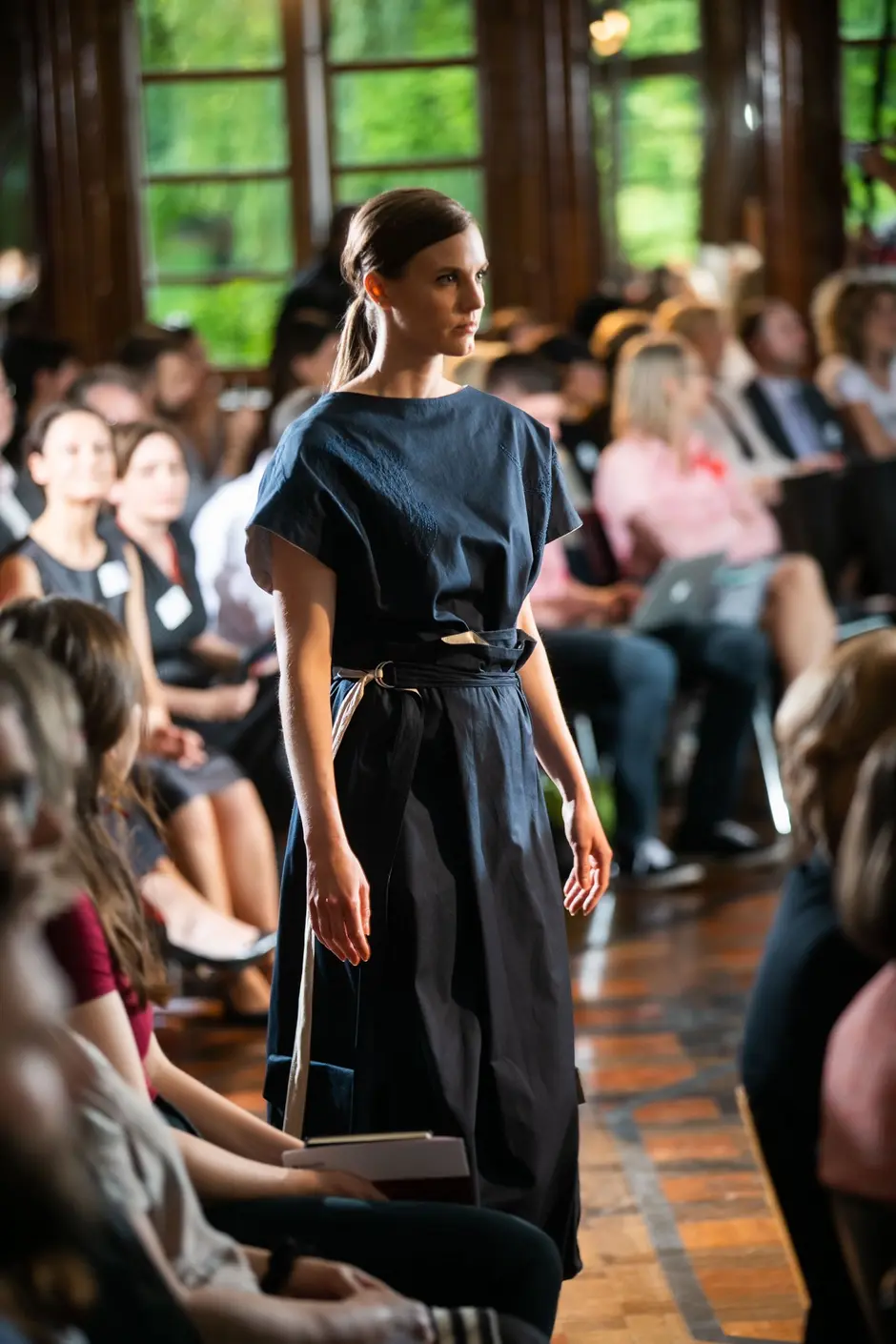 Es ertönte klassische Musik und Modedesignstudentinnen in weißen Kimonos betreten den Laufsteg. Sie trugen Zeichenblöcke unter den Armen und begann in den nächsten 35 Minuten freihand zu zeichnen, während sie sich von der Modenschau, von der Musik und der Atmosphäre inspirieren ließen. Es ist erstaunlich, was sie mit einem Blatt Papier, ein paar Stiften und ein paar Minuten Zeit alles einfangen. Ein paar Striche und Konturen zeichnen sich ab, ein paar Schattierungen bestimmen den Faltenwurf, ein paar Akzente machen den Feinschliff aus. Die Farben geben Einblick in die Fantasie der Designer. Ein lebendiges Bild ist entstanden. Es ist der Entwurf eines blauen Poncho-ähnlichen Überwurfs. Während sie malen, laufen Models durch den Spiegelsaal der Burg Namedy und präsentierten die innovativen Modekollektionen.