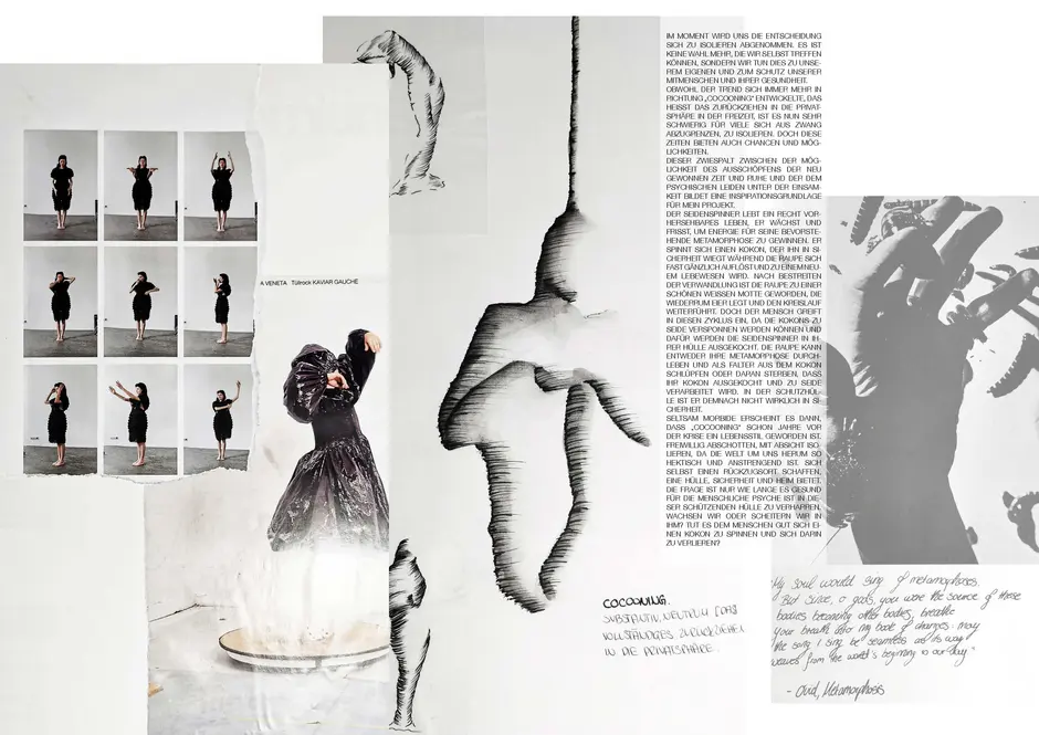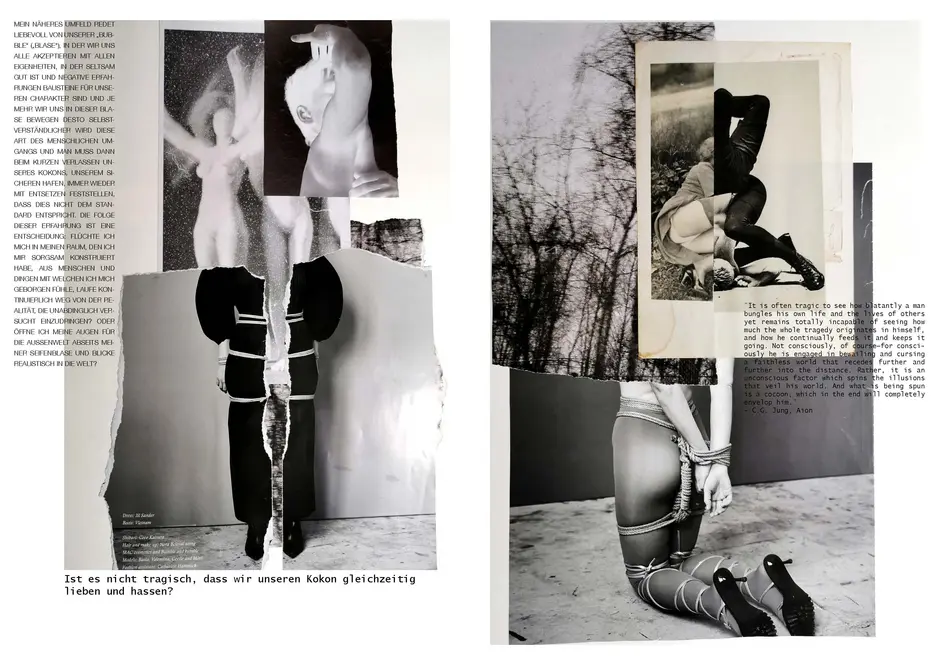 Wir flüchten uns in einen Raum, der nicht unbedingt physischer Raum sein muss, in dem wir das Gefühl von Sicherheit spüren. In dem die Negativität in unserem Umfeld nicht eindringen kann. Sicher, behütet, jedoch gleichzeitig auch abgeschottet, realitätsfern. Wir beklagen und verfluchen die Welt um uns herum, die immer weiter in die Ferne rückt. Es ist keine bewusste Handlung, sondern entsteht in unserem Unterbewusstsein. Wir spinnen eine Illusion wie einen Faden, der sich nach und nach zu einem Kokon verknüpft, der uns vollständig umhüllt und aus dessen inneren heraus die Welt nicht mehr klar wahrzunehmen ist.