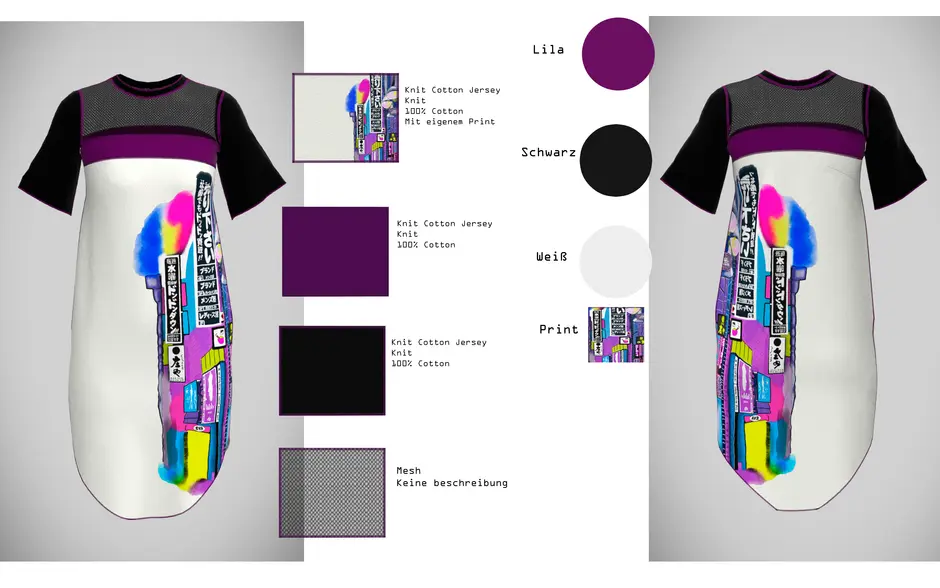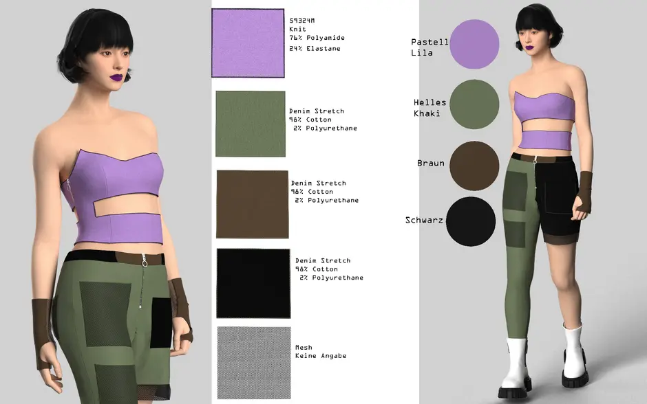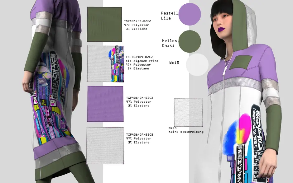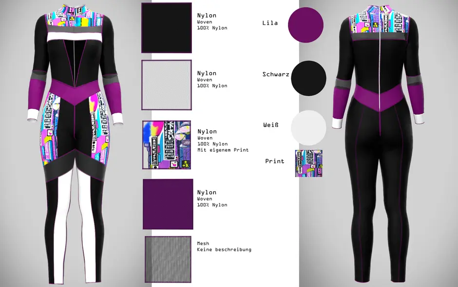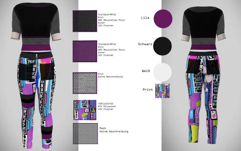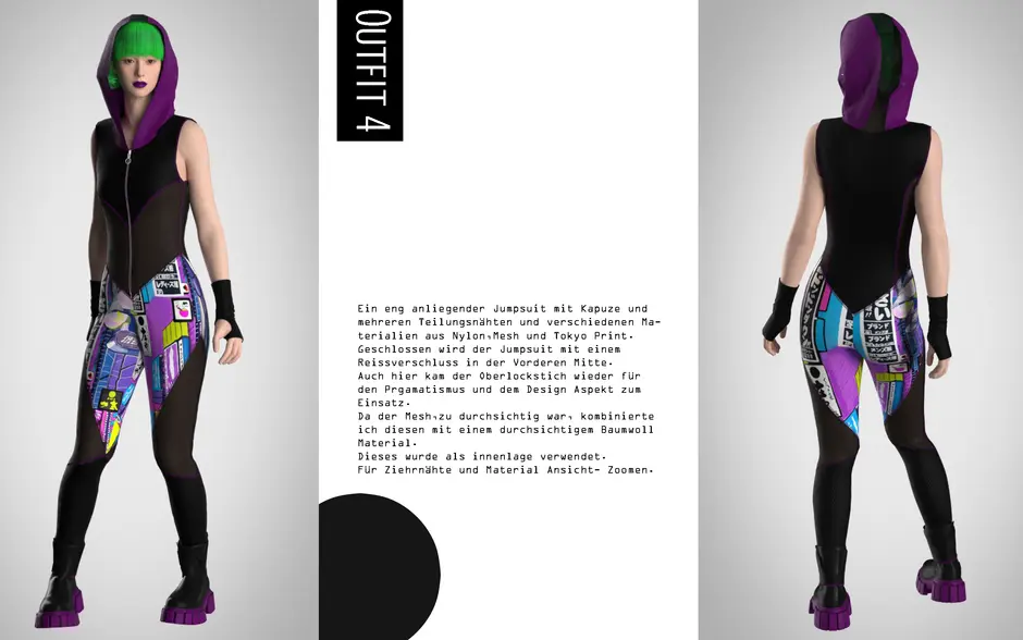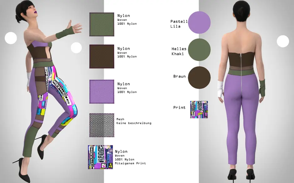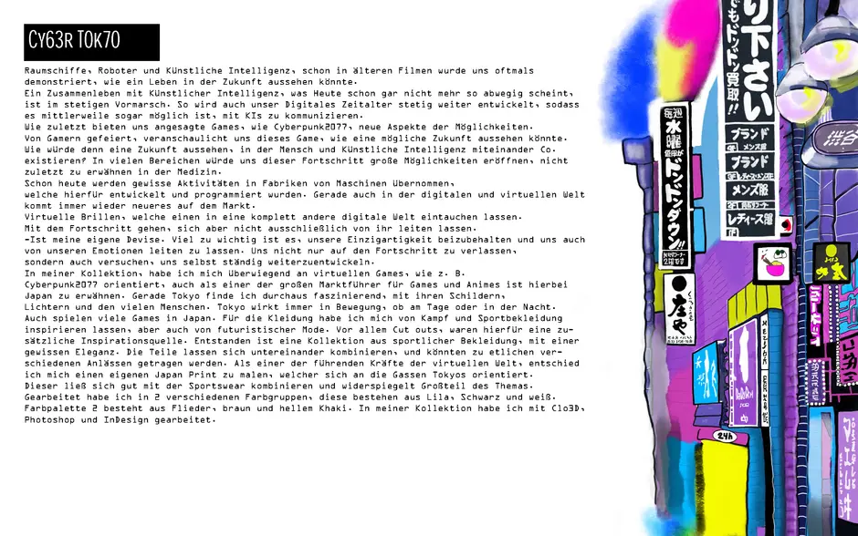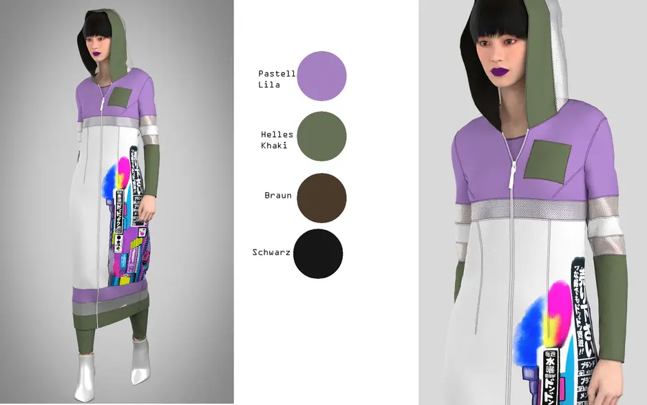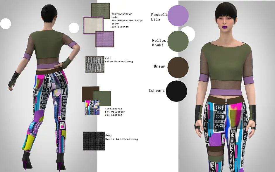 Auch spielen viele Games in Japan. Für die Kleidung habe ich mich von Kampf und Sportbekleidung inspirieren lassen, aber auch von futuristischer Mode. Vor allem Cut outs, waren hierfür eine zusätzliche Inspirationsquelle. Entstanden ist eine Kollektion aus sportlicher Bekleidung, mit einer gewissen Eleganz. Die Teile lassen sich untereinander kombinieren, und könnten zu etlichen verschiedenen Anlässen getragen werden. Als einer der führenden Kräfte der virtuellen Welt, entschied ich mich einen eigenen Japan Print zu malen, welcher sich an die Gassen Tokyos orientiert. Dieser ließ sich gut mit der Sportswear kombinieren und widerspiegelt Großteil des Themas.Gearbeitet habe ich in 2 verschiedenen Farbgruppen, diese bestehen aus Lila, Schwarz und weiß. Farbpalette 2 besteht aus Flieder, braun und hellem Khaki. In meiner Kollektion habe ich mit Clo3D, Photoshop und InDesign gearbeitet.