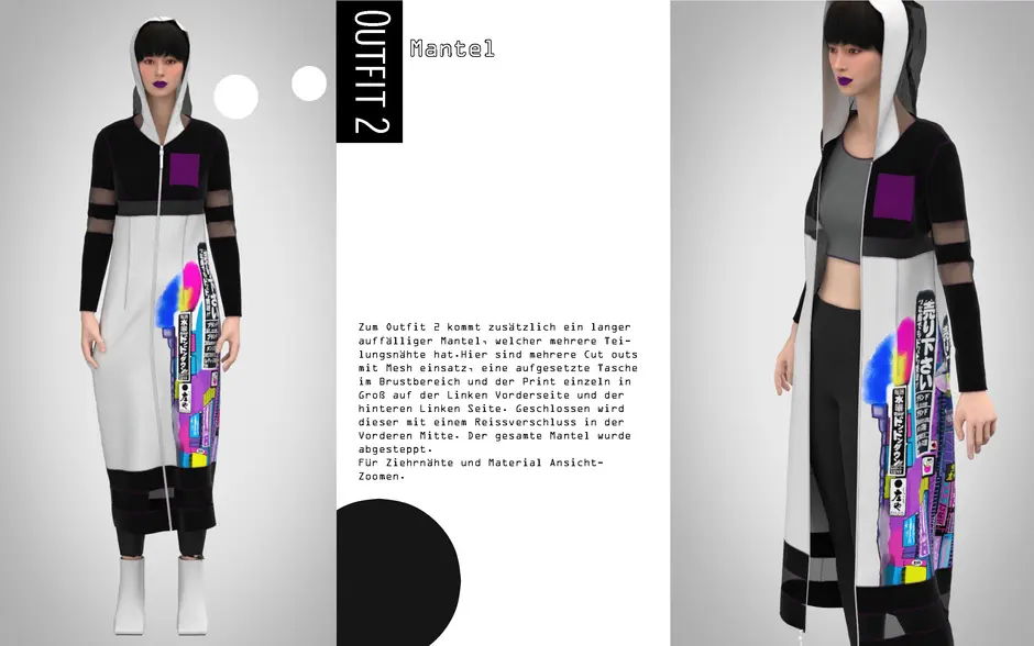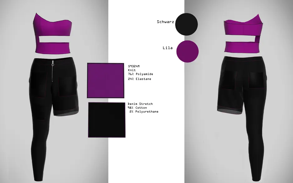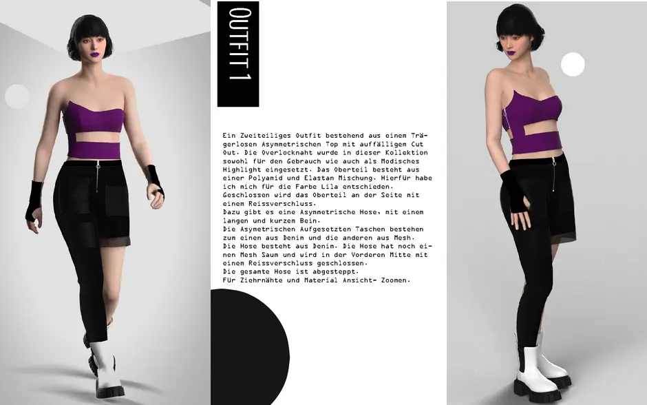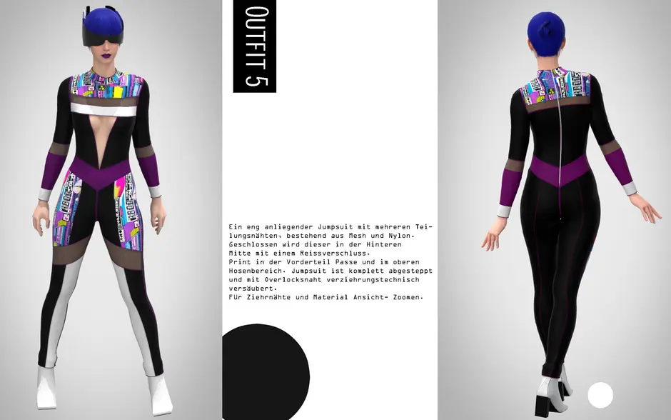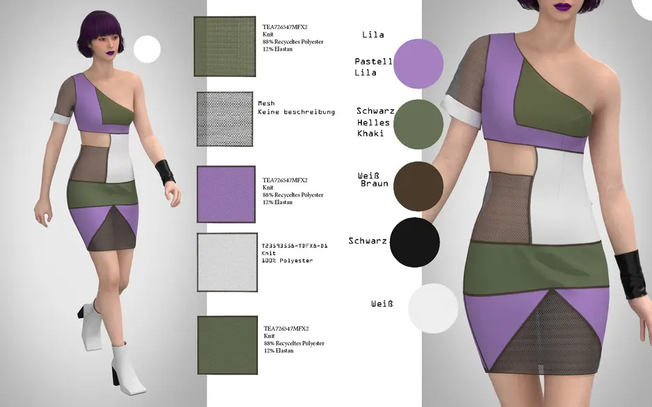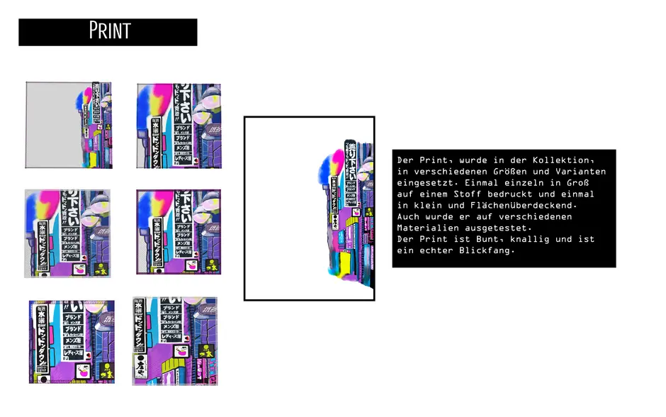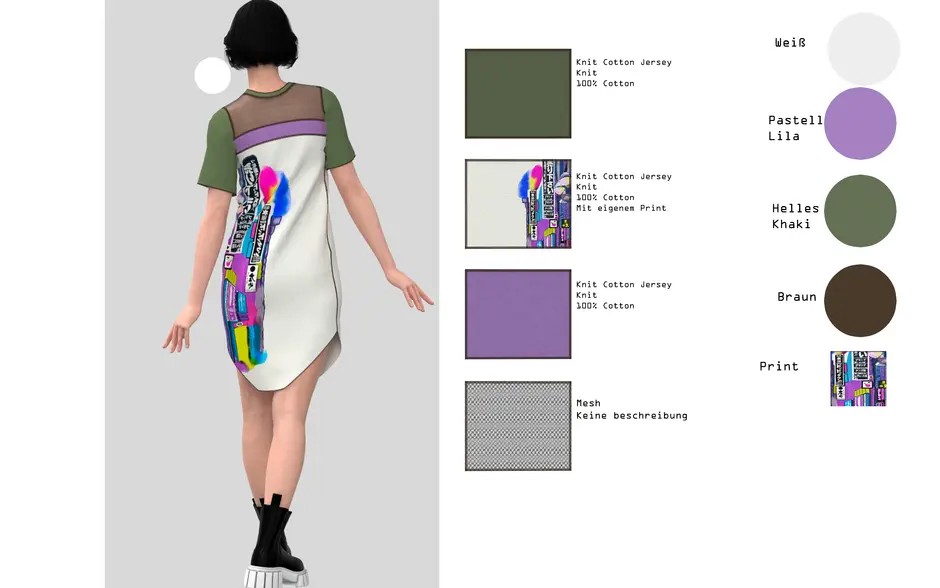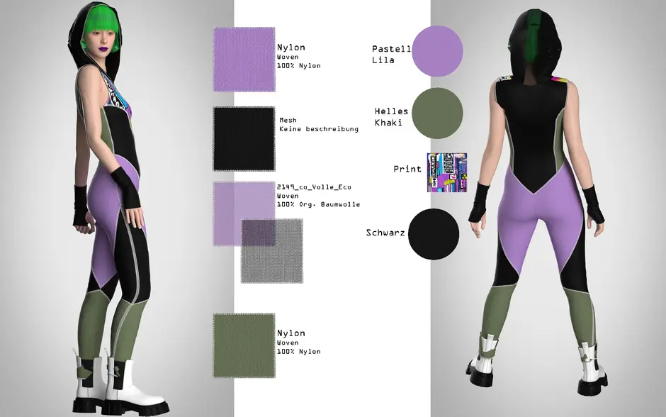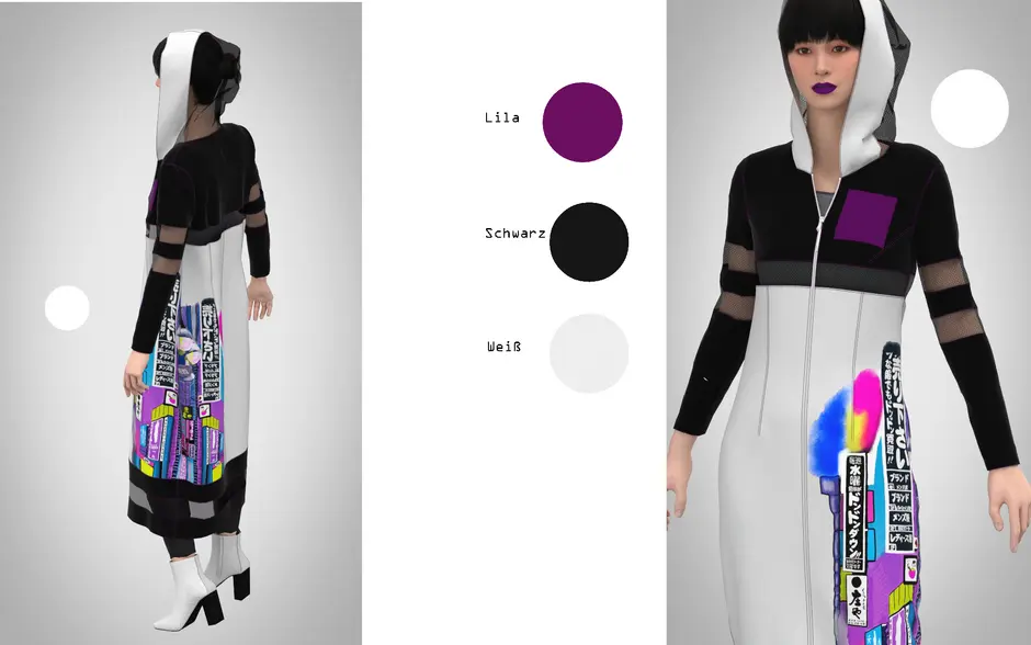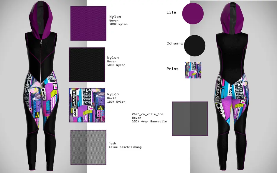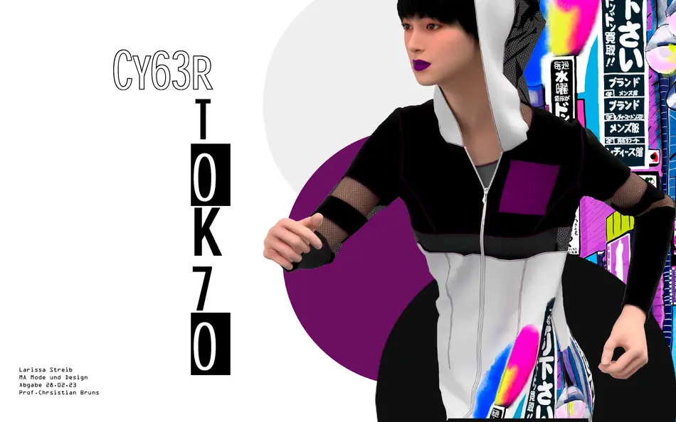 Auch spielen viele Games in Japan. Für die Kleidung habe ich mich von Kampf und Sportbekleidung inspirieren lassen, aber auch von futuristischer Mode. Vor allem Cut outs, waren hierfür eine zusätzliche Inspirationsquelle. Entstanden ist eine Kollektion aus sportlicher Bekleidung, mit einer gewissen Eleganz. Die Teile lassen sich untereinander kombinieren, und könnten zu etlichen verschiedenen Anlässen getragen werden. Als einer der führenden Kräfte der virtuellen Welt, entschied ich mich einen eigenen Japan Print zu malen, welcher sich an die Gassen Tokyos orientiert. Dieser ließ sich gut mit der Sportswear kombinieren und widerspiegelt Großteil des Themas.Gearbeitet habe ich in 2 verschiedenen Farbgruppen, diese bestehen aus Lila, Schwarz und weiß. Farbpalette 2 besteht aus Flieder, braun und hellem Khaki. In meiner Kollektion habe ich mit Clo3D, Photoshop und InDesign gearbeitet.