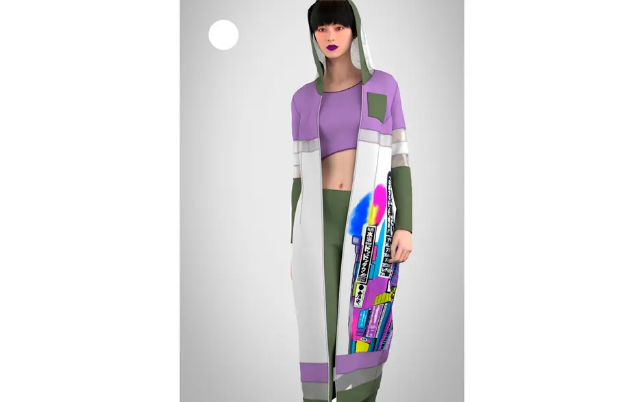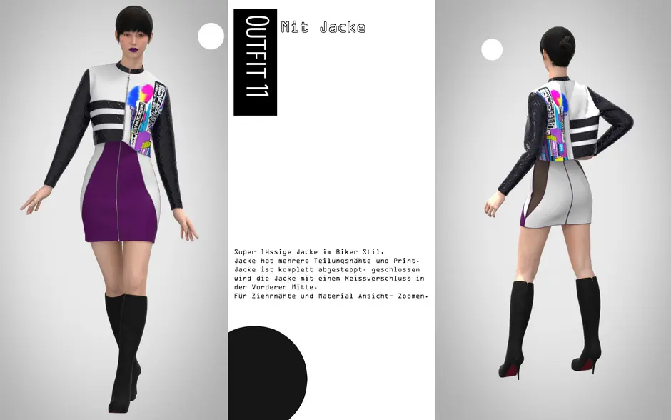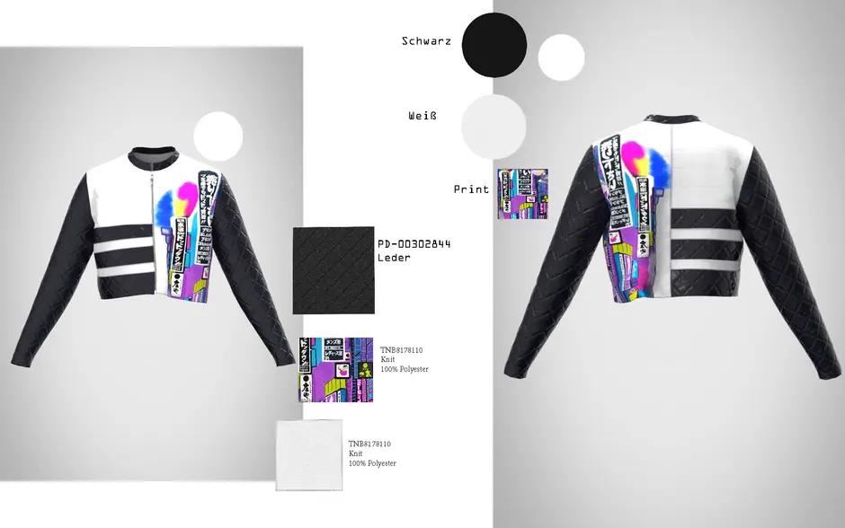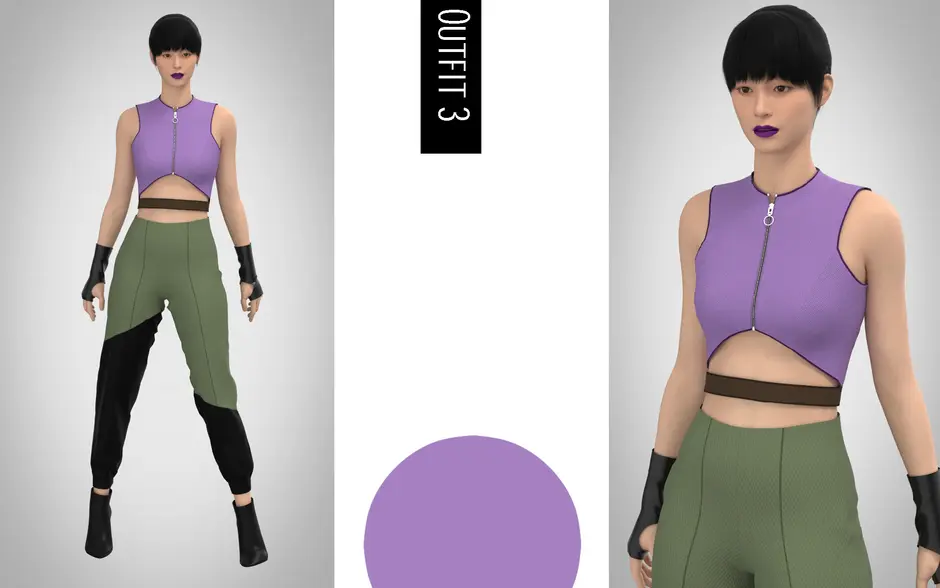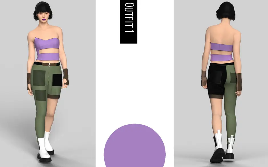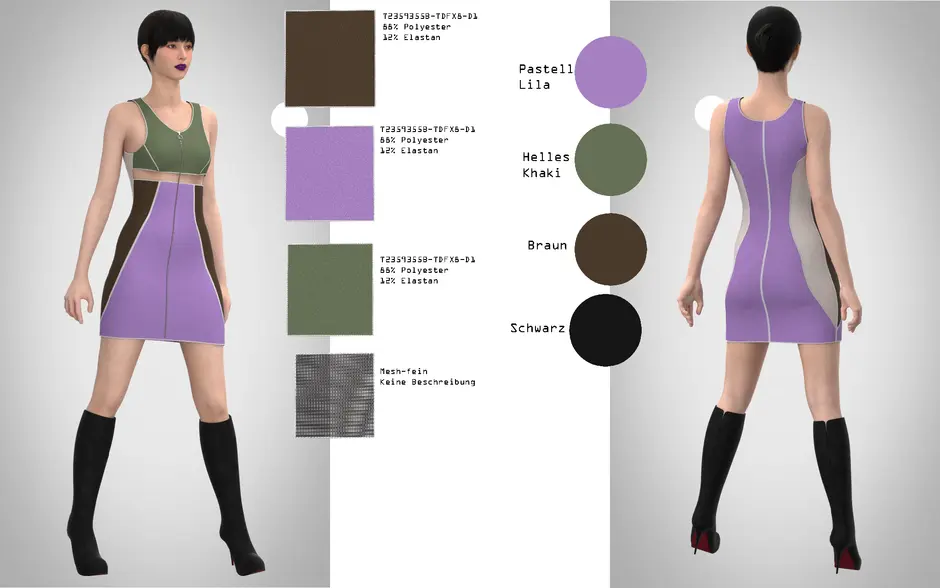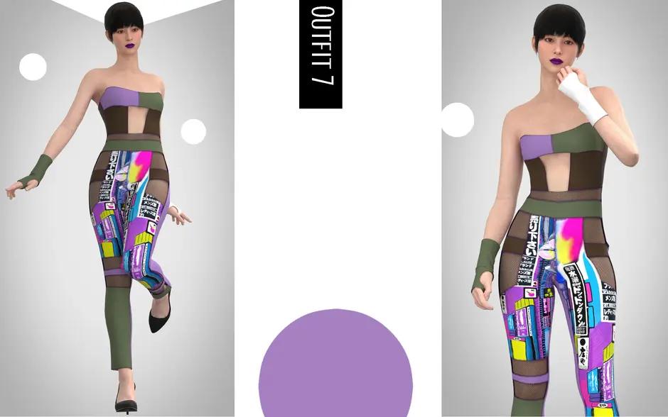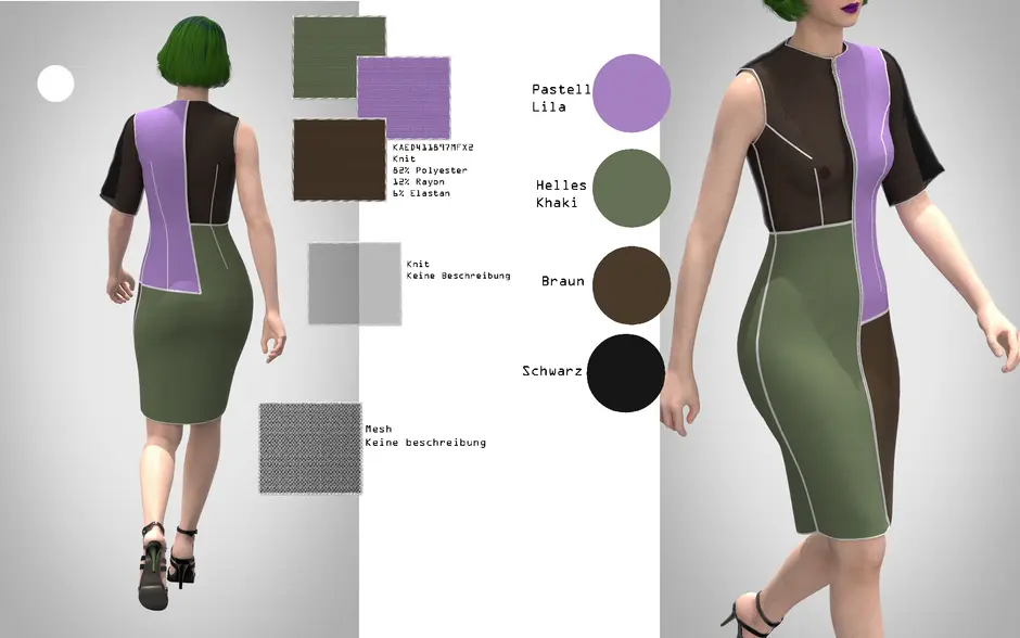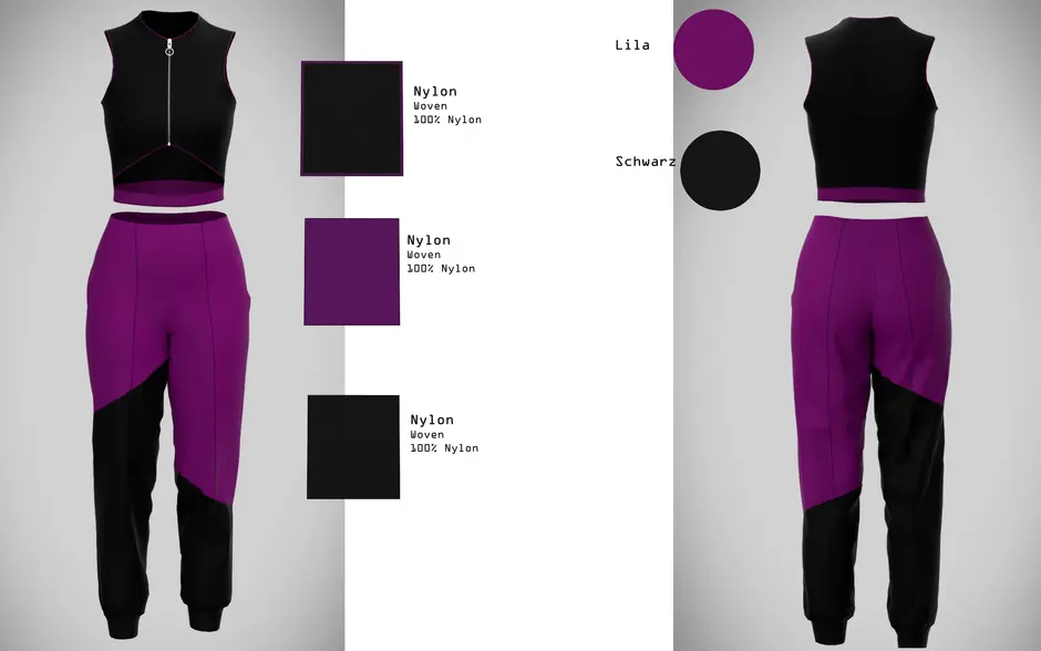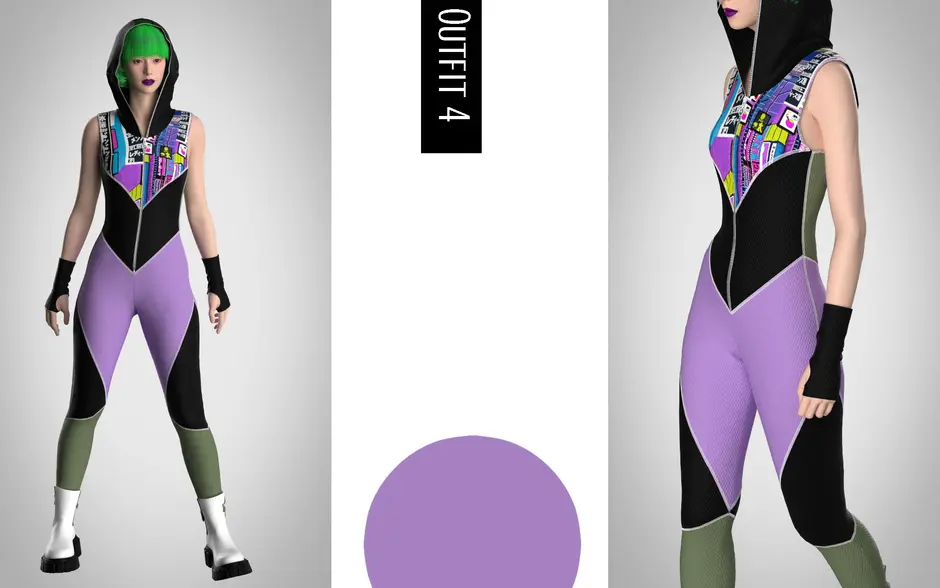 Auch spielen viele Games in Japan. Für die Kleidung habe ich mich von Kampf und Sportbekleidung inspirieren lassen, aber auch von futuristischer Mode. Vor allem Cut outs, waren hierfür eine zusätzliche Inspirationsquelle. Entstanden ist eine Kollektion aus sportlicher Bekleidung, mit einer gewissen Eleganz. Die Teile lassen sich untereinander kombinieren, und könnten zu etlichen verschiedenen Anlässen getragen werden. Als einer der führenden Kräfte der virtuellen Welt, entschied ich mich einen eigenen Japan Print zu malen, welcher sich an die Gassen Tokyos orientiert. Dieser ließ sich gut mit der Sportswear kombinieren und widerspiegelt Großteil des Themas.Gearbeitet habe ich in 2 verschiedenen Farbgruppen, diese bestehen aus Lila, Schwarz und weiß. Farbpalette 2 besteht aus Flieder, braun und hellem Khaki. In meiner Kollektion habe ich mit Clo3D, Photoshop und InDesign gearbeitet.