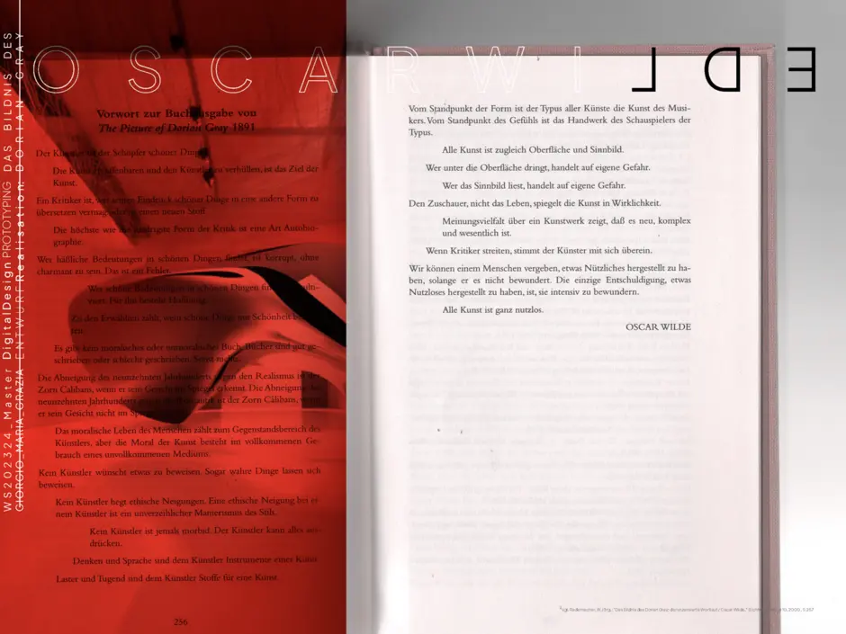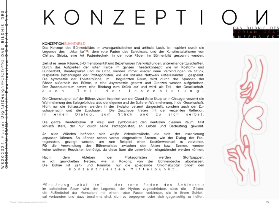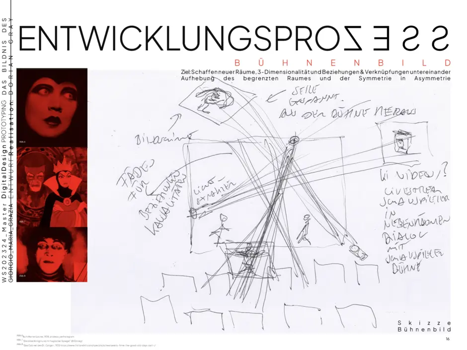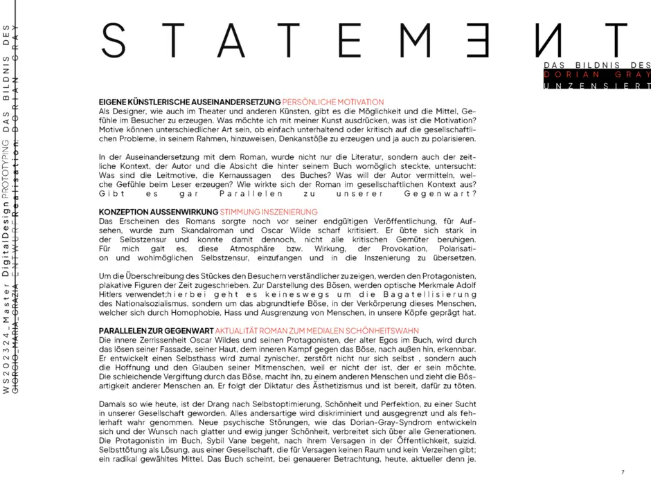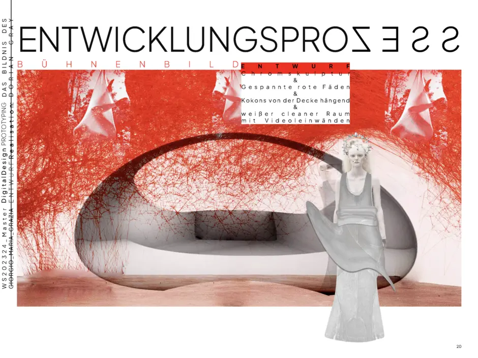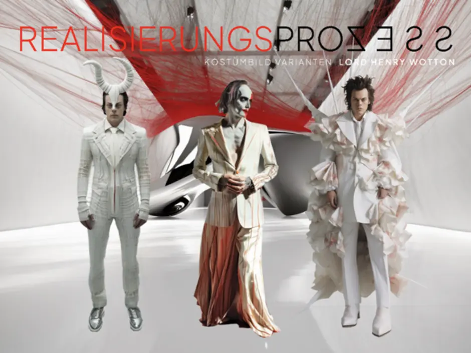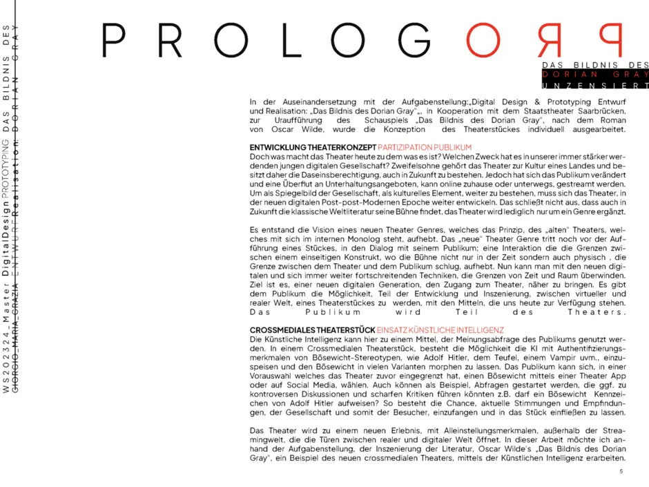 In der Auseinandersetzung mit der Aufgabenstellung:„Digital Design & Prototyping Entwurf und Realisation: „Das Bildnis des Dorian Gray“„, in Kooperation mit dem Staatstheater Saarbrücken, zur Uraufführung des Schauspiels „Das Bildnis des Dorian Gray“, nach dem Roman von Oscar Wilde, wurde die Konzeption des Theaterstückes individuell ausgearbeitet.