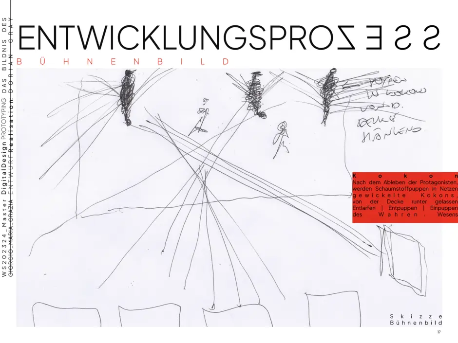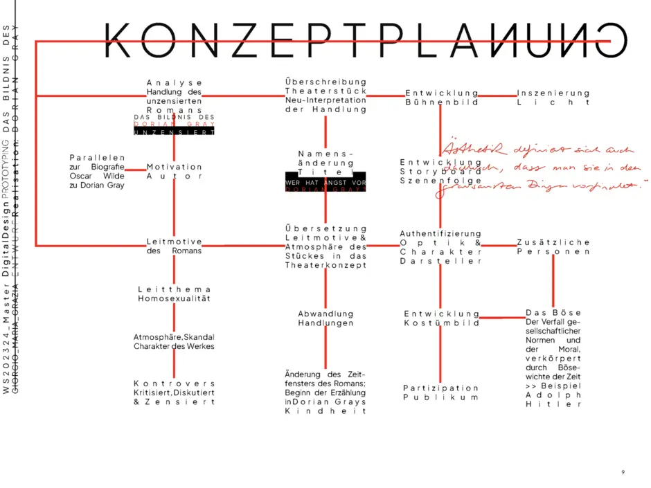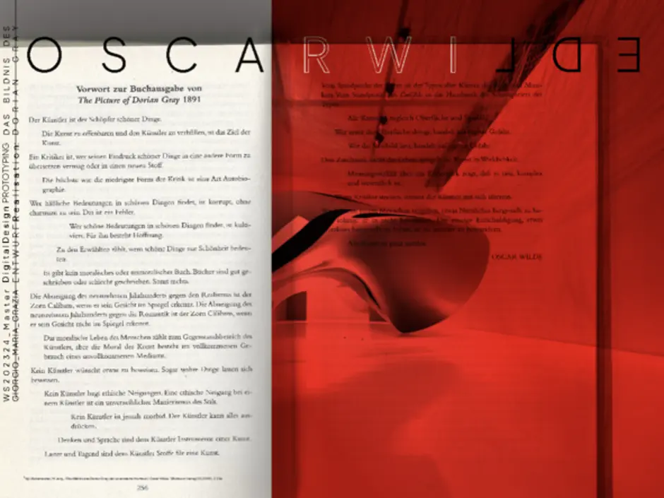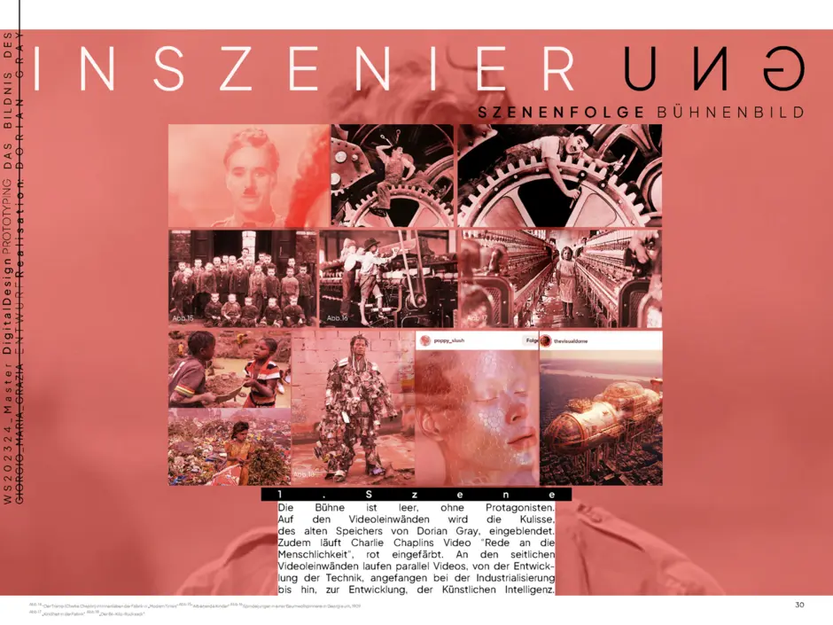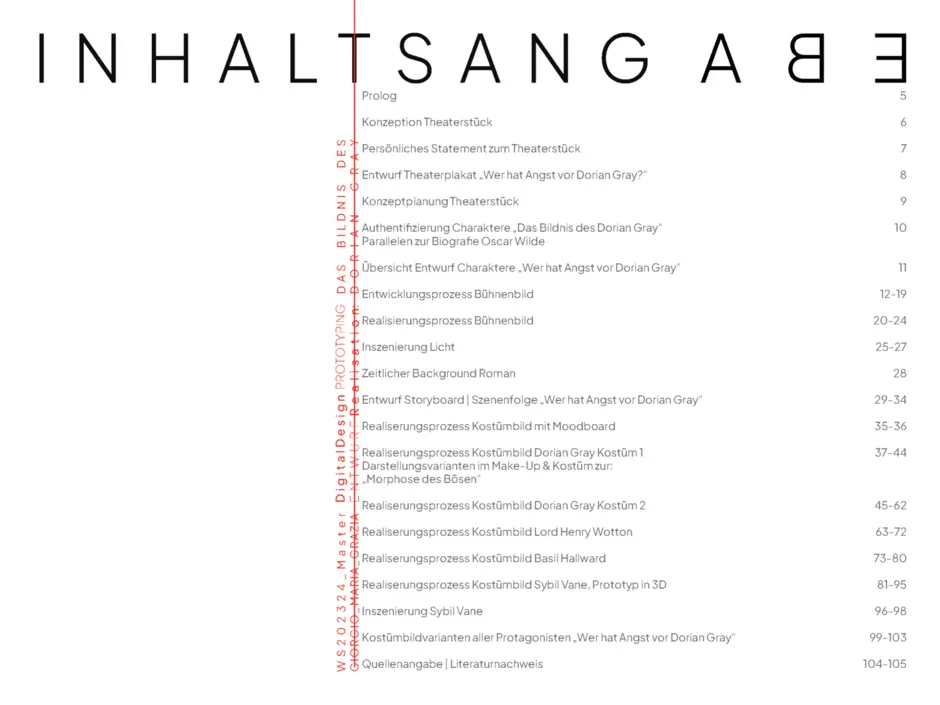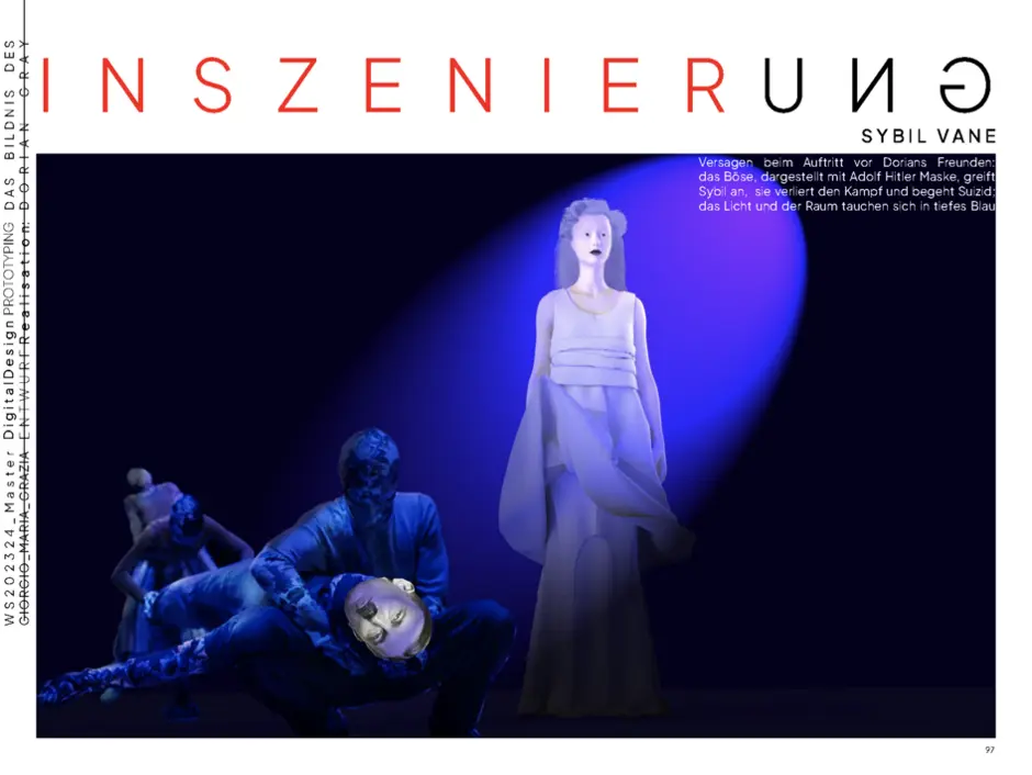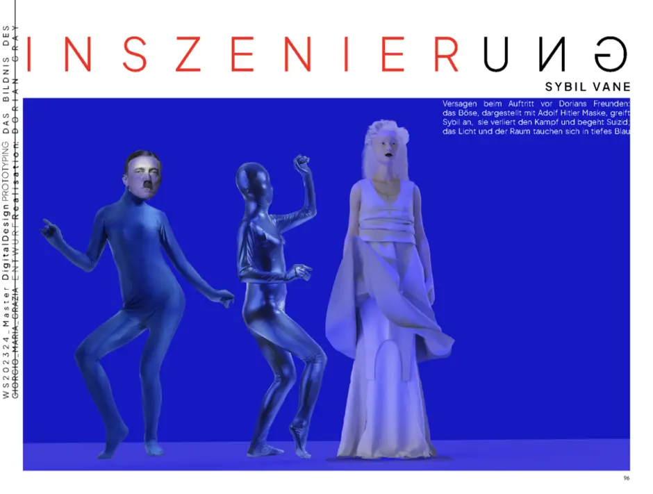 In der Auseinandersetzung mit der Aufgabenstellung:„Digital Design & Prototyping Entwurf und Realisation: „Das Bildnis des Dorian Gray“„, in Kooperation mit dem Staatstheater Saarbrücken, zur Uraufführung des Schauspiels „Das Bildnis des Dorian Gray“, nach dem Roman von Oscar Wilde, wurde die Konzeption des Theaterstückes individuell ausgearbeitet.