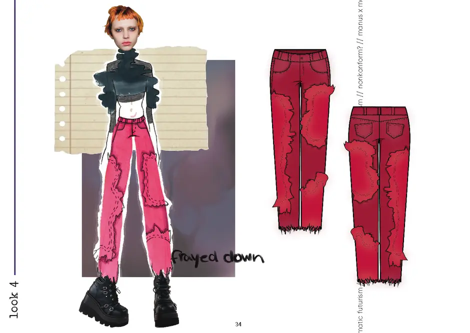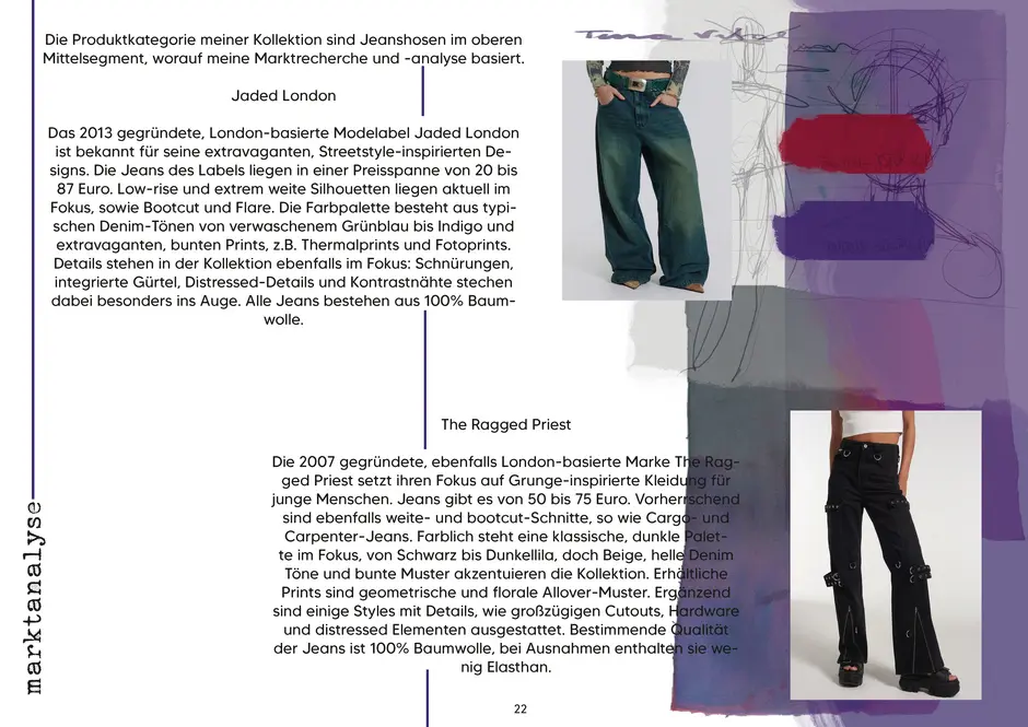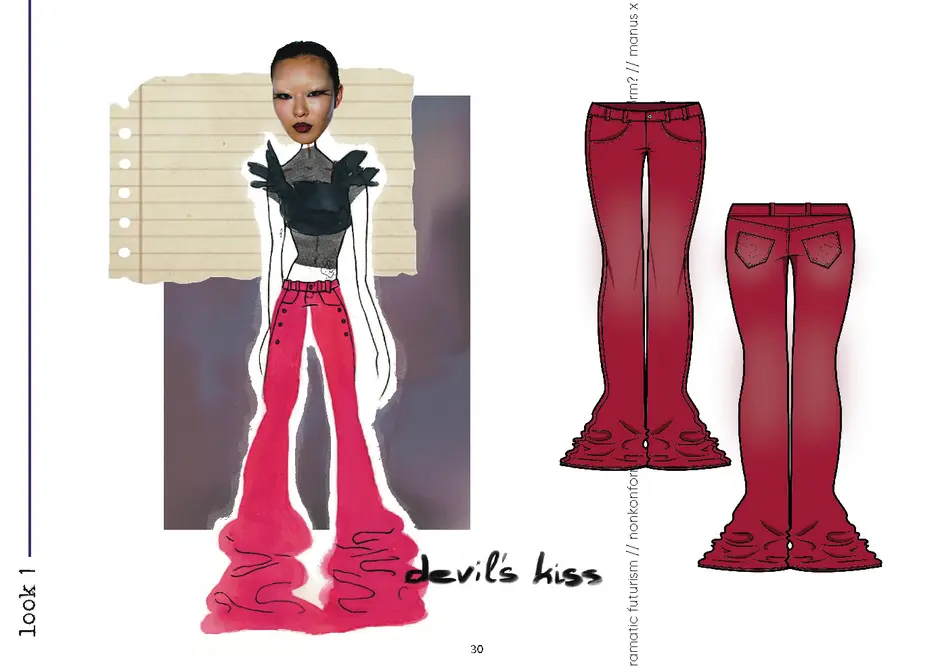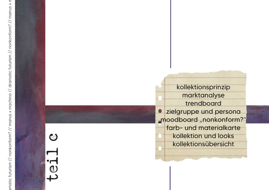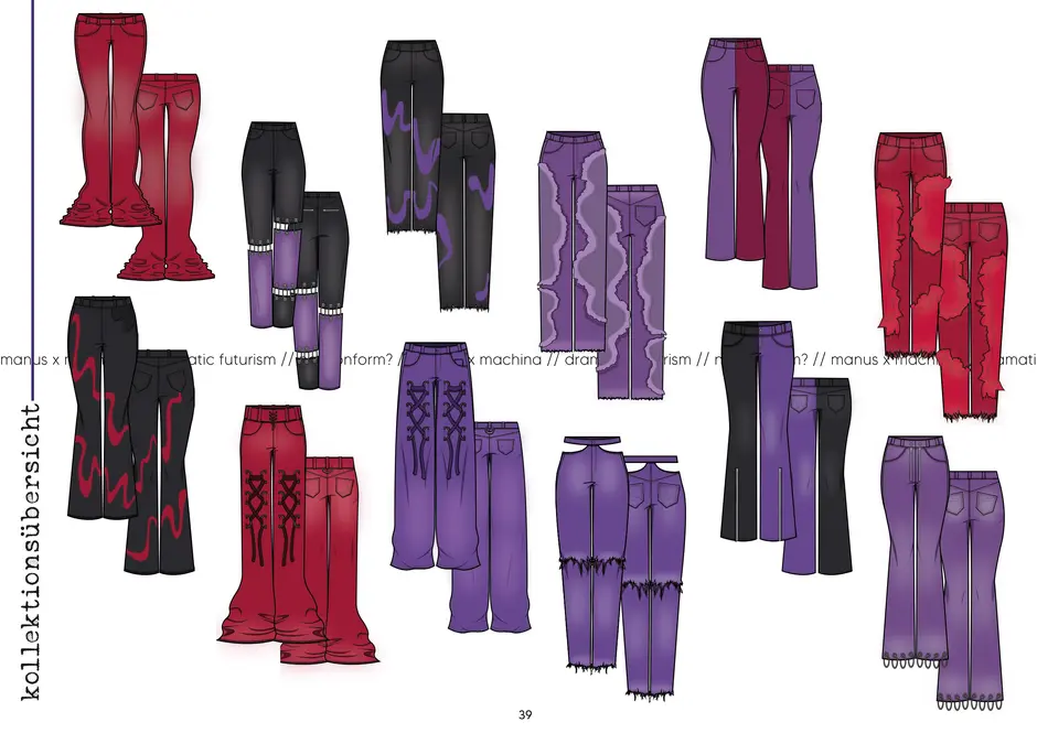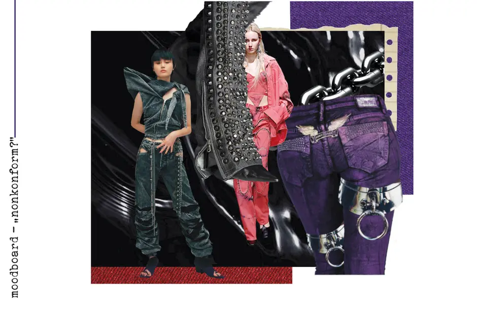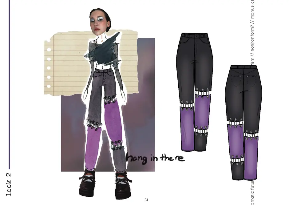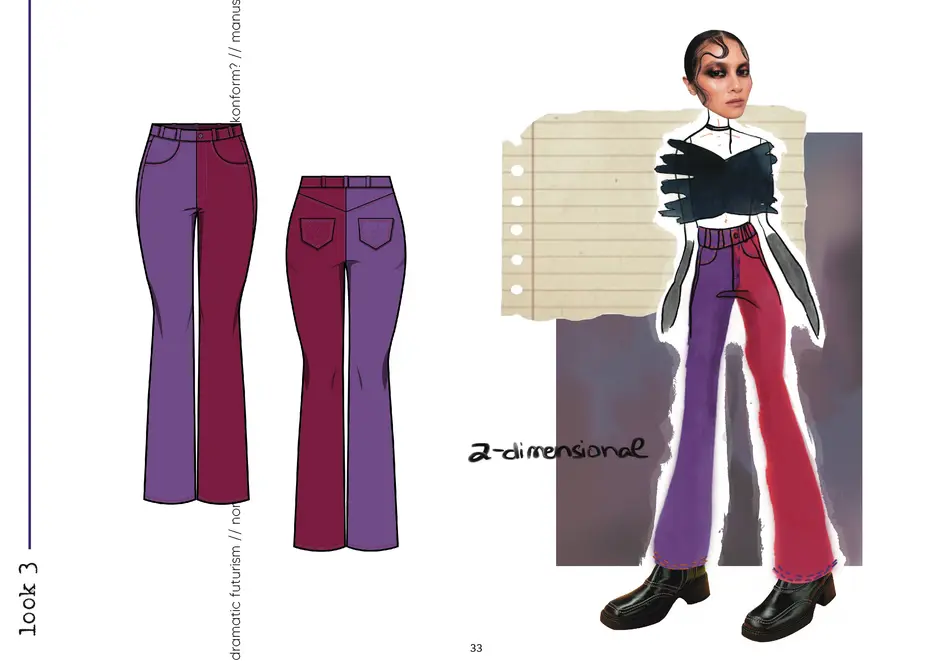 Zusammen mit ausgiebiger Marktanalyse und Trendrecherche entstand im Rahmen des Themas „nonkonform?“ eine Jeanshosen-Kollektion, die Elemente des dreidimensionalen Prototypen beinhaltet und sowohl traditionelle Elemente, als auch progressive Komponenten der Kollektionsgestaltung vereint.