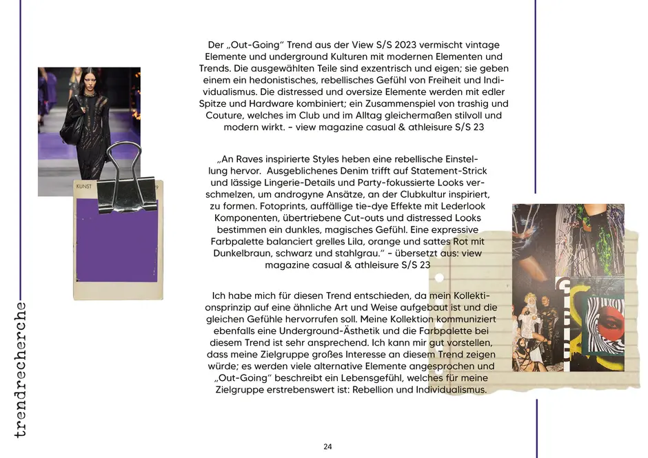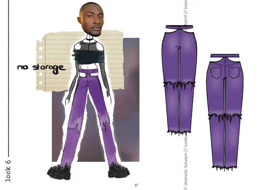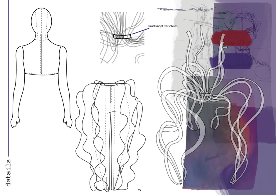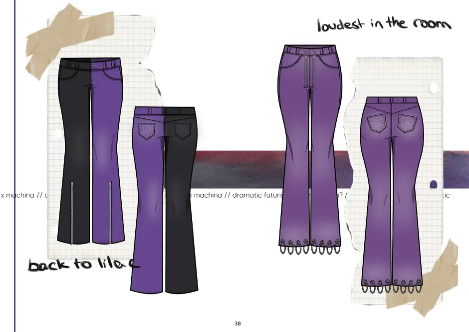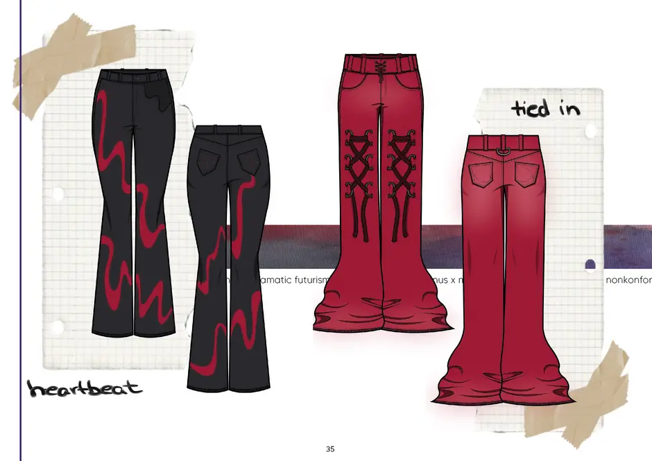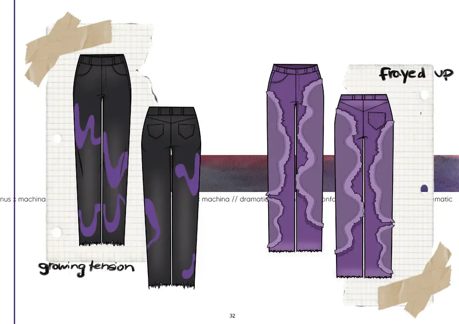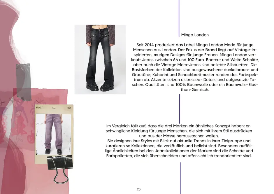 Zusammen mit ausgiebiger Marktanalyse und Trendrecherche entstand im Rahmen des Themas „nonkonform?“ eine Jeanshosen-Kollektion, die Elemente des dreidimensionalen Prototypen beinhaltet und sowohl traditionelle Elemente, als auch progressive Komponenten der Kollektionsgestaltung vereint.