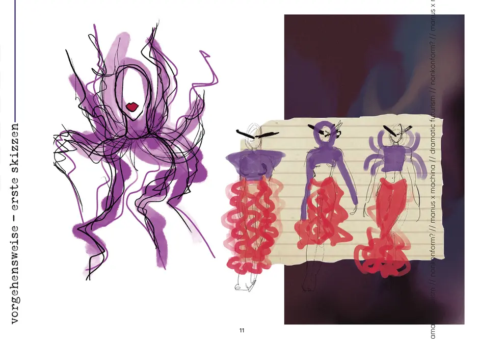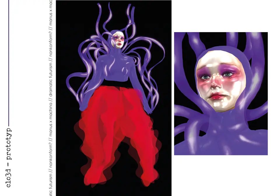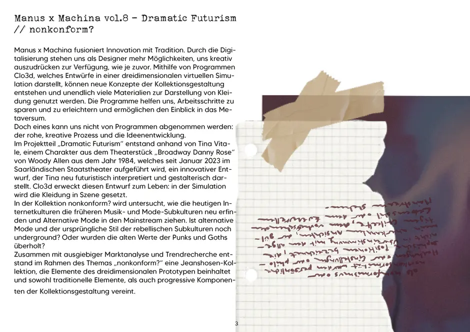 Manus x Machina fusioniert Innovation mit Tradition. Durch die Digitalisierung stehen uns als Designer mehr Möglichkeiten, uns kreativ auszudrücken zur Verfügung, wie je zuvor. Mithilfe von Programmen Clo3d, welches Entwürfe in einer dreidimensionalen virtuellen Simulation darstellt, können neue Konzepte der Kollektionsgestaltung entstehen und unendlich viele Materialien zur Darstellung von Kleidung genutzt werden. Die Programme helfen uns, Arbeitsschritte zu sparen und zu erleichtern und ermöglichen den Einblick in das Metaversum.