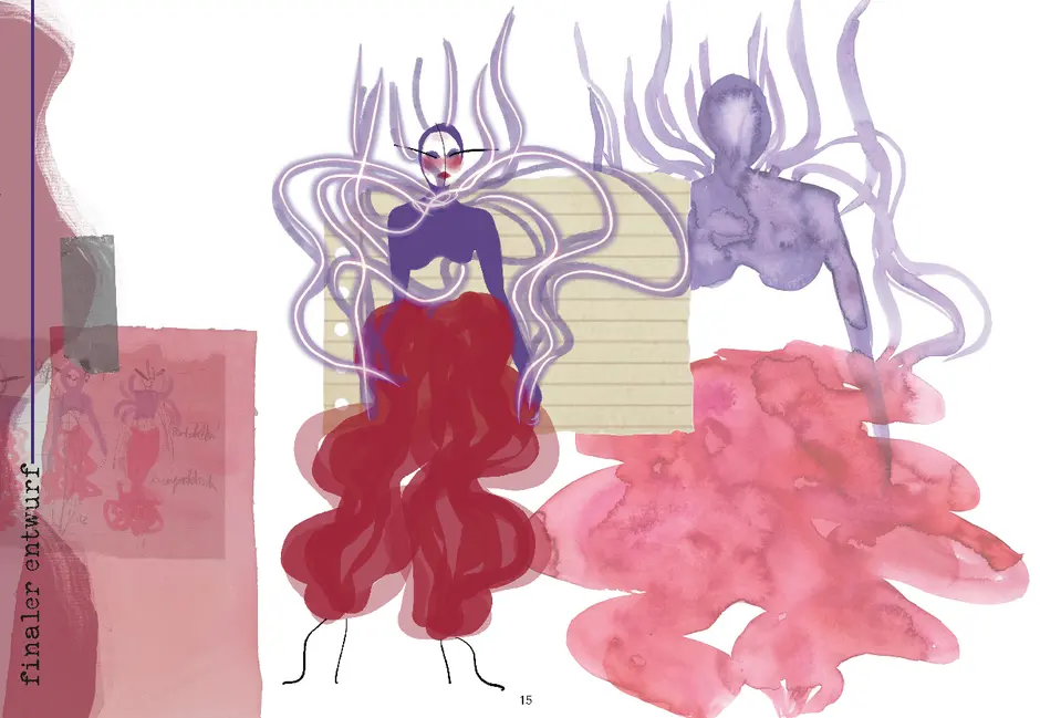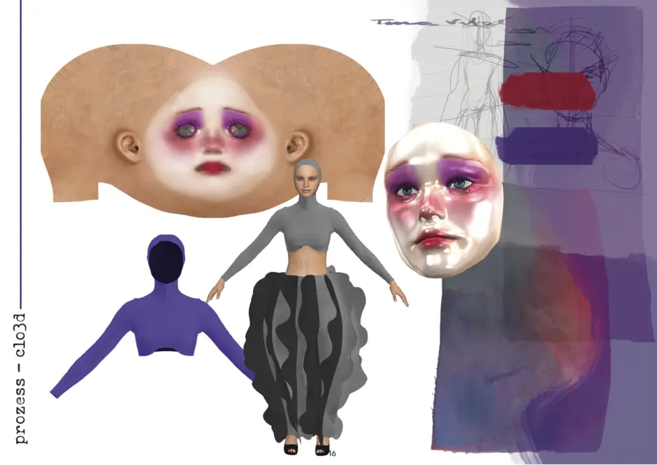 Im Projektteil „Dramatic Futurism“ entstand anhand von Tina Vitale, einem Charakter aus dem Theaterstück „Broadway Danny Rose“ von Woody Allen aus dem Jahr 1984, welches seit Januar 2023 im Saarländischen Staatstheater aufgeführt wird, ein innovativer Entwurf, der Tina neu futuristisch interpretiert und gestalterisch darstellt. Clo3d erweckt diesen Entwurf zum Leben: in der Simulation wird die Kleidung in Szene gesetzt.