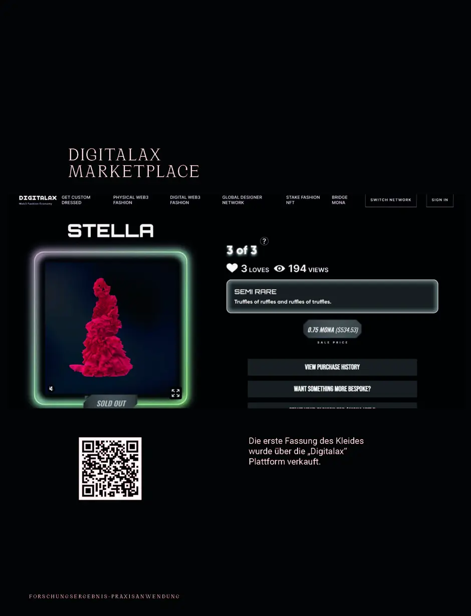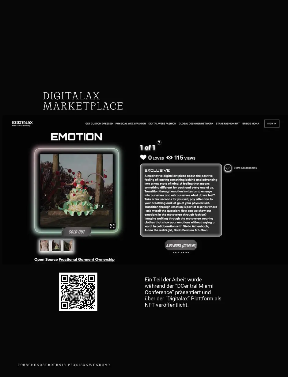 Das dritte Ziel dieser Masterthesis ist es, eine Plattform zu finden, durch die erstellte digitale Mode auch vertrieben werden kann, damit die Studienergebnisse einen Nutzen finden und so eine Grundlage geschaffen ist, um zukünftige Kollektionen zu kreieren, die die Kommunikation der digitalen Identitäten und somit von Emotionen im Metaversum erleichtern soll.