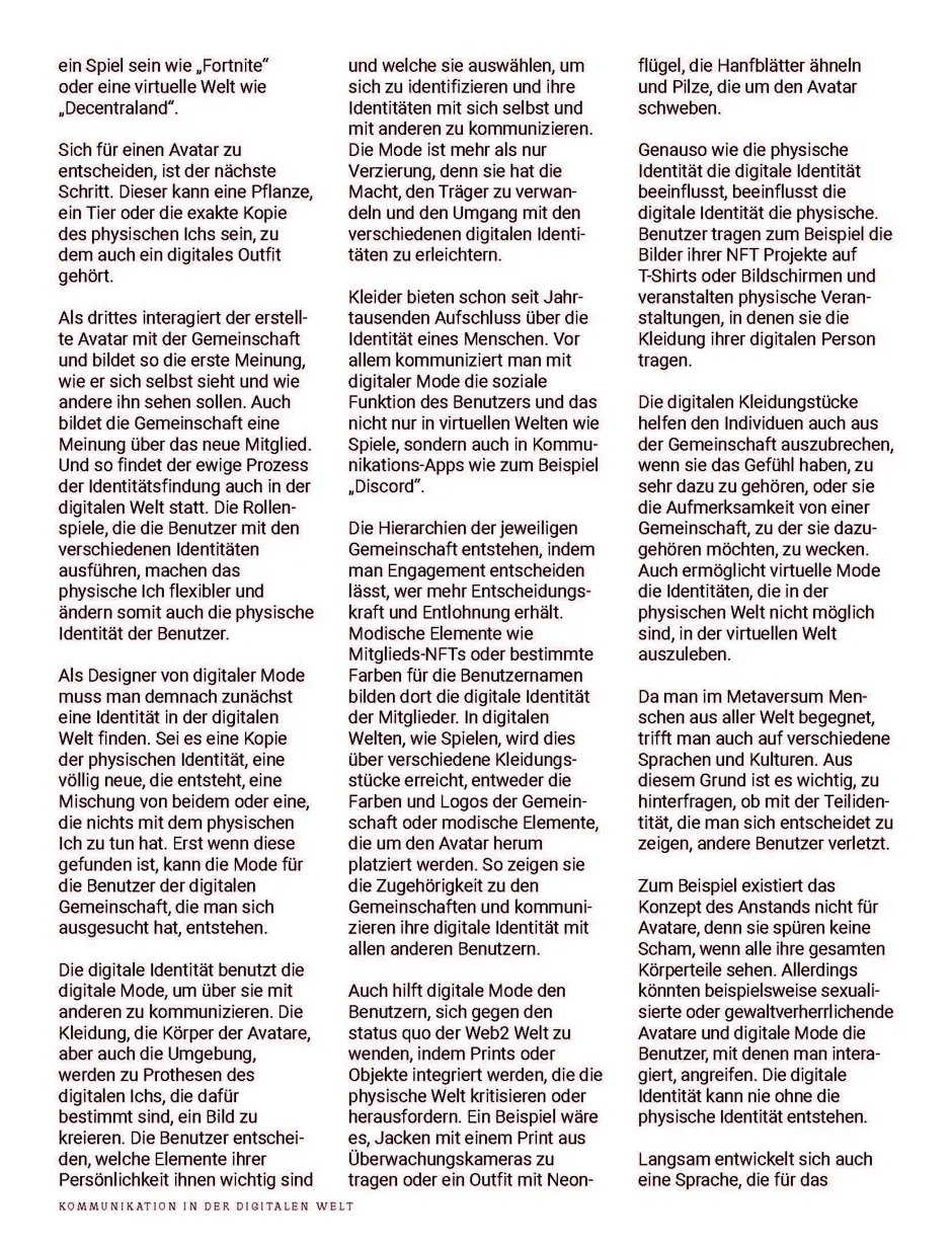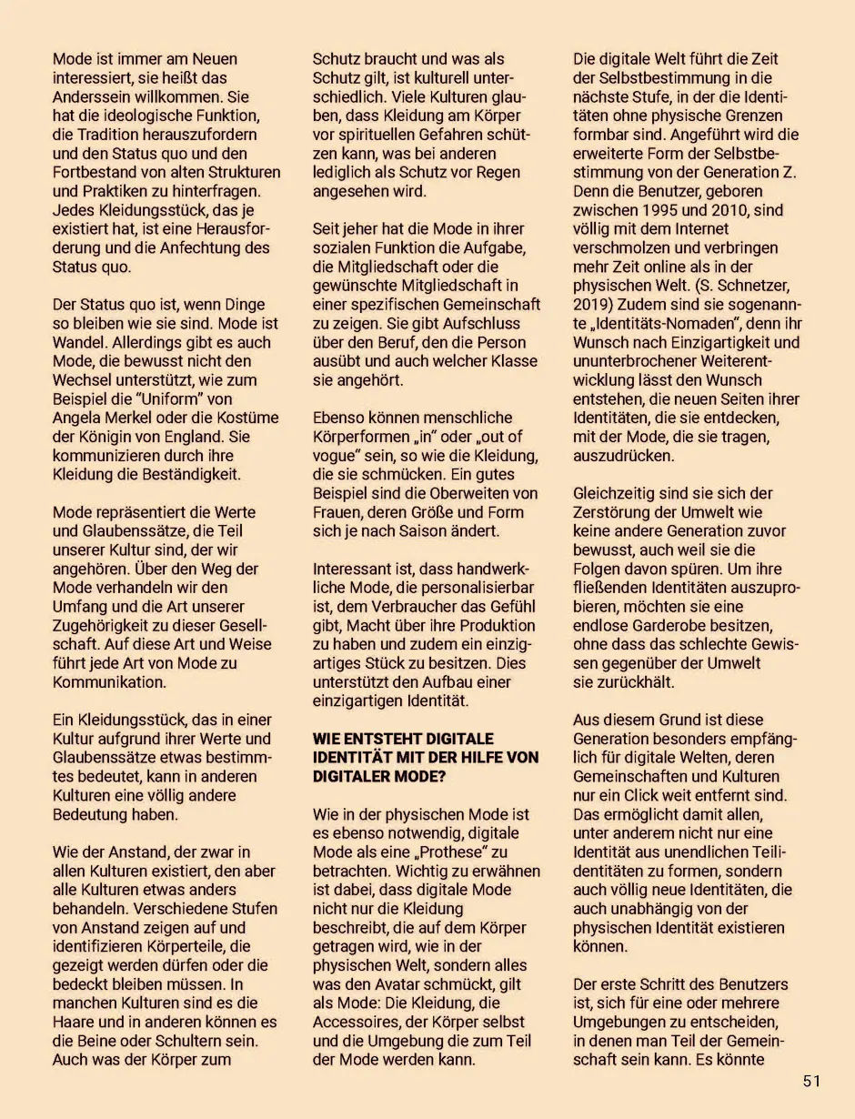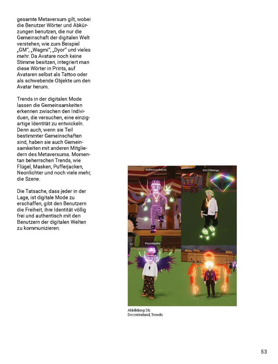 Seit 2020, und vor allem wegen der Covid-19-Pandemie, nahmen Benutzer virtuelle Welten wie noch nie zuvor in Anspruch. Spiele wie „animal crossing“ oder virtuelle Länder wie „Roblox“, die auch mit „Virtual Reality“-Brillen erlebbar sind, erreichten eine sehr hohe Anzahl an Besuchern. Zum ersten Mal ist es Modedesignern bewusst geworden, wie wichtig digitale Mode für die Identität der Spieler ist. Je mehr Welten entstehen und je mehr sie miteinander verbunden sind, haben die Benutzer die Möglichkeit, ihre digitalen Identitäten zu entwickeln.